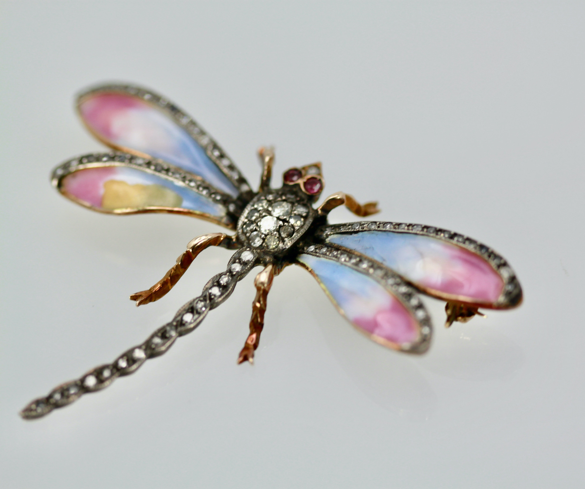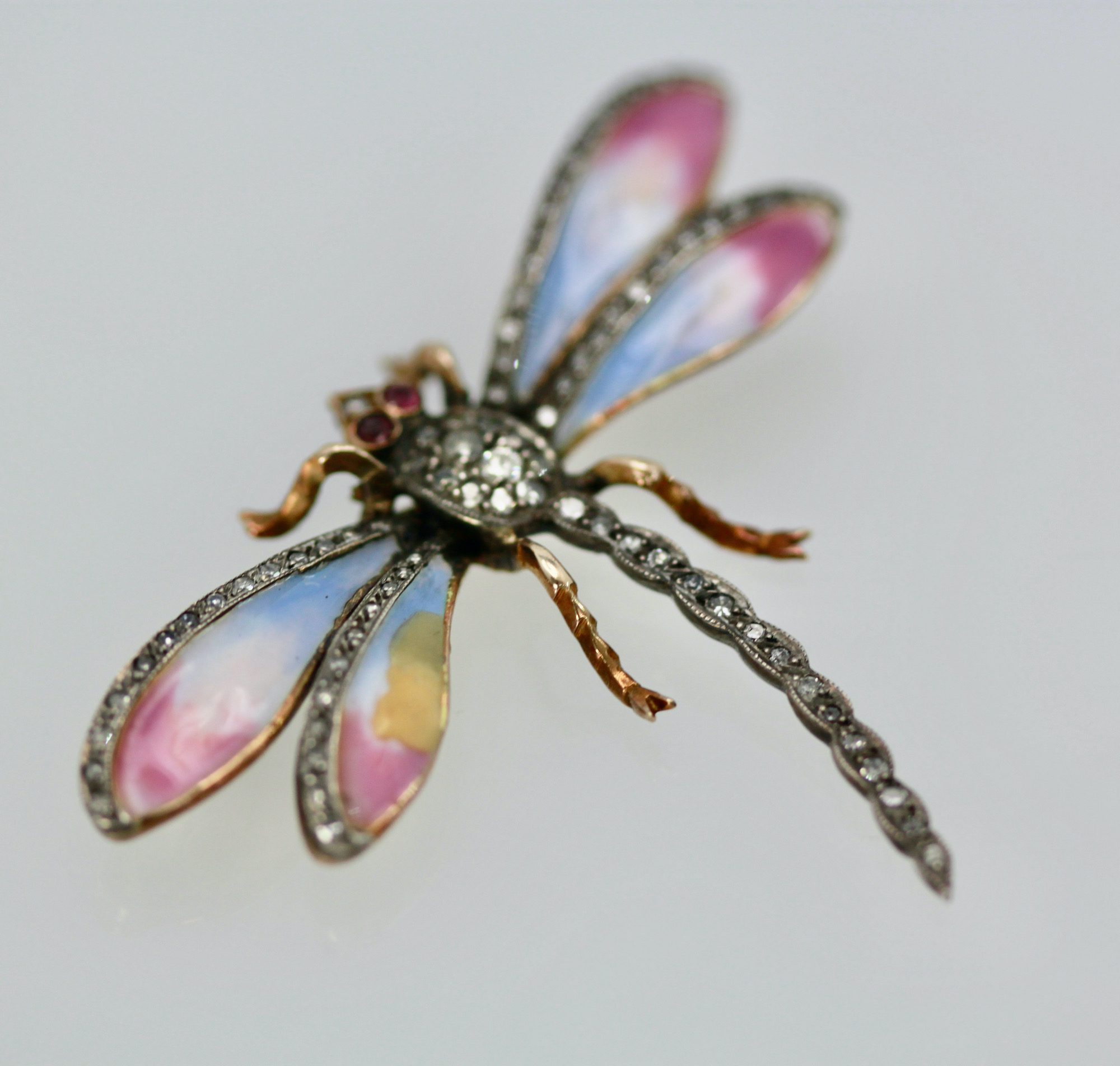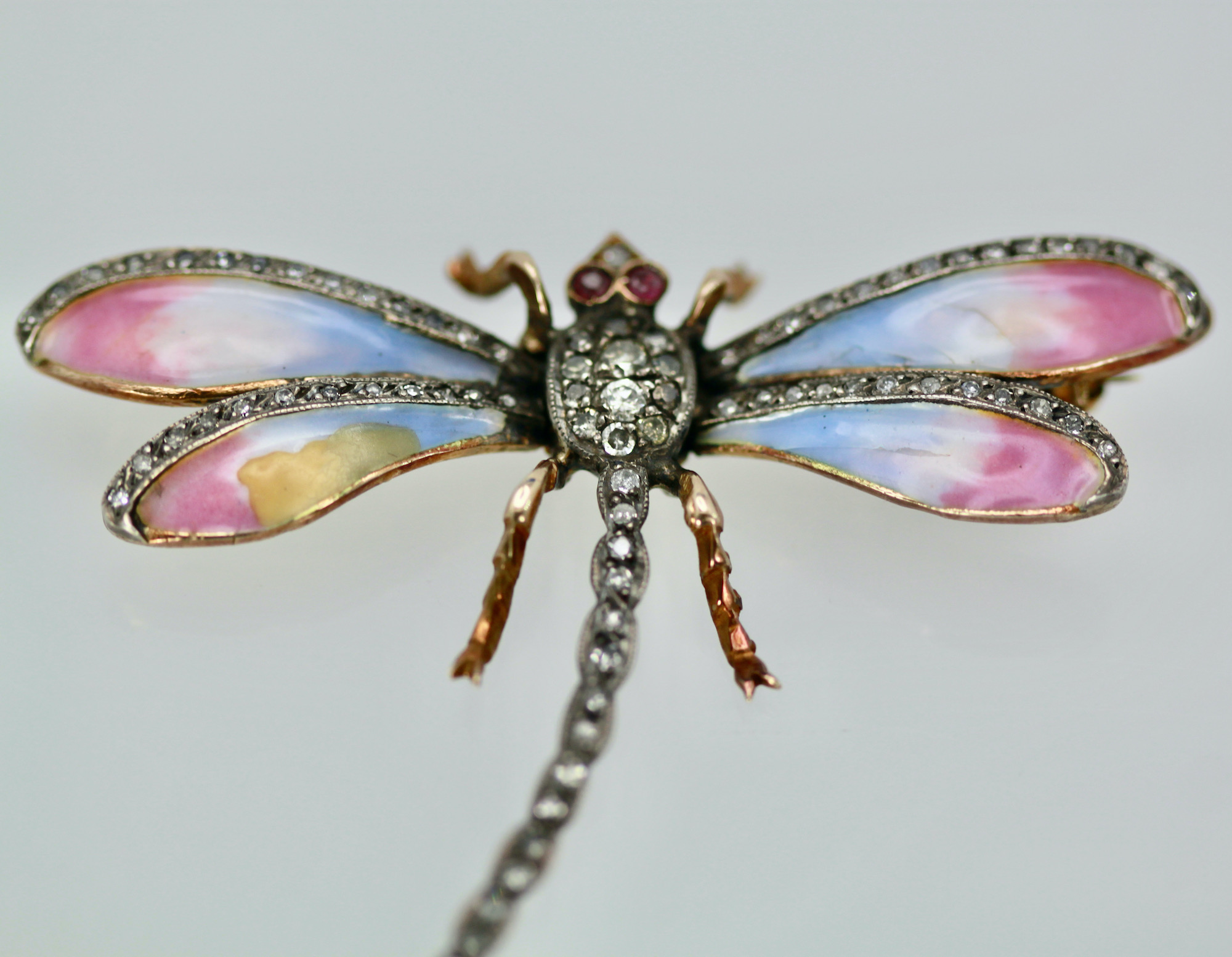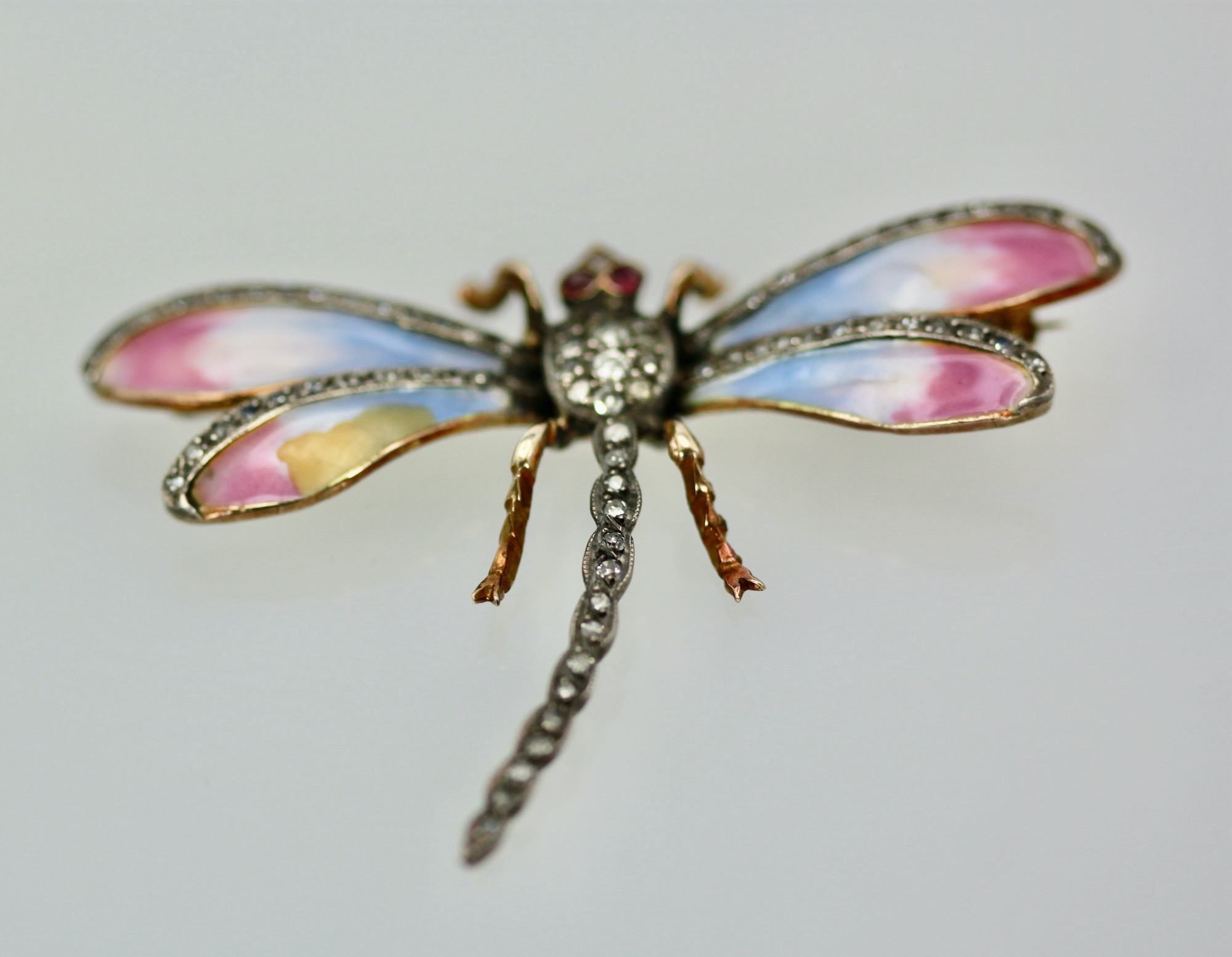 This sweet butterfly has pastel colors of blue pink and a bit of yellow. This pin is old a Retro piece circa 1940. The thorax of this enamel Butterfly is all Diamonds and the tail is Diamonds as are the top of the wings. Two Ruby eyes, complete this piece. The weight is 11.8 grams and it measures 1 1/2" long and 2 1/4" wide. This piece is perfect for a collar on a blouse or a T-shirt it will spruce up whatever you wear it with. Simple butterfly with Diamonds to wear with anything in your wardrobe. Do not wait and miss out on this piece, you will be sorry, sometimes a piece comes around only once in a while such as this.