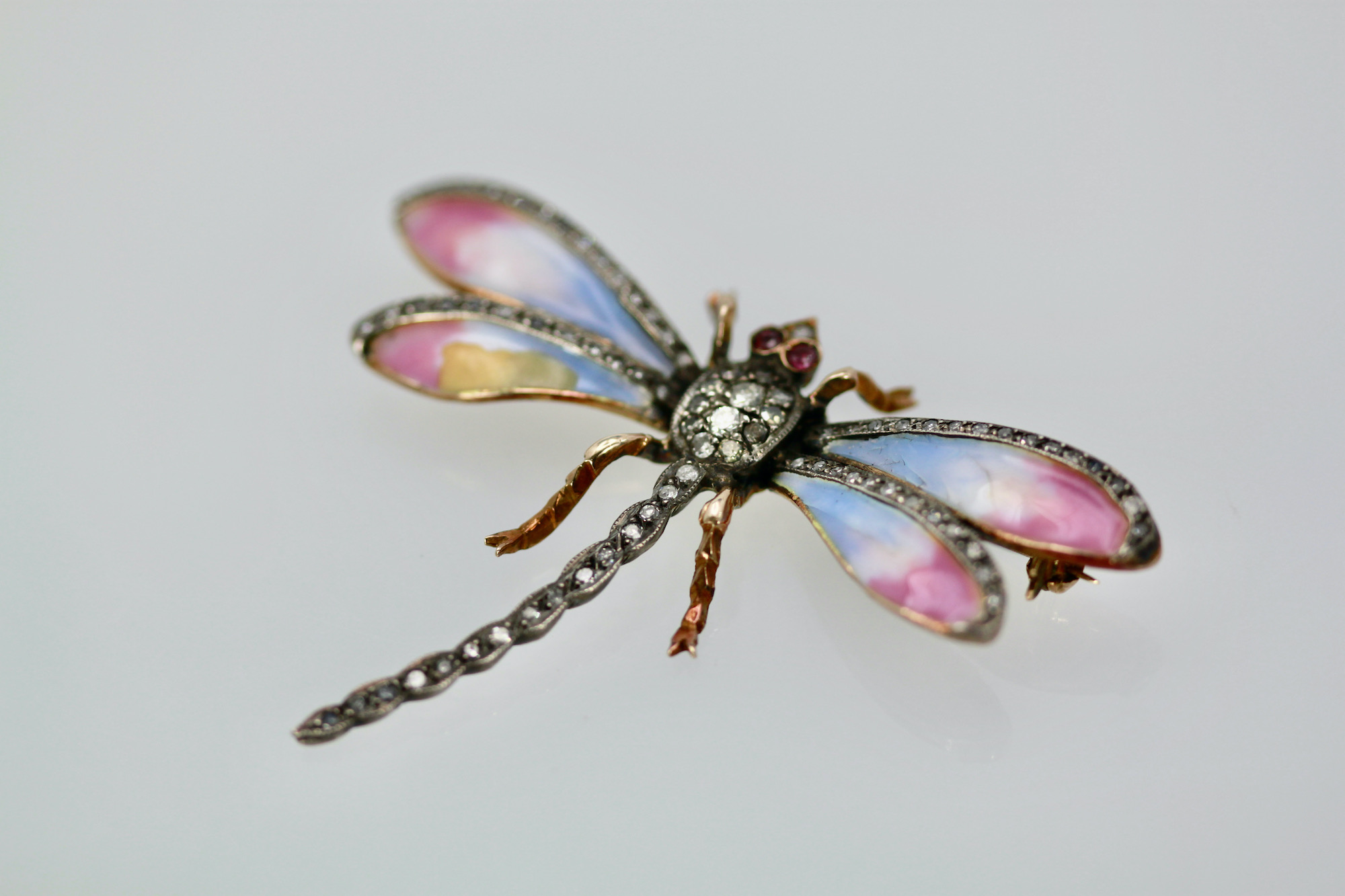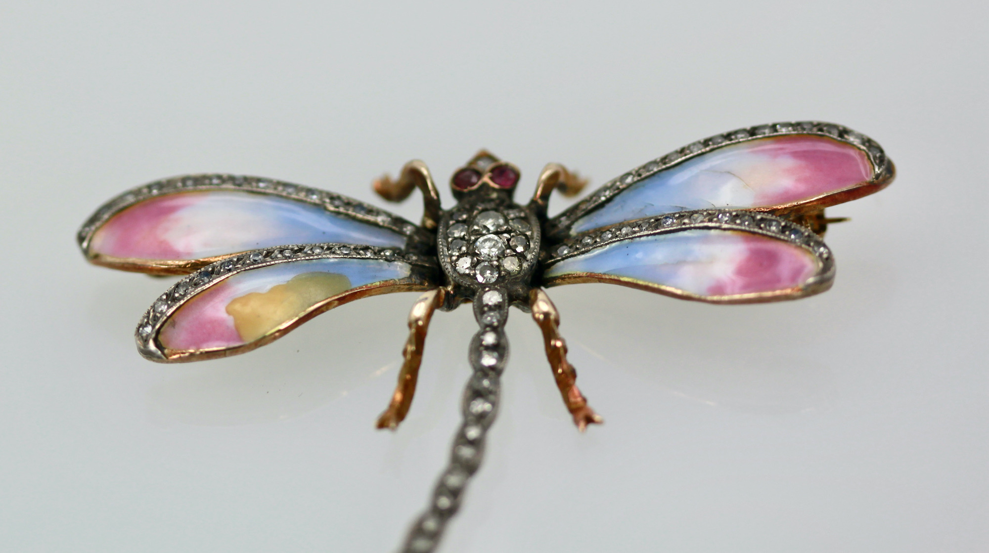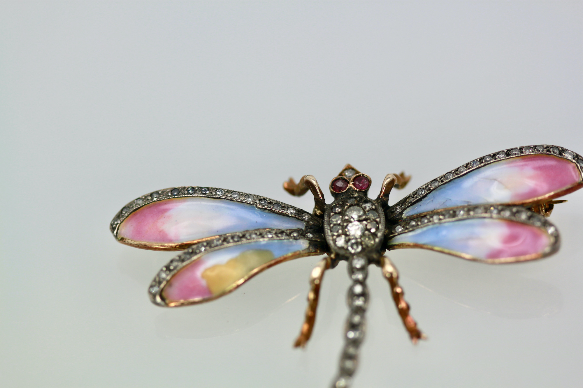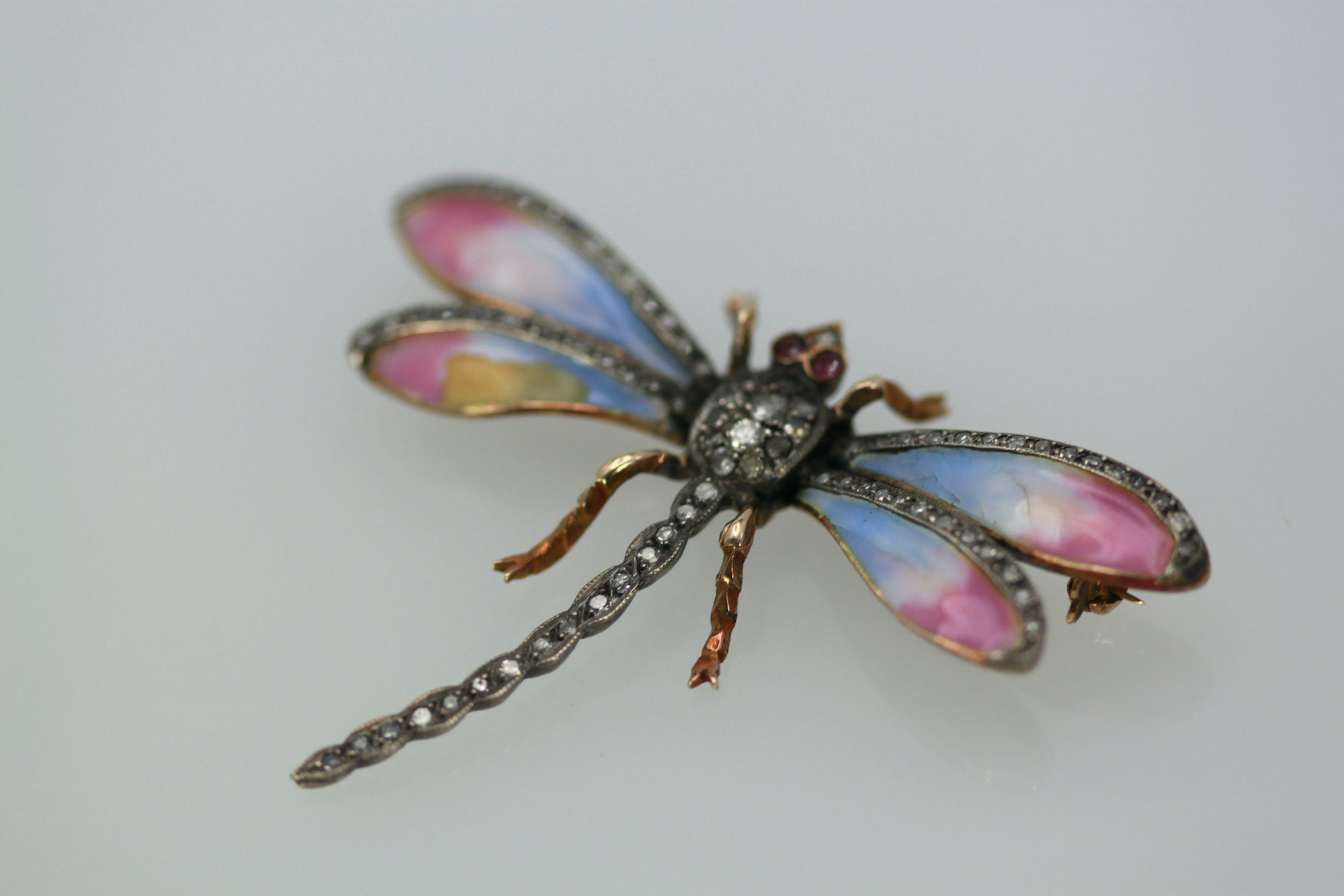 This sweet butterfly has pastel colors of blue pink and a bit of yellow. This pin is old a Retro piece circa 1940. The thorax of this enamel Butterfly is all Diamonds and the tail is Diamonds as are the top of the wings. Two Ruby eyes, complete this piece. The weight is 11.8 grams and it measures 1 1/2" long and 2 1/4" wide. This piece is perfect for a collar on a blouse or a T-shirt it will spruce up whatever you wear it with. Simple butterfly with Diamonds to wear with anything in your wardrobe. Do not wait and miss out on this piece, you will be sorry, sometimes a piece comes around only once in a while such as this.