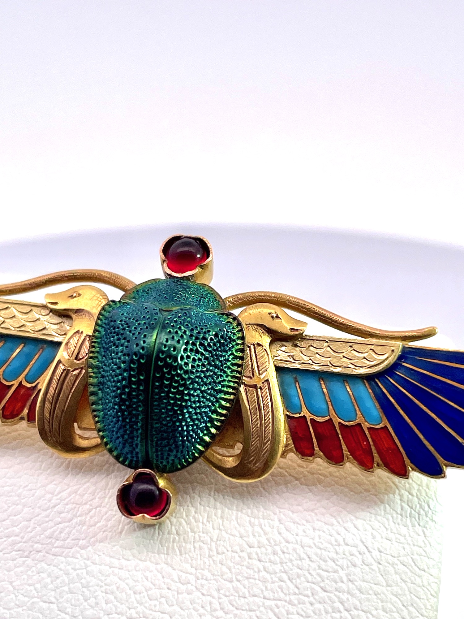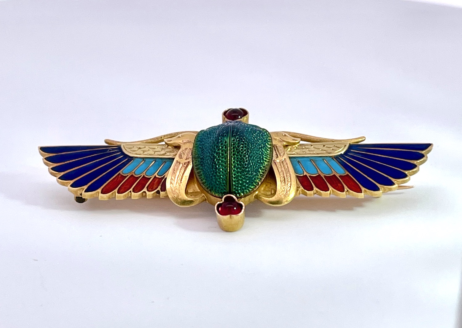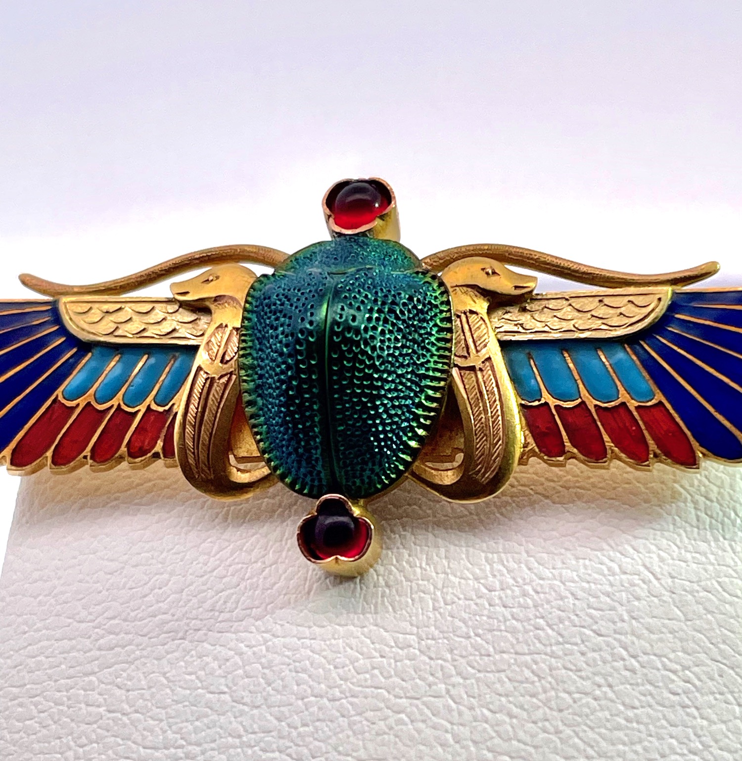 This scarab brooch is by none other than Guiseppe Parvis and it comes out of France. This brooch is amazing and in perfect condition. It is 5cm long and 2cm wide and weighs 6.75 grams. The center is an iridescent real beetle with a bezel set cabochon Garnet on the top and bottom. The enamel is shades of dark blue, medium blue and red. The gold is finely etched and detailed with two snake forms on either side of the beetle. The depth of this brooch 1.76mm I would wear it as a necklace a small adjustment to the clasp. This scarab brooch is one of the nicest I have ever seen and perfect for gift giving. Do not wait.