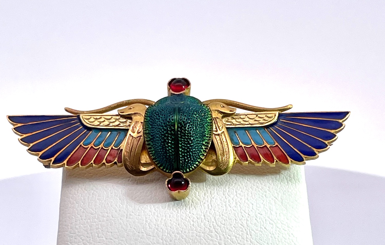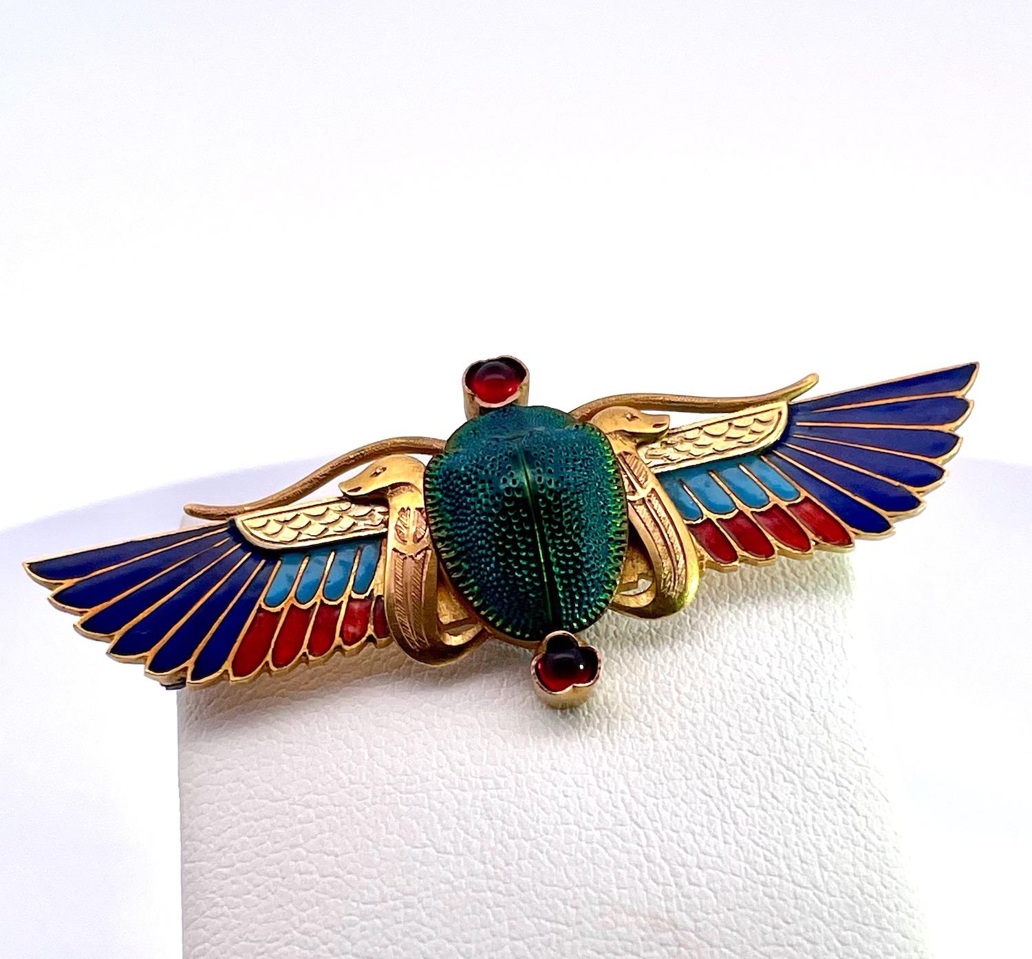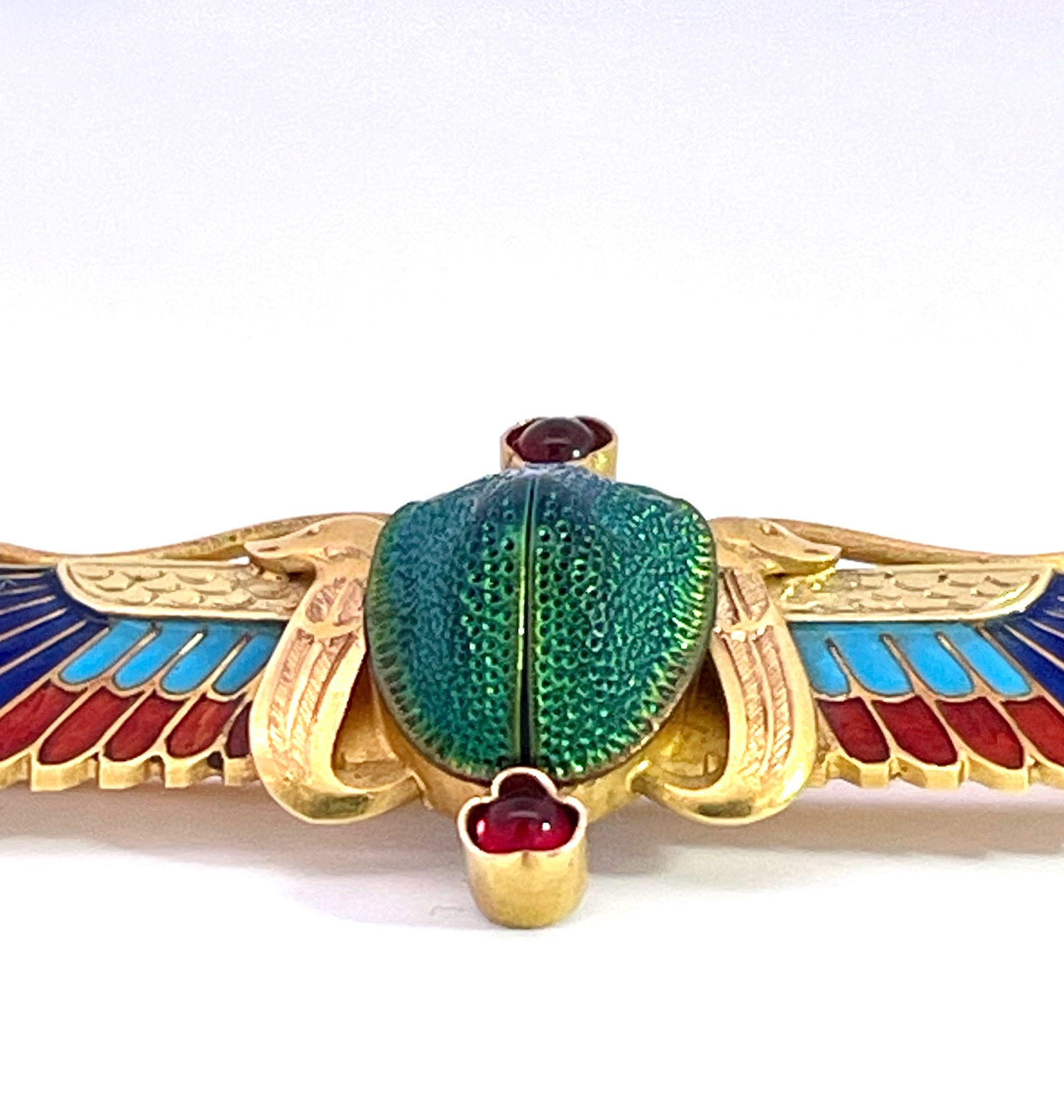 This scarab brooch is by none other than Guiseppe Parvis and it comes out of France. This brooch is amazing and in perfect condition. It is 5cm long and 2cm wide and weighs 6.75 grams. The center is an iridescent real beetle with a bezel set cabochon Garnet on the top and bottom. The enamel is shades of dark blue, medium blue and red. The gold is finely etched and detailed with two snake forms on either side of the beetle. The depth of this brooch 1.76mm I would wear it as a necklace a small adjustment to the clasp. This scarab brooch is one of the nicest I have ever seen and perfect for gift giving. Do not wait.