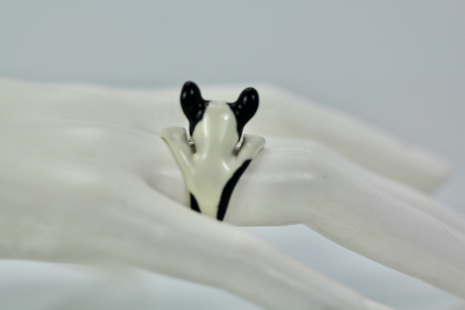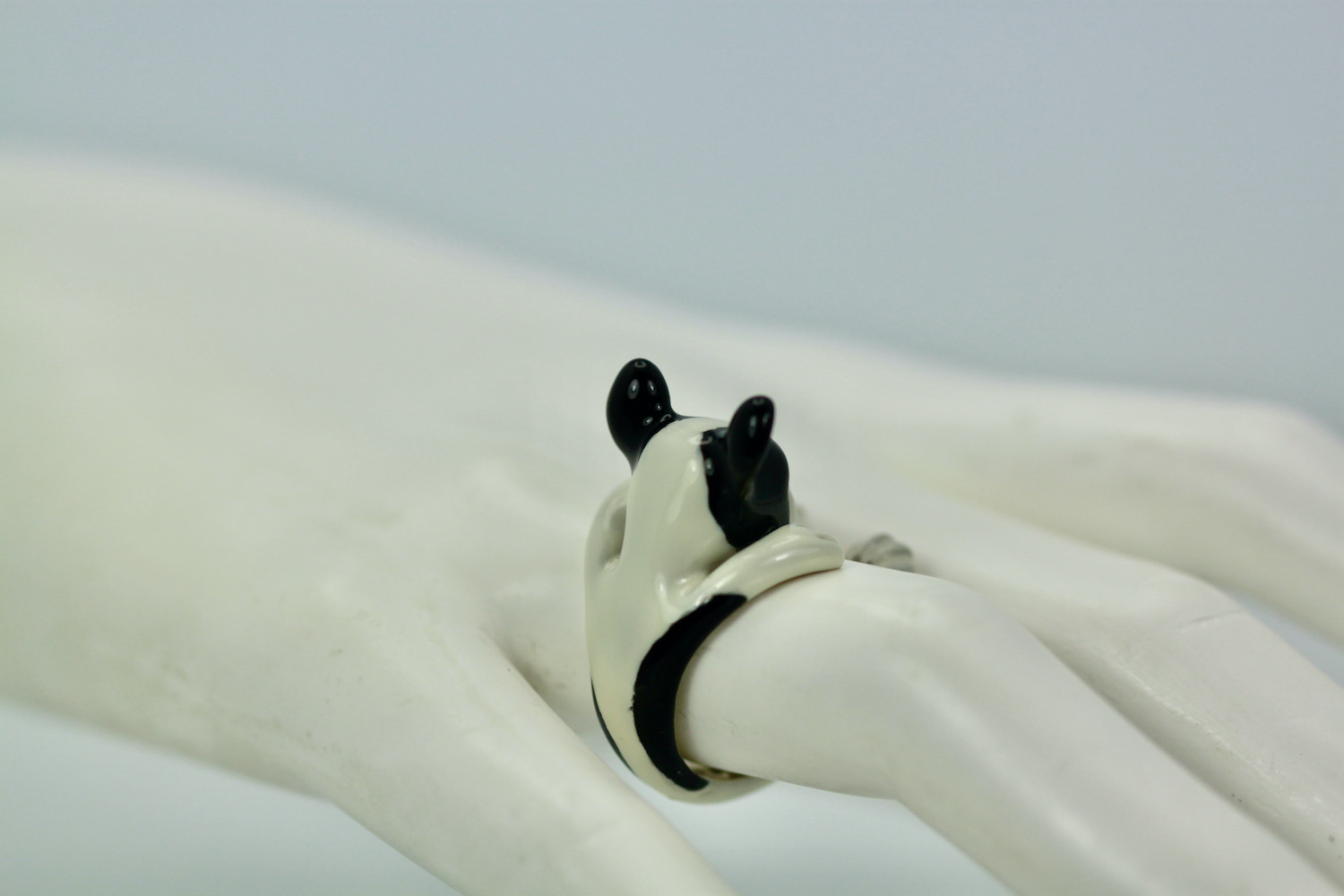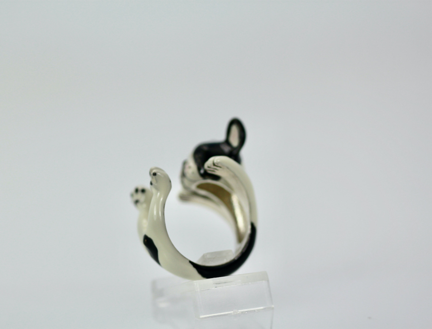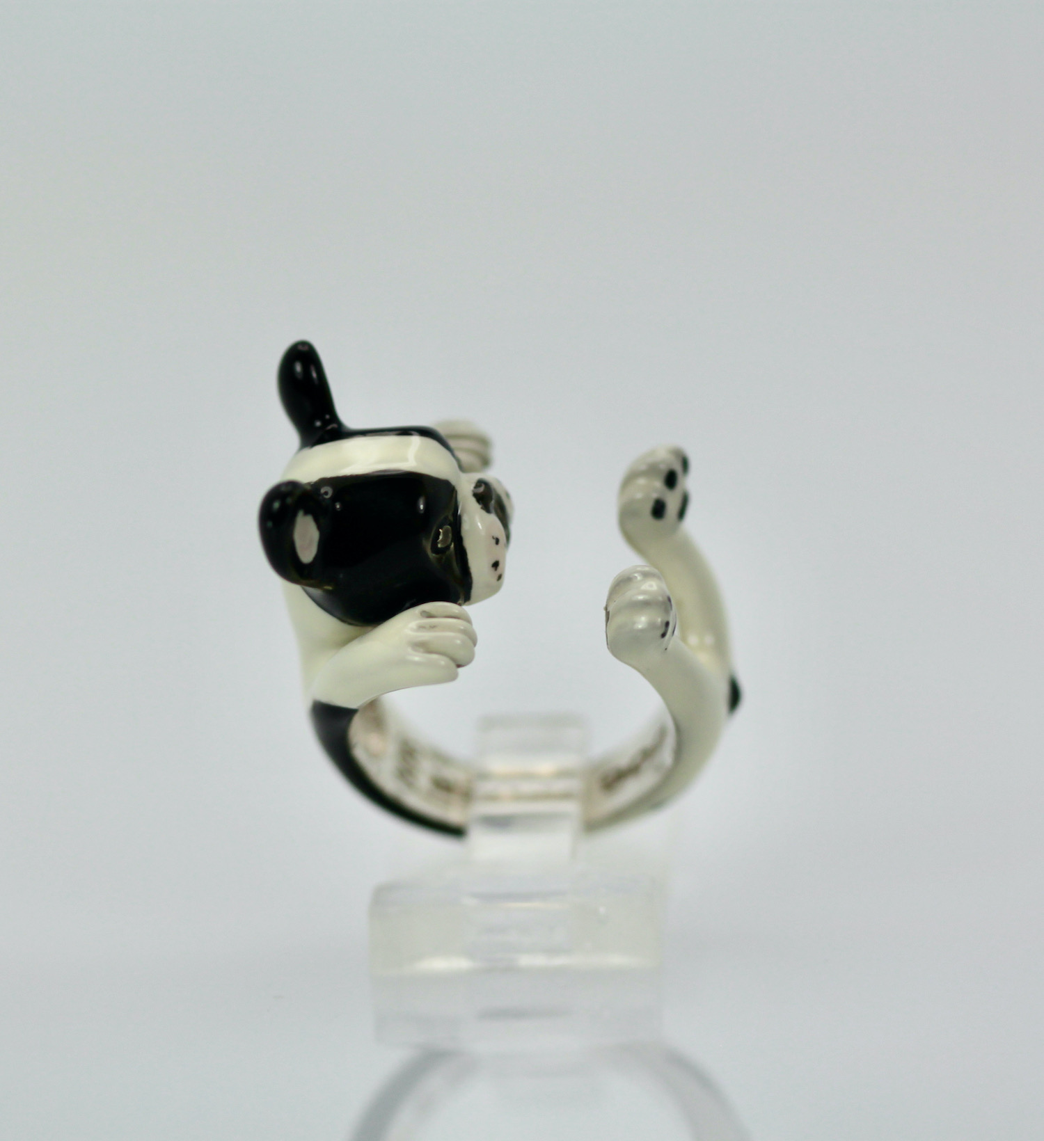 This ring depicts a boston terrier and is just delightful. This ring is made in sterling silver with a Ceramic enamel body. This ring is size 7 is 15.5 grams and is 20.64 mm across. This Boston Terrier has a cute face an is so unusual I have never seen another. I could not resist these beautiful dog rings. This is the first time I have seen anything like these ceramic dog rings and I do not think you will find another so I would not wait if these dogs are your style. I have recently seen another but it is unusual, but they are unusual and special, as they bring a sense of humor to the wear and the other people noticing.