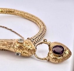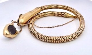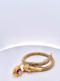 This snake bracelet is unique as the head of the snake is fully engraved and set with 3 Diamonds (not tested). It will fit many sizes of wrists as it just slips on the wrist without any closure. It is secured with a chain so you will not lose it. As you might know I am a snake collector with many snake items for sale and this is no different. This snake has eyes of Diamonds and on top of his head another Diamond (not tested) and it holds and engraved locket, clear glass back and on front an 0.75 carat Amethyst stone. The bracelet body is coiled gold and stretches to fit almost any size wrist. This weighs 25.43 grams.