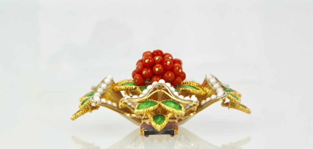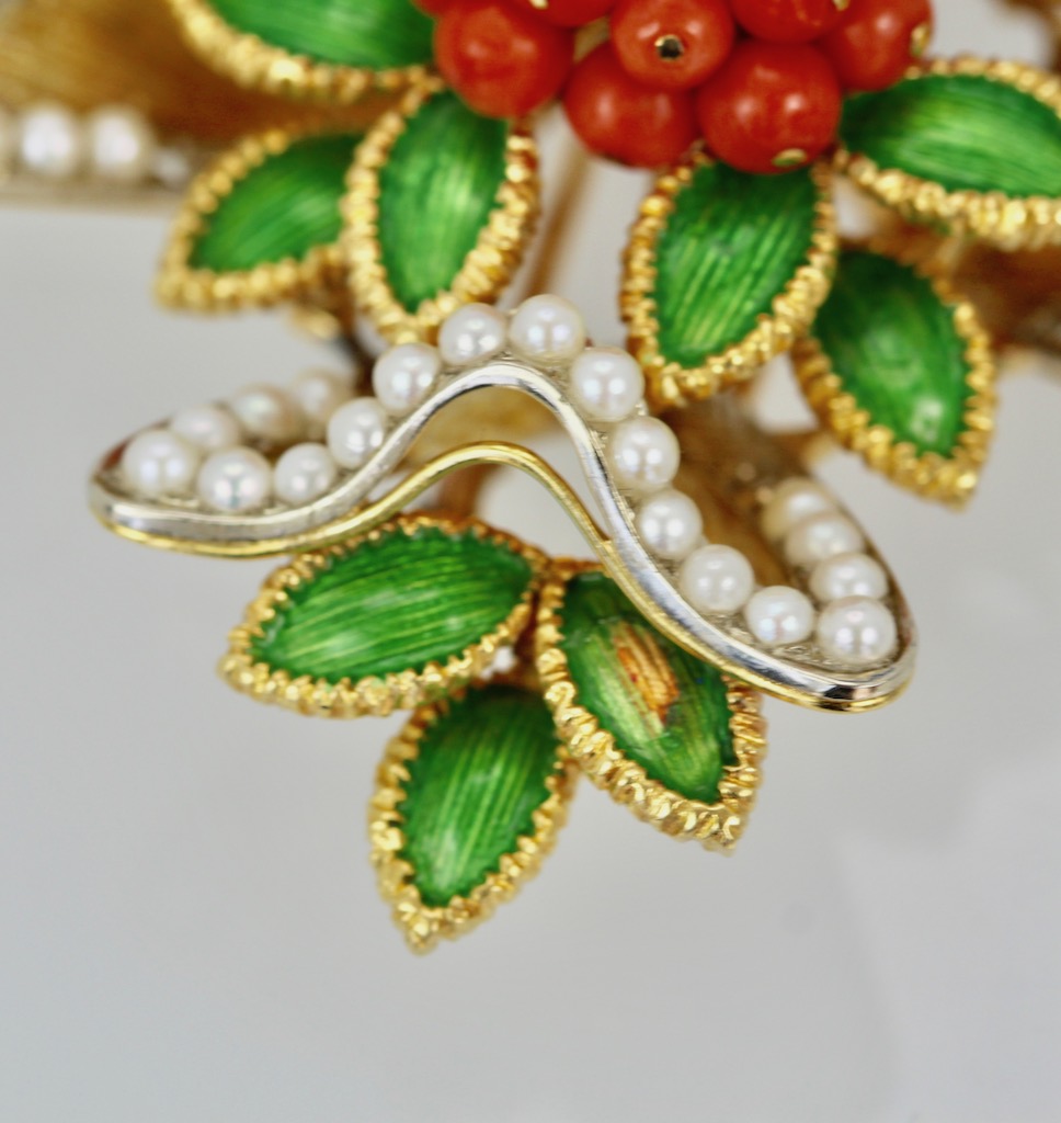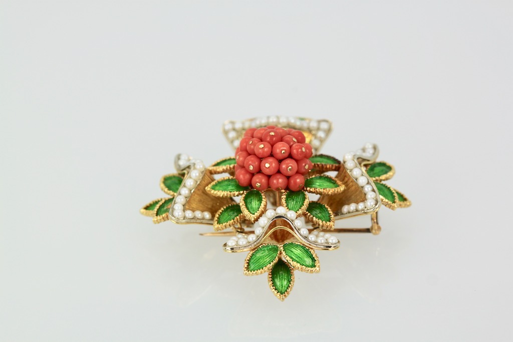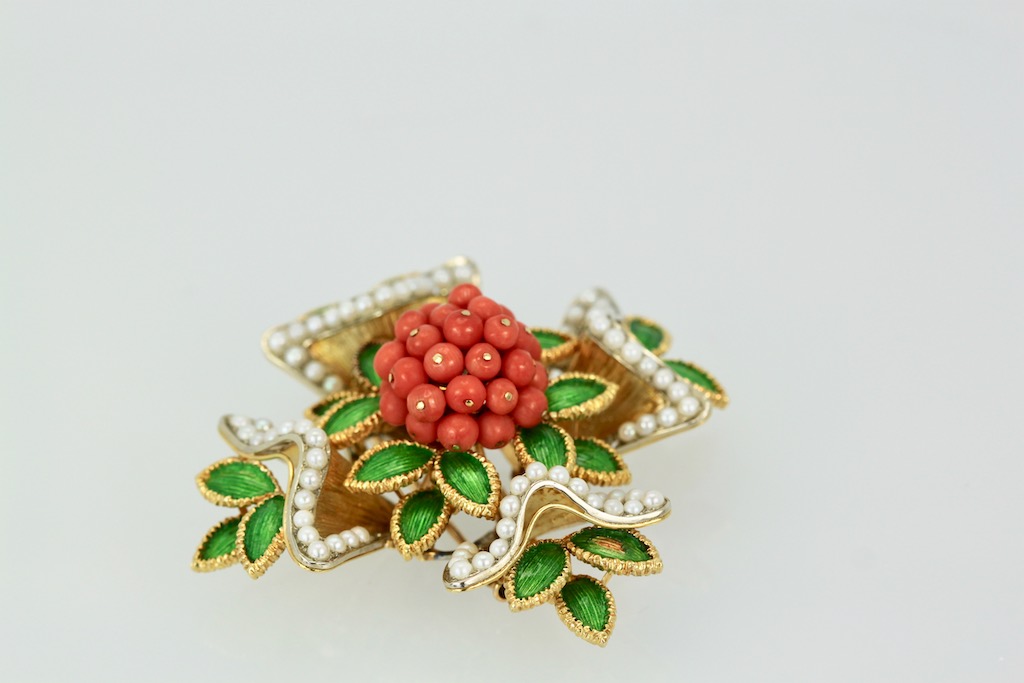 This extraordinary French Enamel Pearl Coral Maltese Cross Flower Brooch is remarkable. The piece is done in 18k yellow Gold and features Coral beads and Seed Pearls all intact with Guilloche enamel in gorgeous green. This brooch can be worn as a pendant as well as a brooch and it is large 70mm wide x 70mm long. There is a tiny bit of enamel loss hard to find and does not distract from this gorgeous piece. I picked this piece up in a French auction and I fell in love with it, it is gorgeous and as with all pieces made in Coral it needs a certificate to leave the country. I have a CITES permit to ship out of the Country.