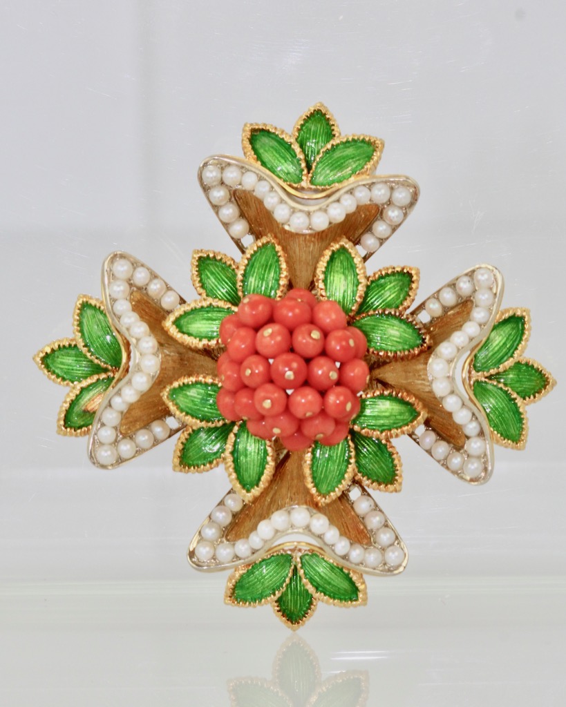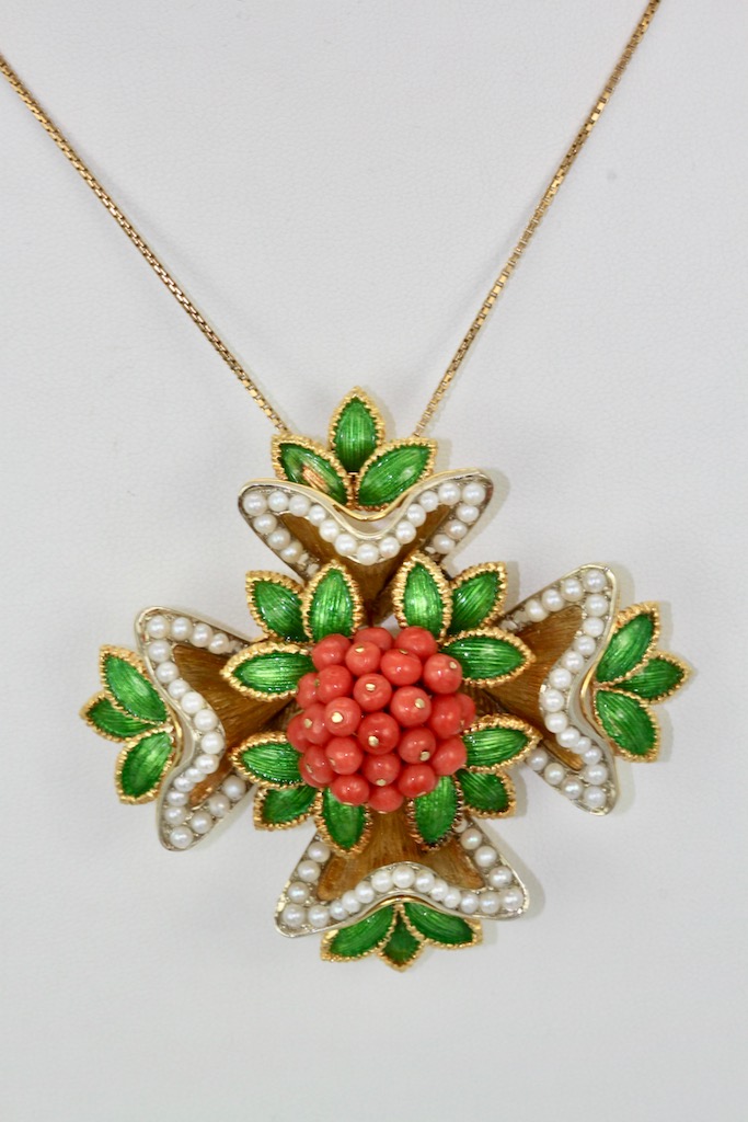 French Enamel, Pearl, Coral, Maltese Cross Flower Brooch Pendant