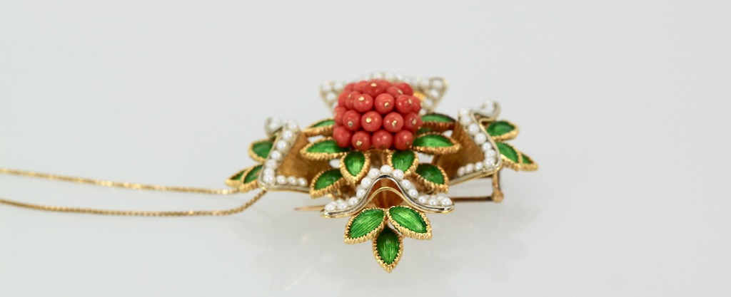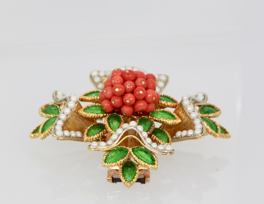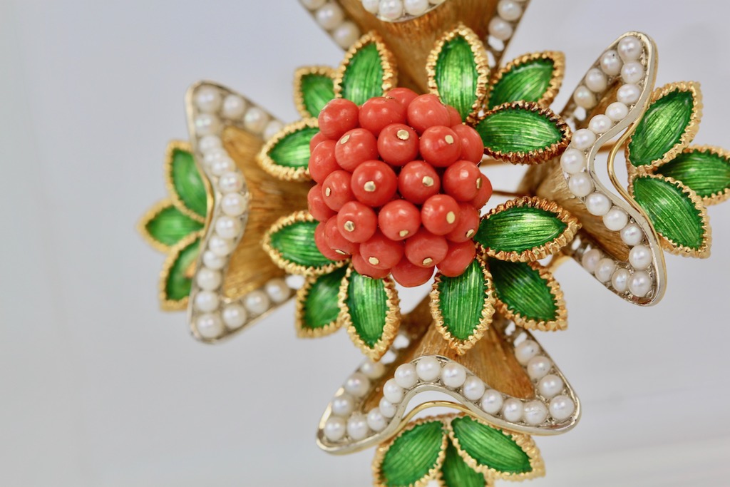 SKU: 86957French 18 Karat Enamel, Pearl, Coral, Matisse Cross Flower Brooch Pendant