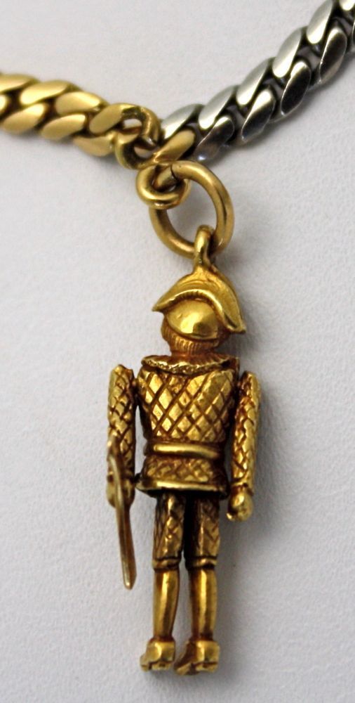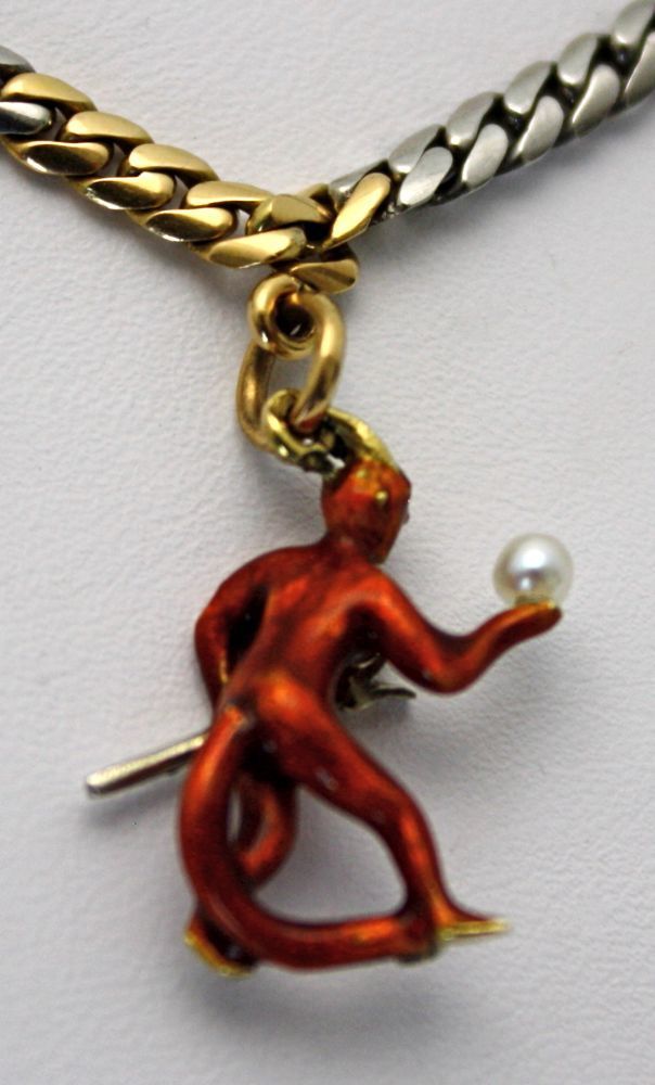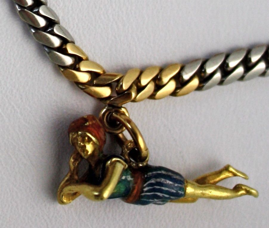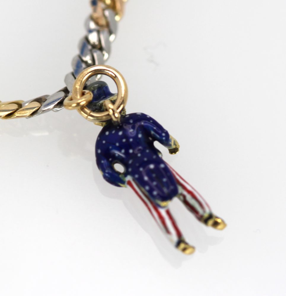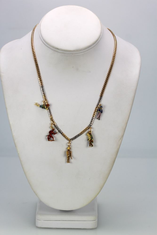 French Platinum & 18K Enamel Charm Necklace. This special charm necklace alternates between links of platinum and links of 18k yellow gold and has an extremely secure lock. Suspended from this unusual chain are five exceptionally unique and very rare enameled charms, all in 18k gold. The detailed clown charm holds a baton and his shirt has three sapphires as buttons.