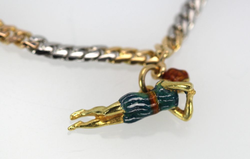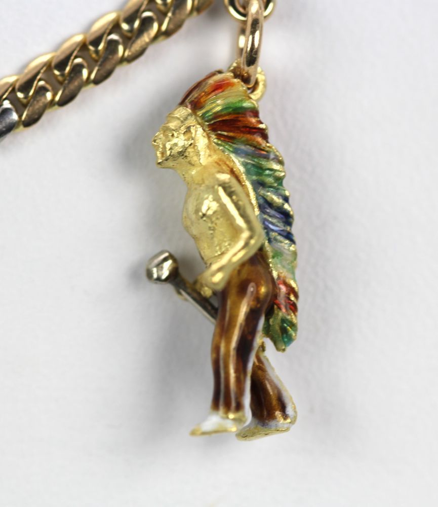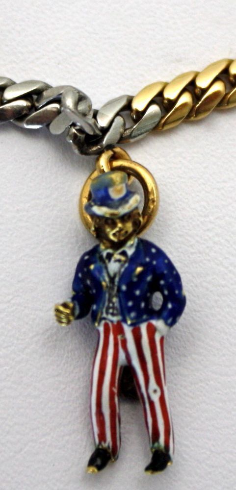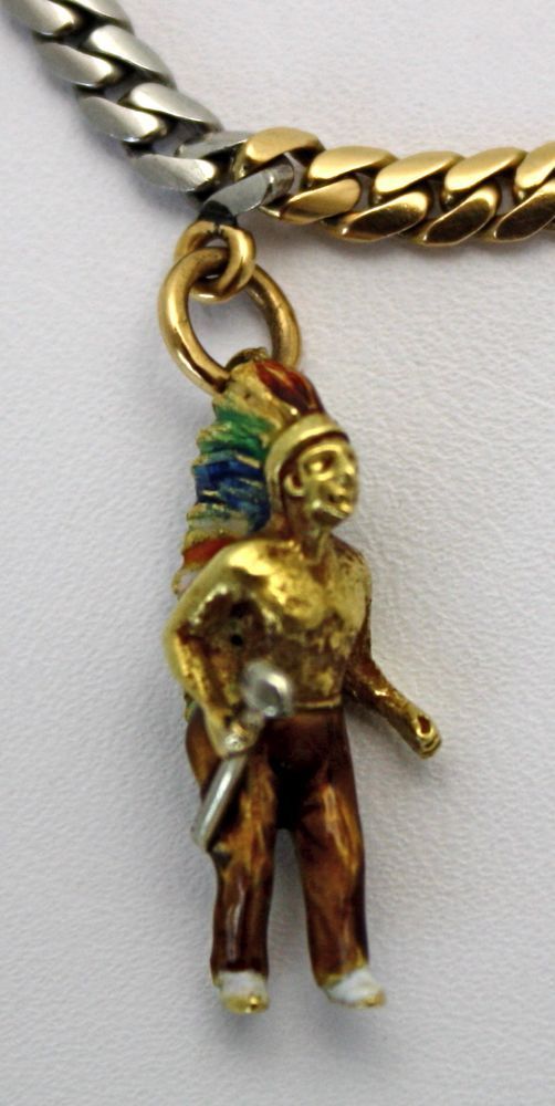 There is also an Uncle Sam charm (enamel could use restoration), a devil with a tail holding a pearl, an American Indian with a tomahawk and feathered headdress, and a lady swimmer in bathing suit and cap. There is one spot open for your own charm and statement. This beautiful one-of-a-kind piece is fully hallmarked French and For Export.