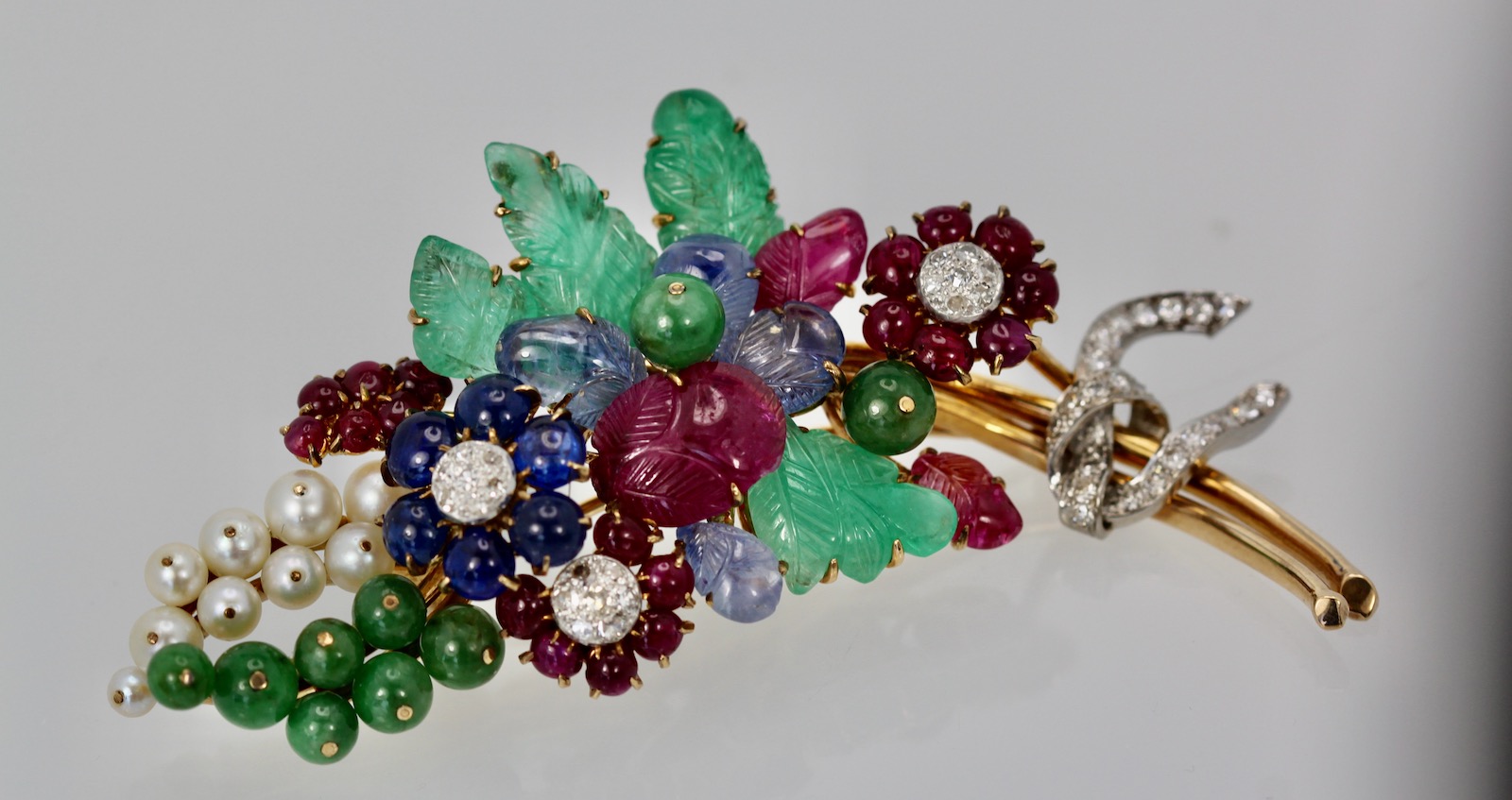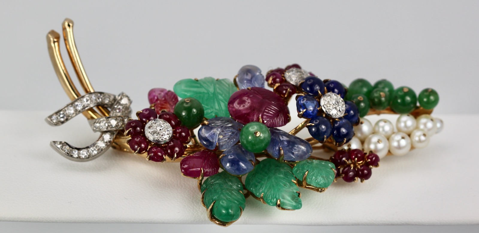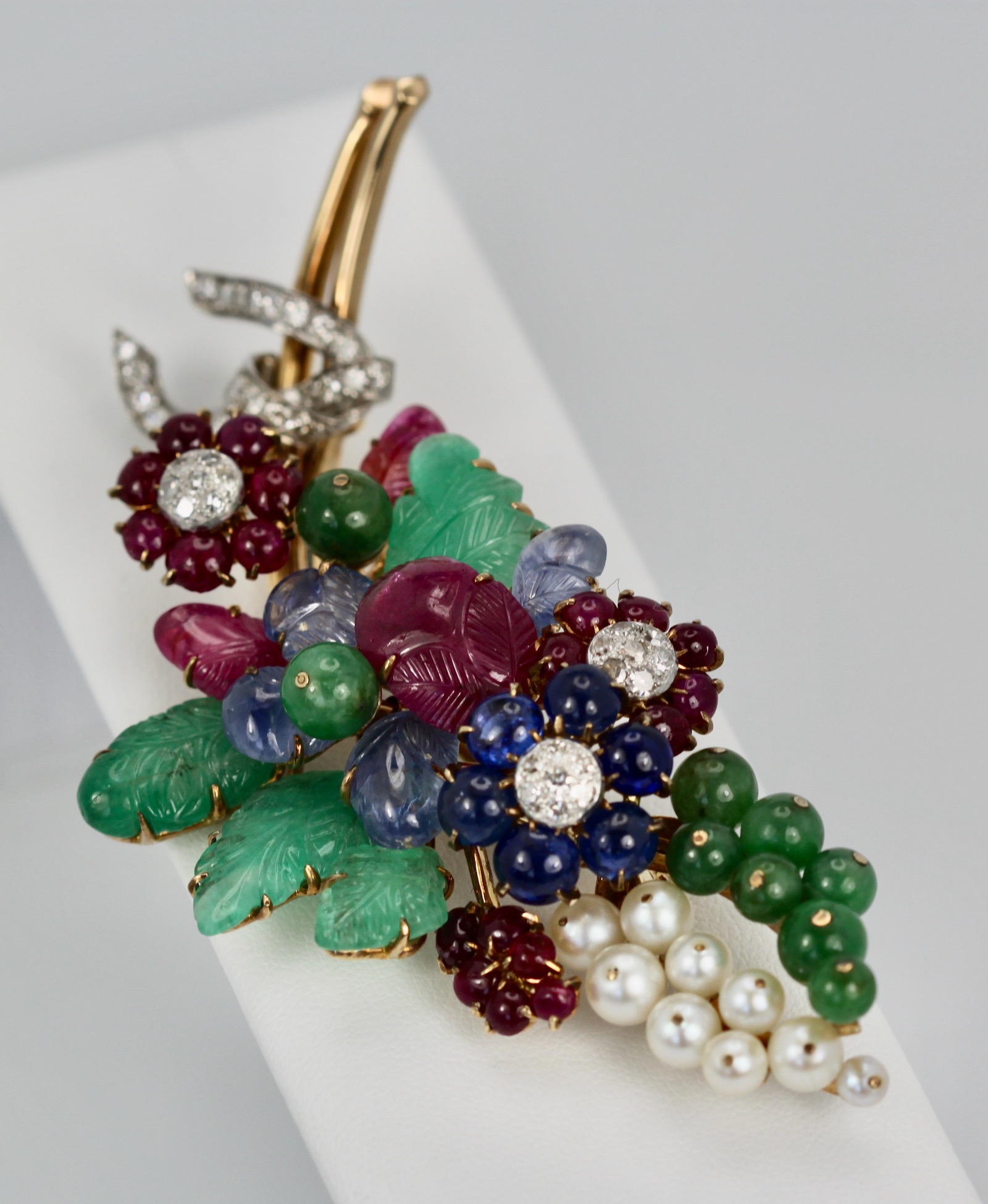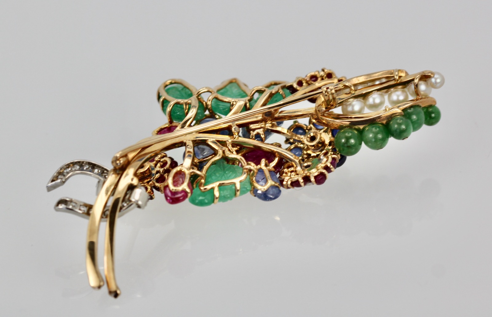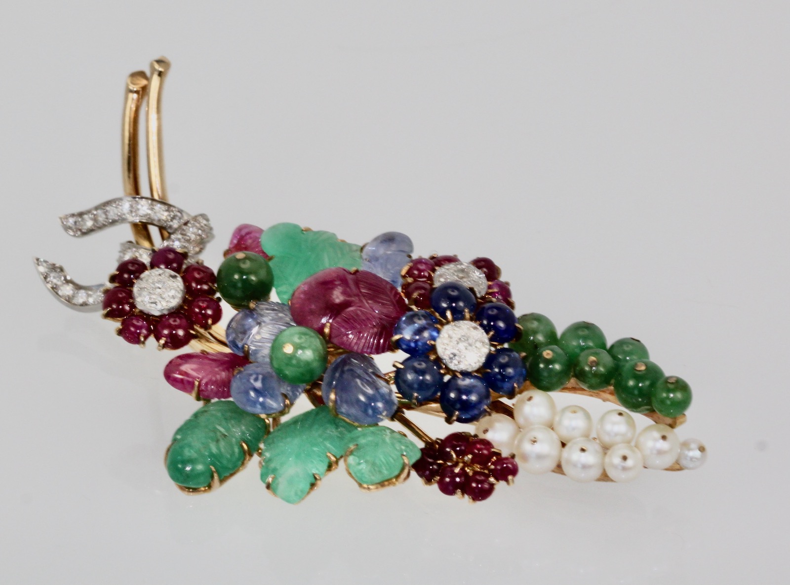 This gorgeous gem set Diamond brooch is a bit Tutti Frutti plus. This brooch is large 8.5 cm long or 3 1/4" at the widest it is 3 cm and it weights 34.4 grams. The brooch consists of (4) Green Emerald carved leaves, (8) round beads, (4) Ceylon Sapphire carved leaves, (3) carved Ruby leaves, 20 small Ruby beads, (6) deep Blue Sapphires, (9) pearls cultured and numerous Diamonds all on 18K yellow gold. This comes with a certificate stating the Jade is real as are the stones. This is very special and a piece you will hold on to for life. Just exquisite. Do not wait or you will be too late this is a very special piece I purchased through Sothebys Auction House.