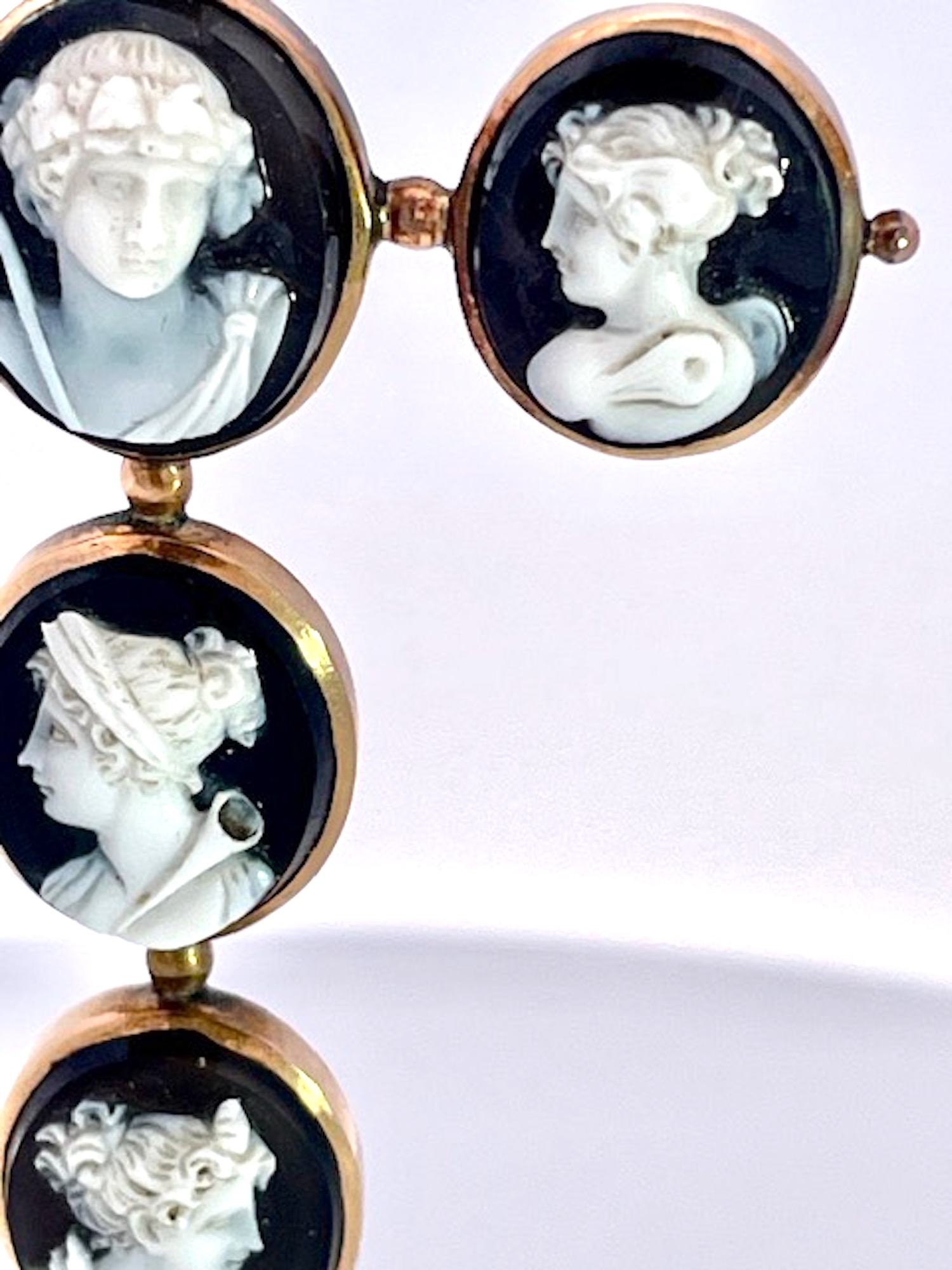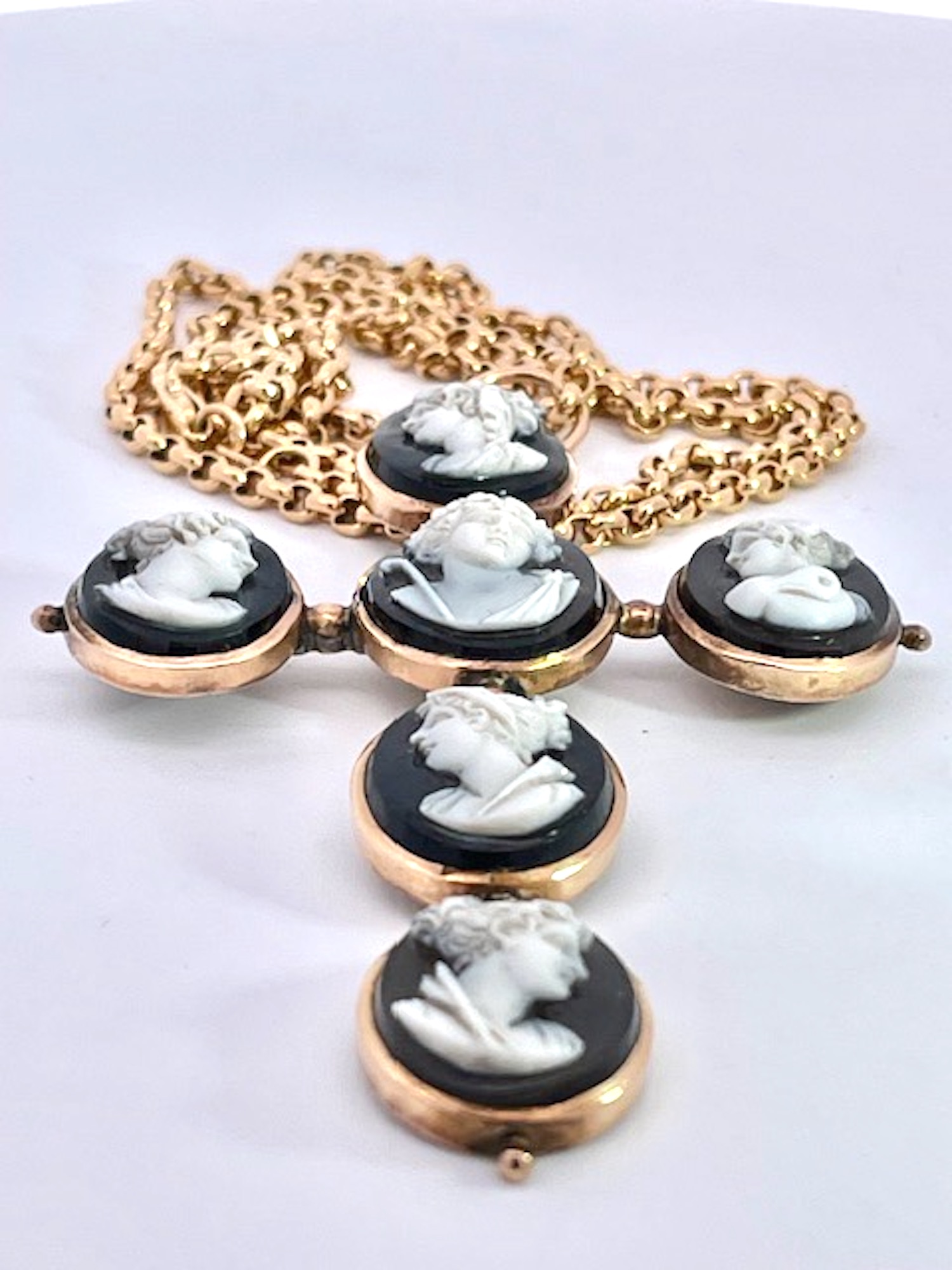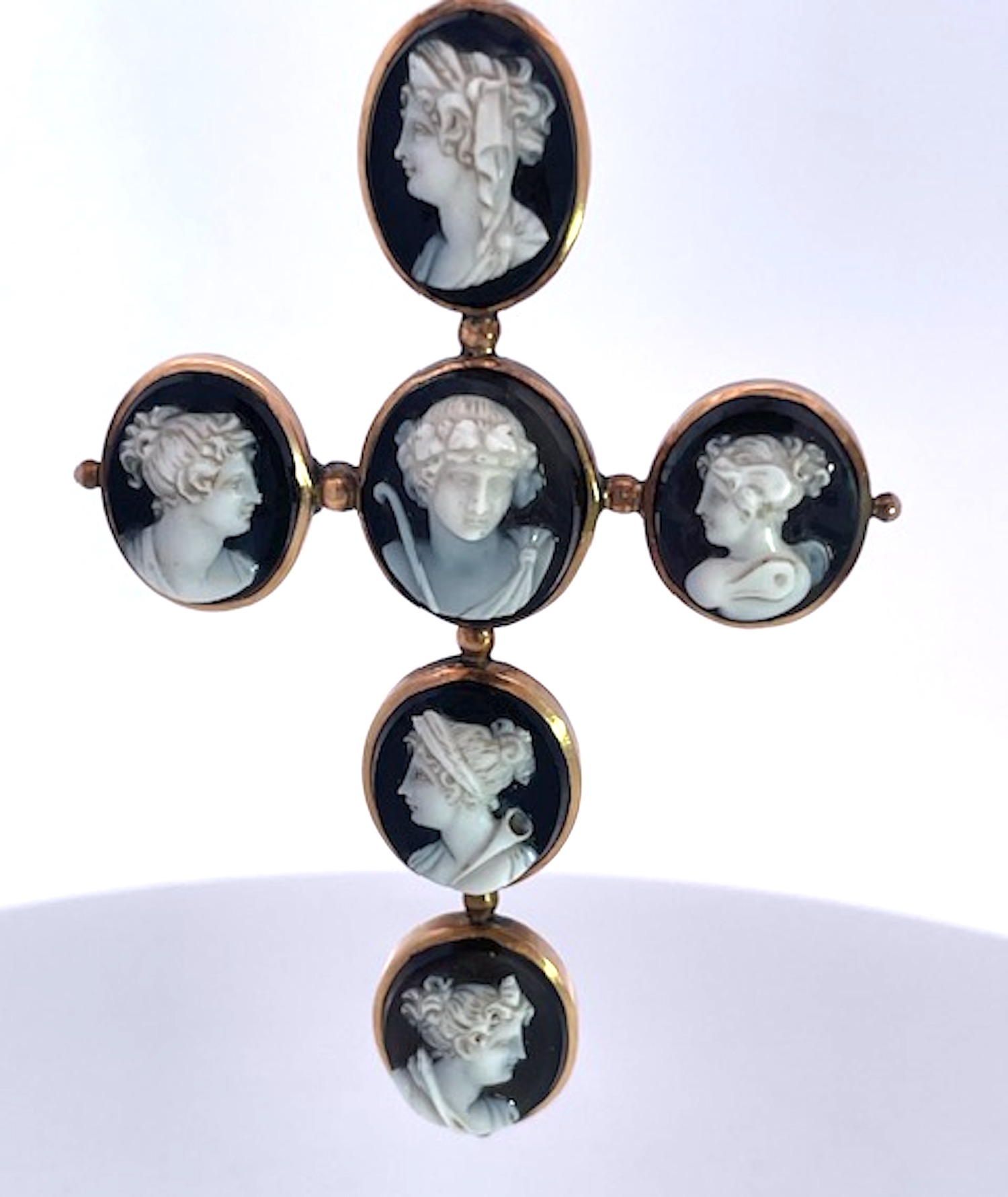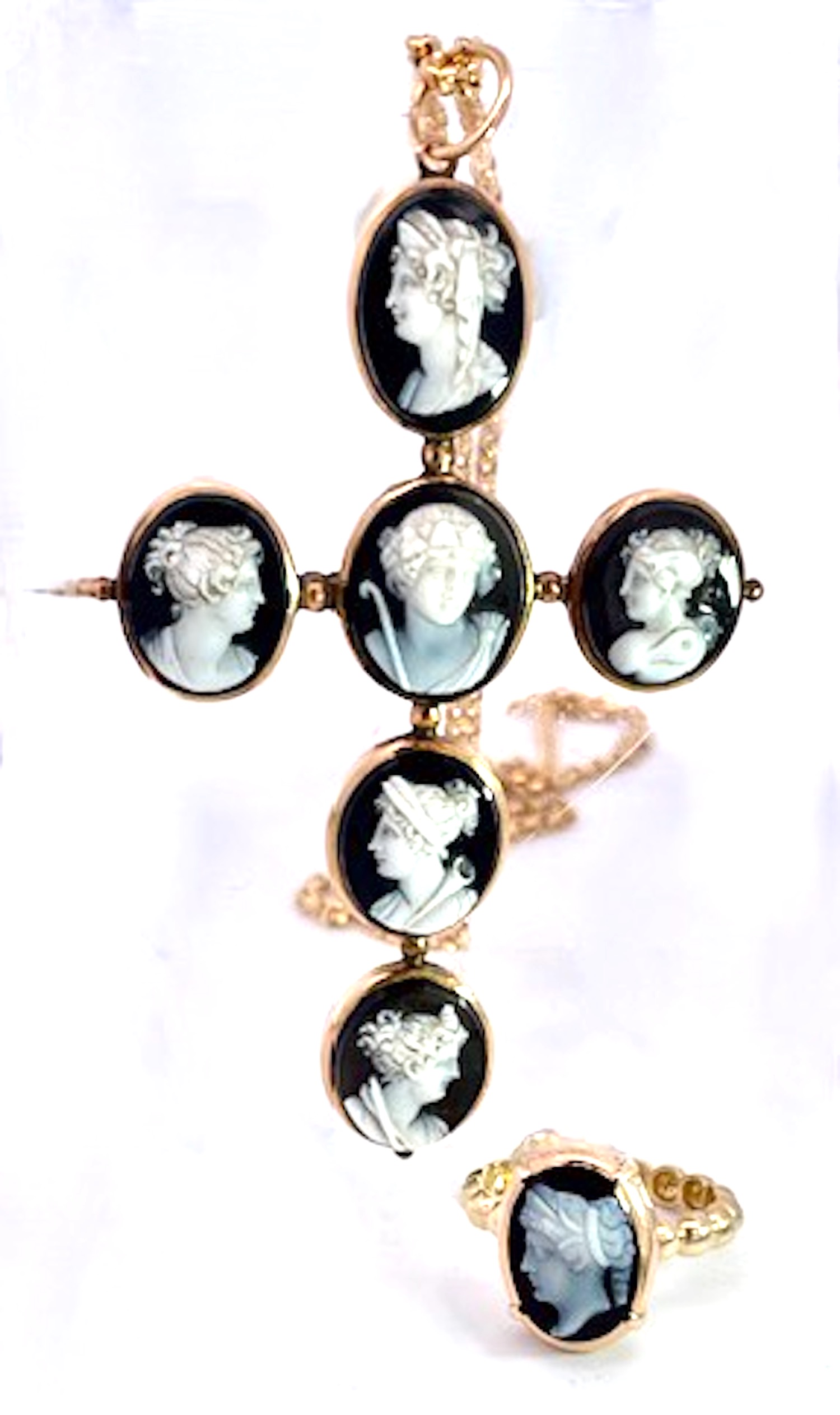This amazing cross pendant is from the 1860's and it is magnificent.There are 6 hardstone Cameos depicting classical Greek figures, in the center probably Dionysus accompanied by a retinue of female followers, mounted in 14K yellow gold. I have never seen another in all my years of collecting fine and antique jewelry. The length is 7 cm and the width is 4.5 cm. These carvings are exquisite and I have a matching small ring. There is one small repair on the underside but it does not distract, imagine this is one hundred and sixty five years old and in beautiful condition. I have acquired several other hardstone cameo pieces that work beautifully with this cross do not wait, just might be too late.