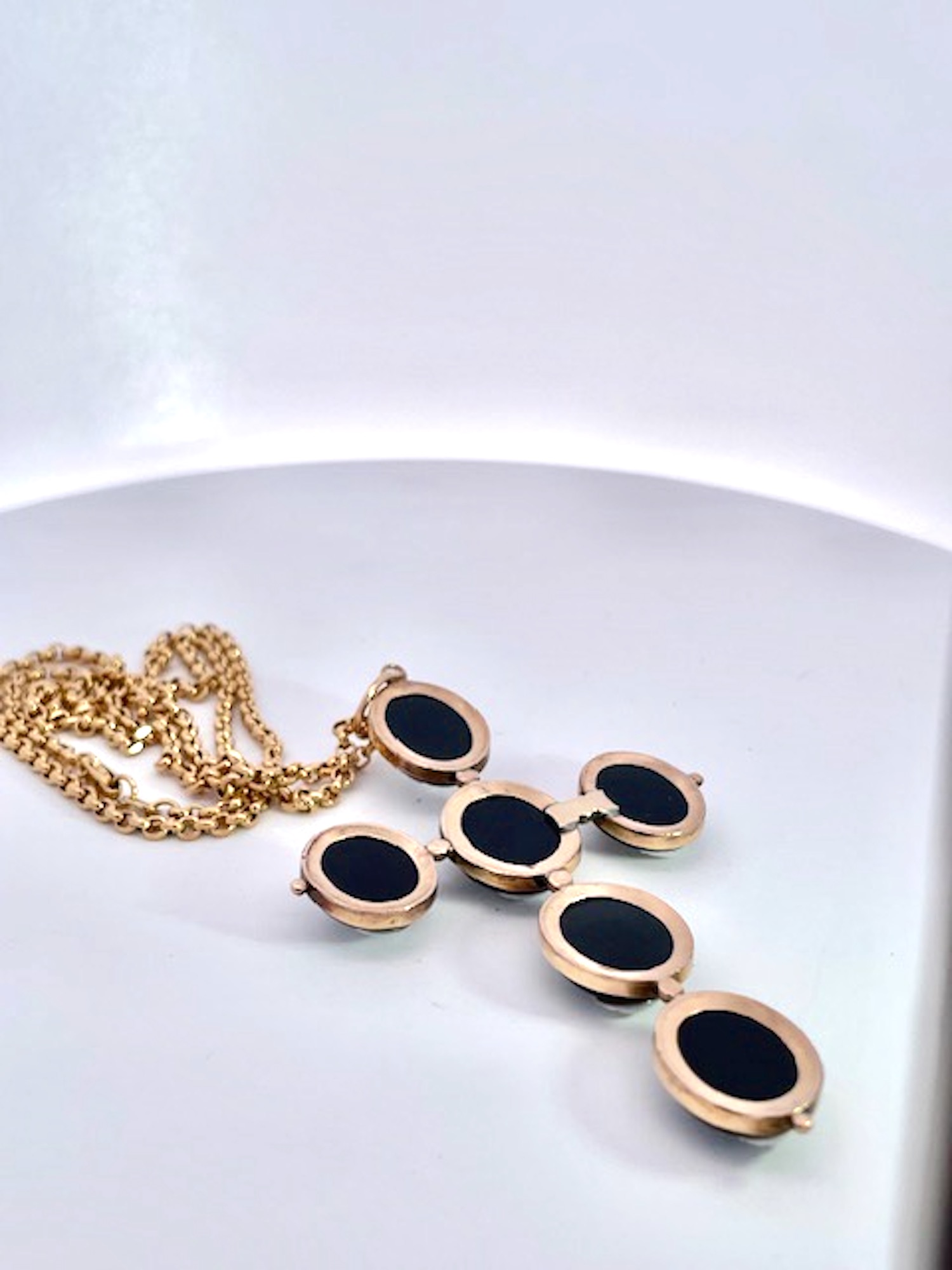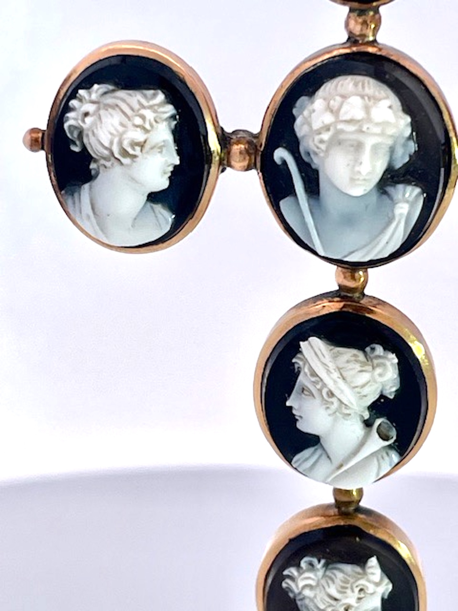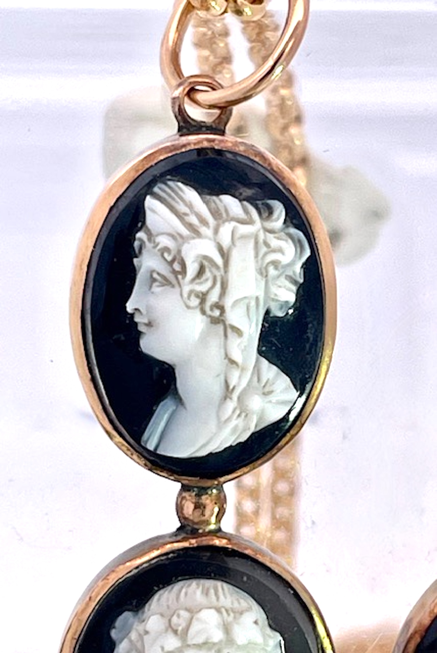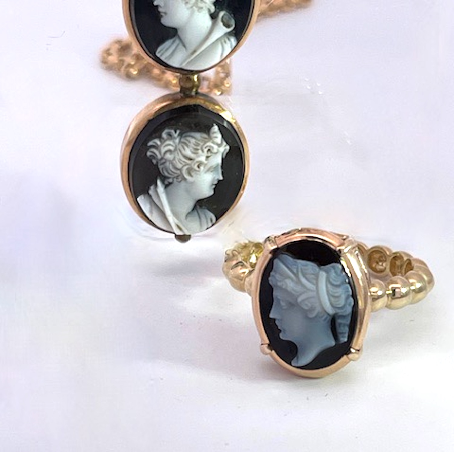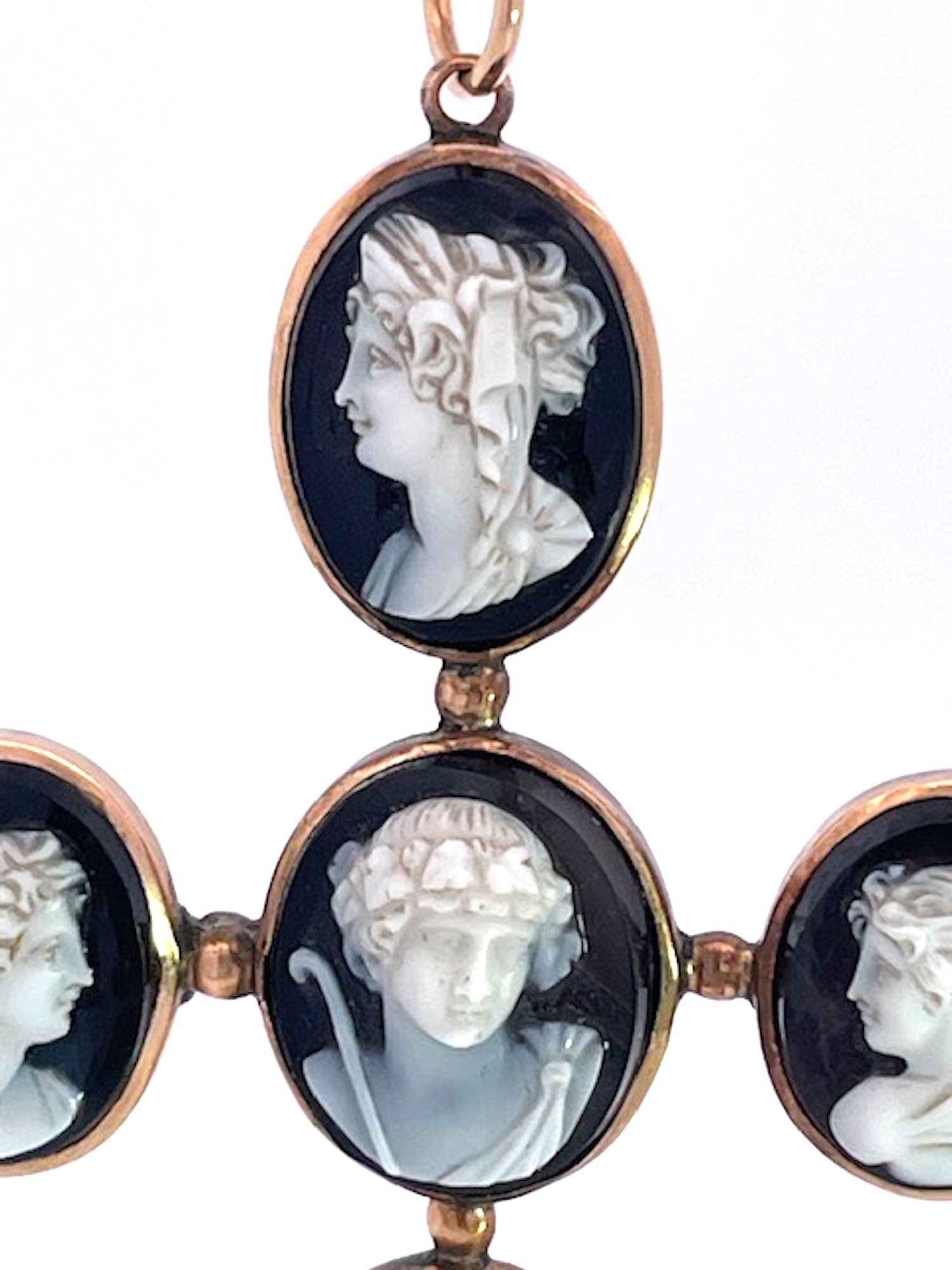 This amazing cross pendant is from the 1860's and it is magnificent.There are 6 hardstone Cameos depicting classical Greek figures, in the center probably Dionysus accompanied by a retinue of female followers, mounted in 14K yellow gold. I have never seen another in all my years of collecting fine and antique jewelry. The length is 7 cm and the width is 4.5 cm. These carvings are exquisite and I have a matching small ring. There is one small repair on the underside but it does not distract, imagine this is one hundred and sixty five years old and in beautiful condition. I have acquired several other hardstone cameo pieces that work beautifully with this cross do not wait, just might be too late.