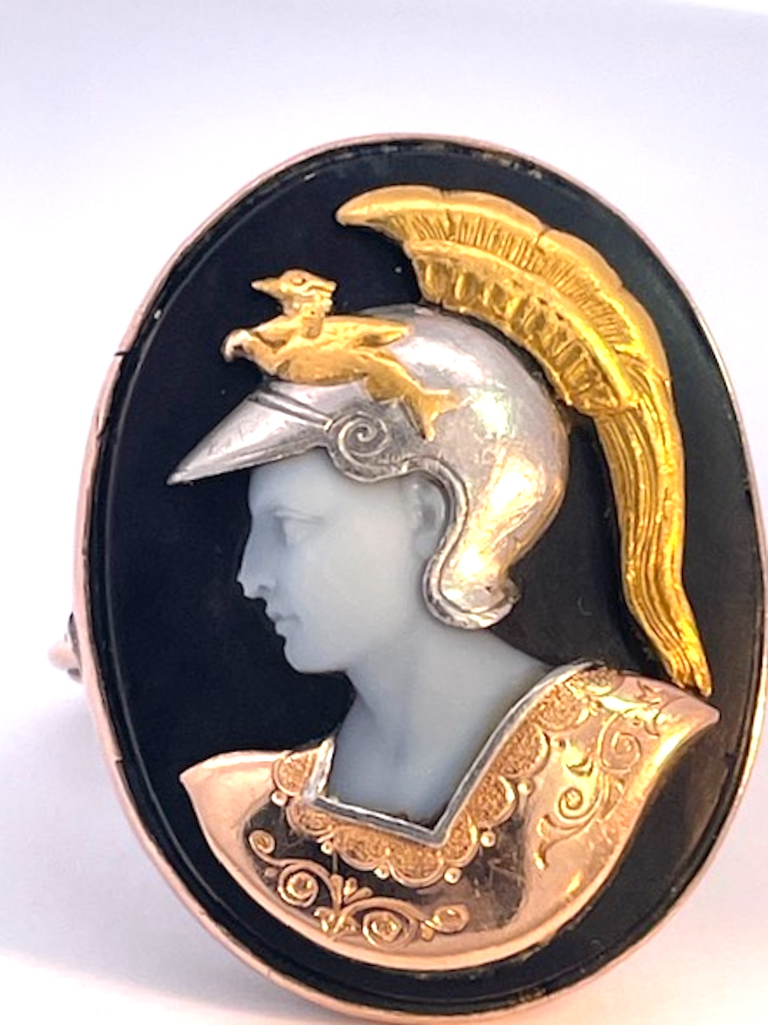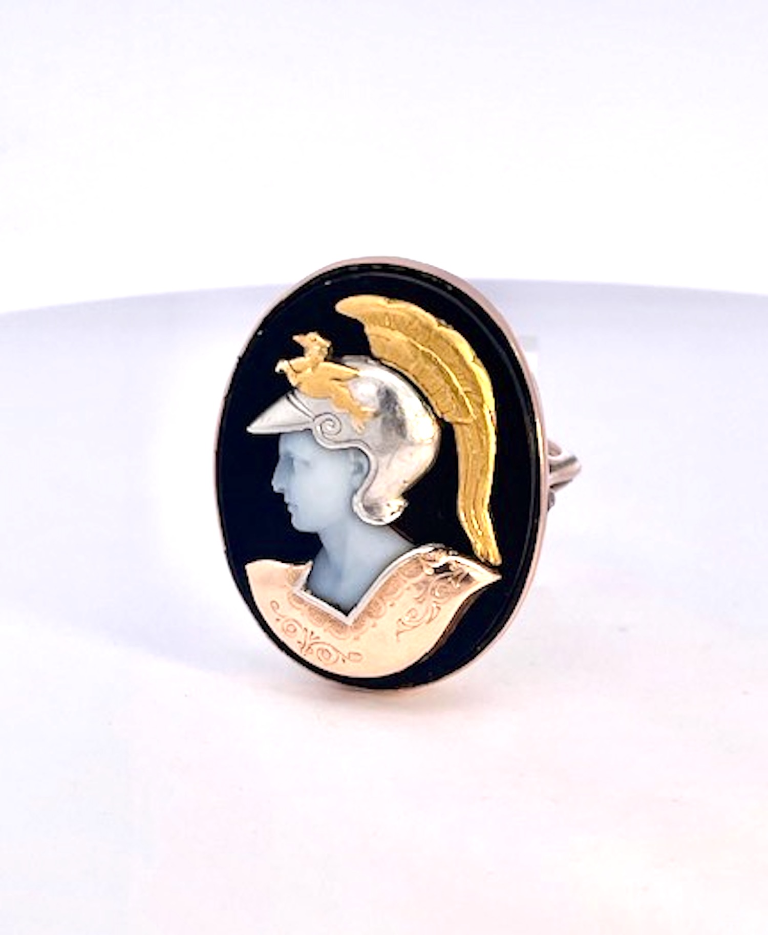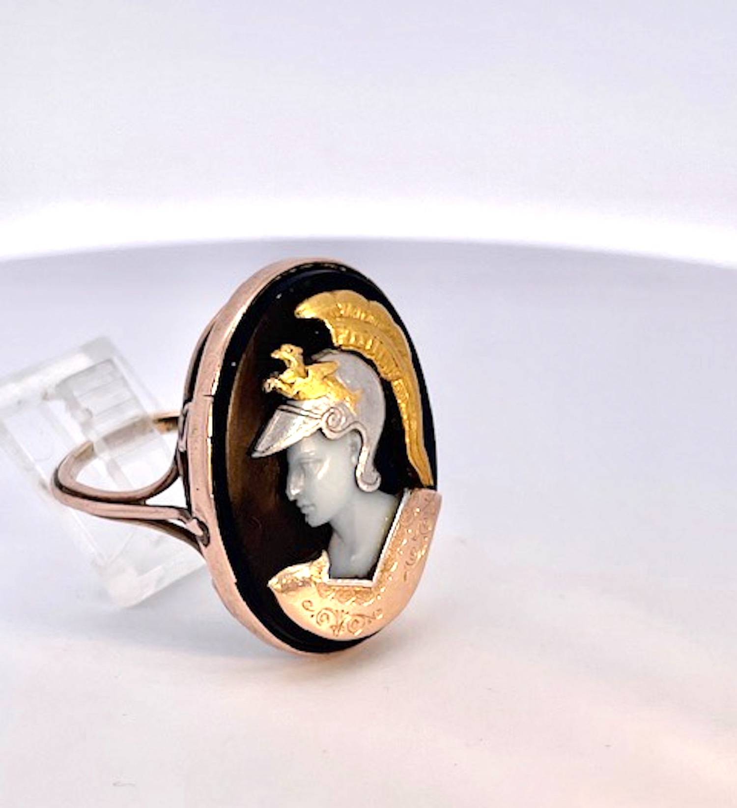 This hardstone Cameo Habille ring is from the 1960's, it features a Sardonyx Cameo depicting Althena. This Cameo is called Habille, the french name for "dressed up" as it has applied gold, Rose, White and Yellow upon the Cameo. This piece is in nice condition with only a trace of damage to Althena's nose. You cannot see this without a 10 x loop. There are small chips around the base but it does not distract from the beauty of this piece. The applied Gold is in the helmet and breastplate. The ring is set with a wire band and measures 3.0 x 2.30 and is a size V English, Japanese and French size 24, American size 10.5. This is unique and beautiful.