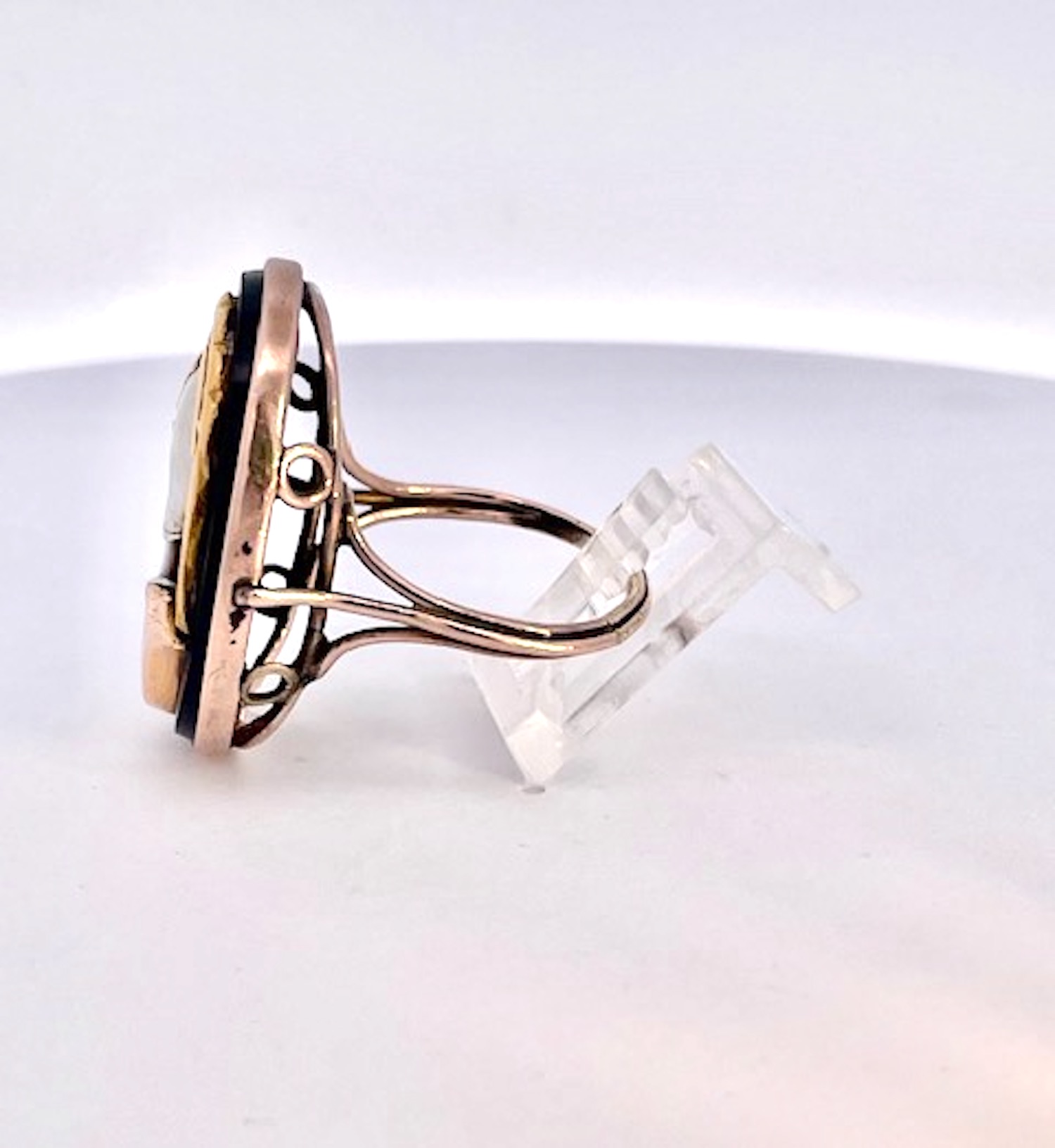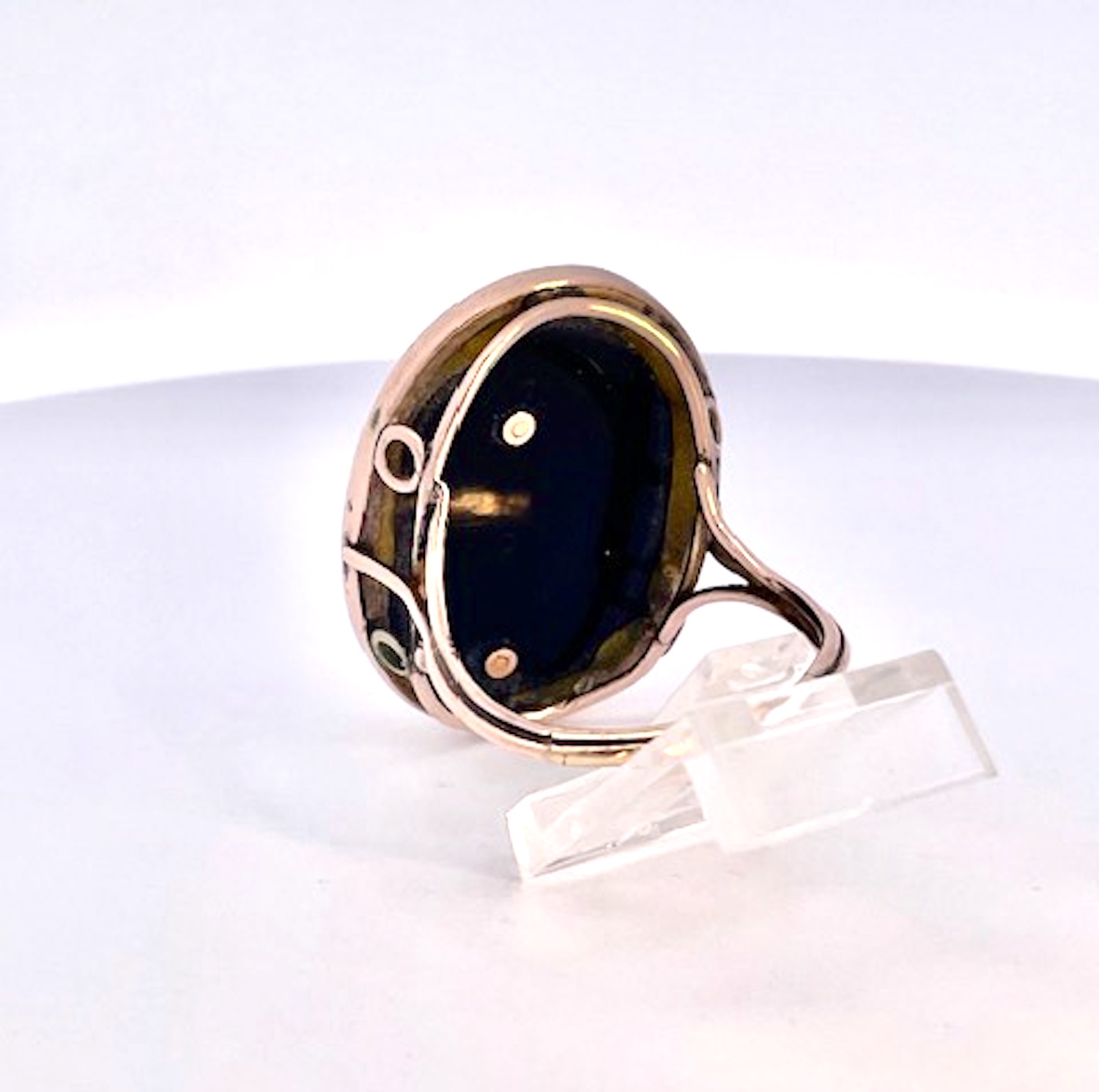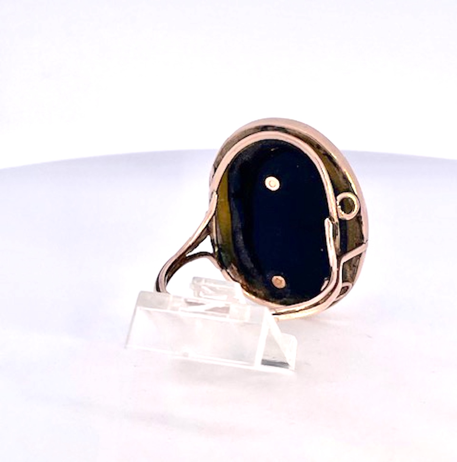 This hardstone Cameo Habille ring is from the 1960's, it features a Sardonyx Cameo depicting Althena. This Cameo is called Habille, the french name for "dressed up" as it has applied gold, Rose, White and Yellow upon the Cameo. This piece is in nice condition with only a trace of damage to Althena's nose. You cannot see this without a 10 x loop. There are small chips around the base but it does not distract from the beauty of this piece. The applied Gold is in the helmet and breastplate. The ring is set with a wire band and measures 3.0 x 2.30 and is a size V English, Japanese and French size 24, American size 10.5. This is unique and beautiful.