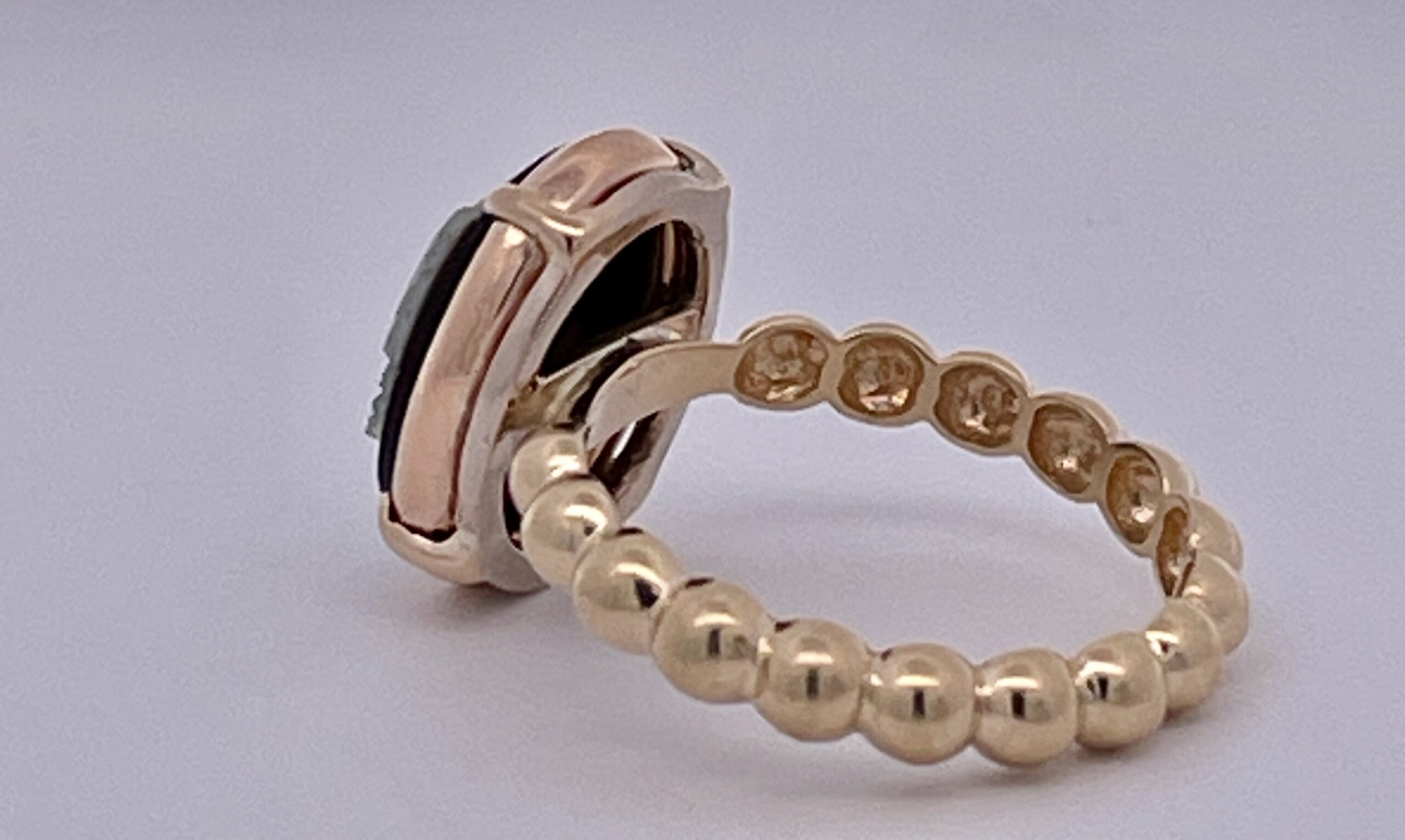 This lovely ring started life as a stick pin but I changed it into a lovely ring. This portrait of a lady is carved on top this hardstone and a nice everyday ring. The size is six and can be resized if needed. It is done in 14K yellow gold and the band is beaded which gives a nice feel to the cameo. This weighs in at 3.84 grams and measures .50 x .25. This ring is small in diameter but it does pack a punch as this is serene and lovely.