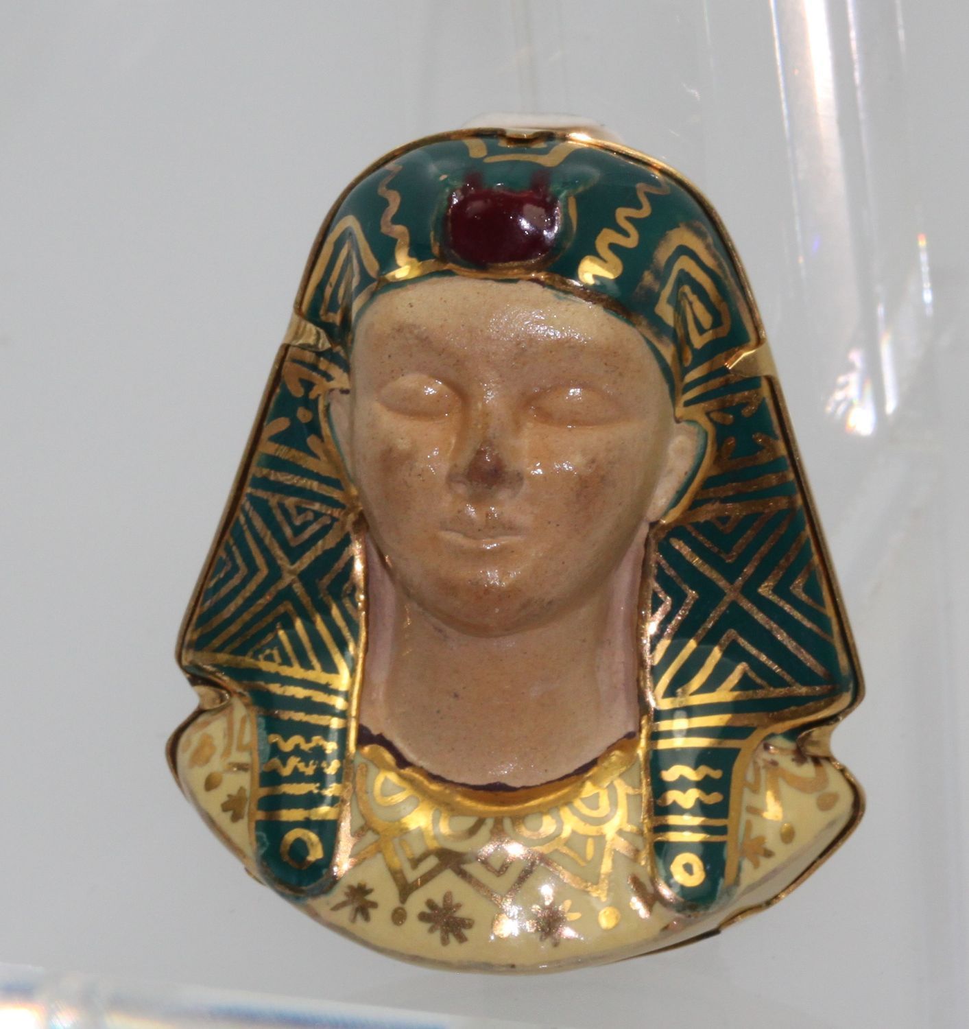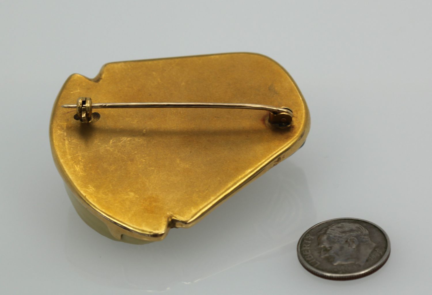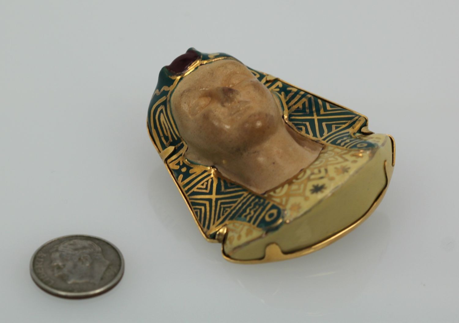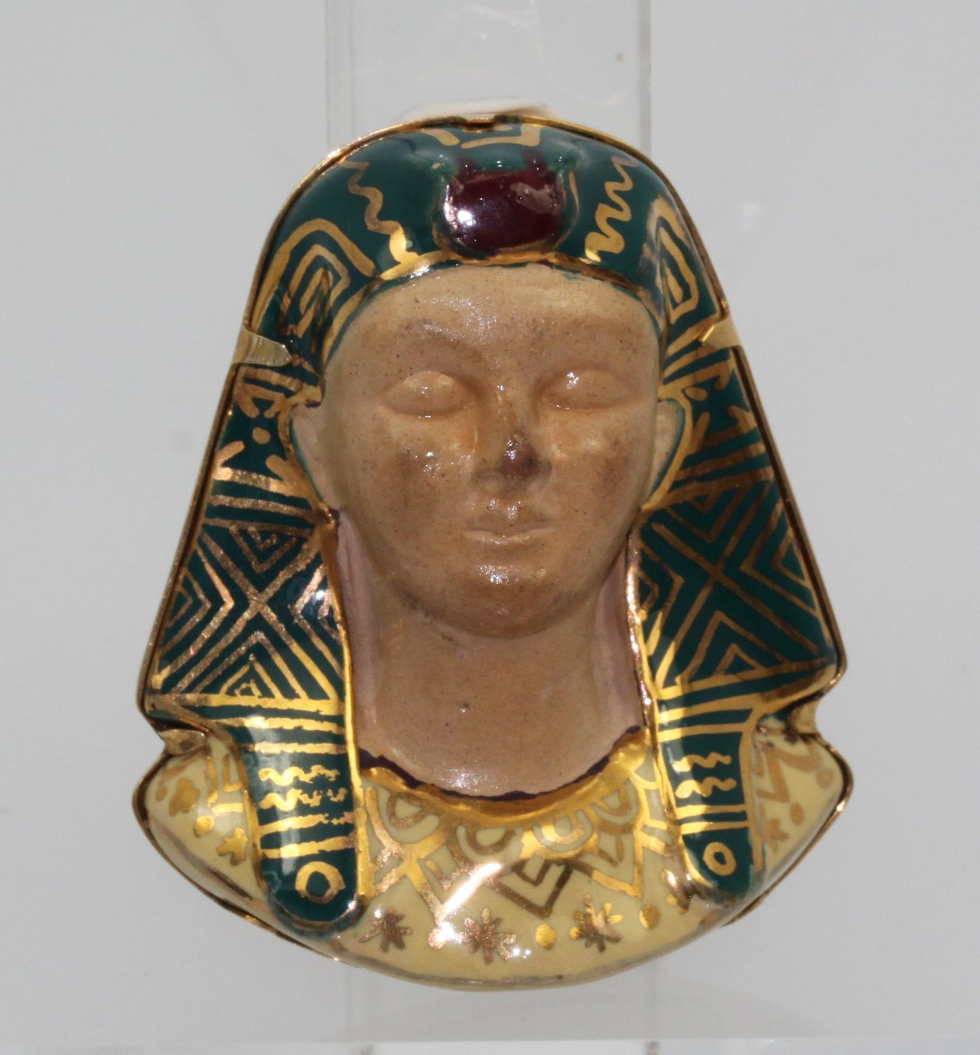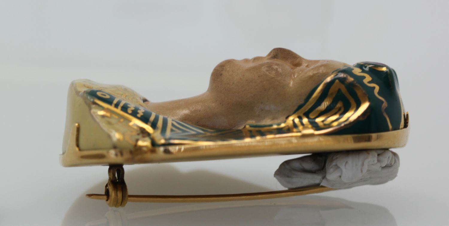 Huge Egyptian Revival Pharaoh Brooch 18K. This gorgeous brooch comes from Italy and although it has no markings, it has been tested as 18k gold with acid. The enamel is nearly perfect with a slight difference in the enamel markings. The porcelain face could use some cleaning by a professional jeweler to bring it to a like new condition. No chips or cracks, the bottom appears to be separated from the enamel but it is not. Also, this brooch is truly unique in that it is the largest one we have ever seen – the size is just unreal! Check out the weight of this item at nearly 1 ounce of gold.
