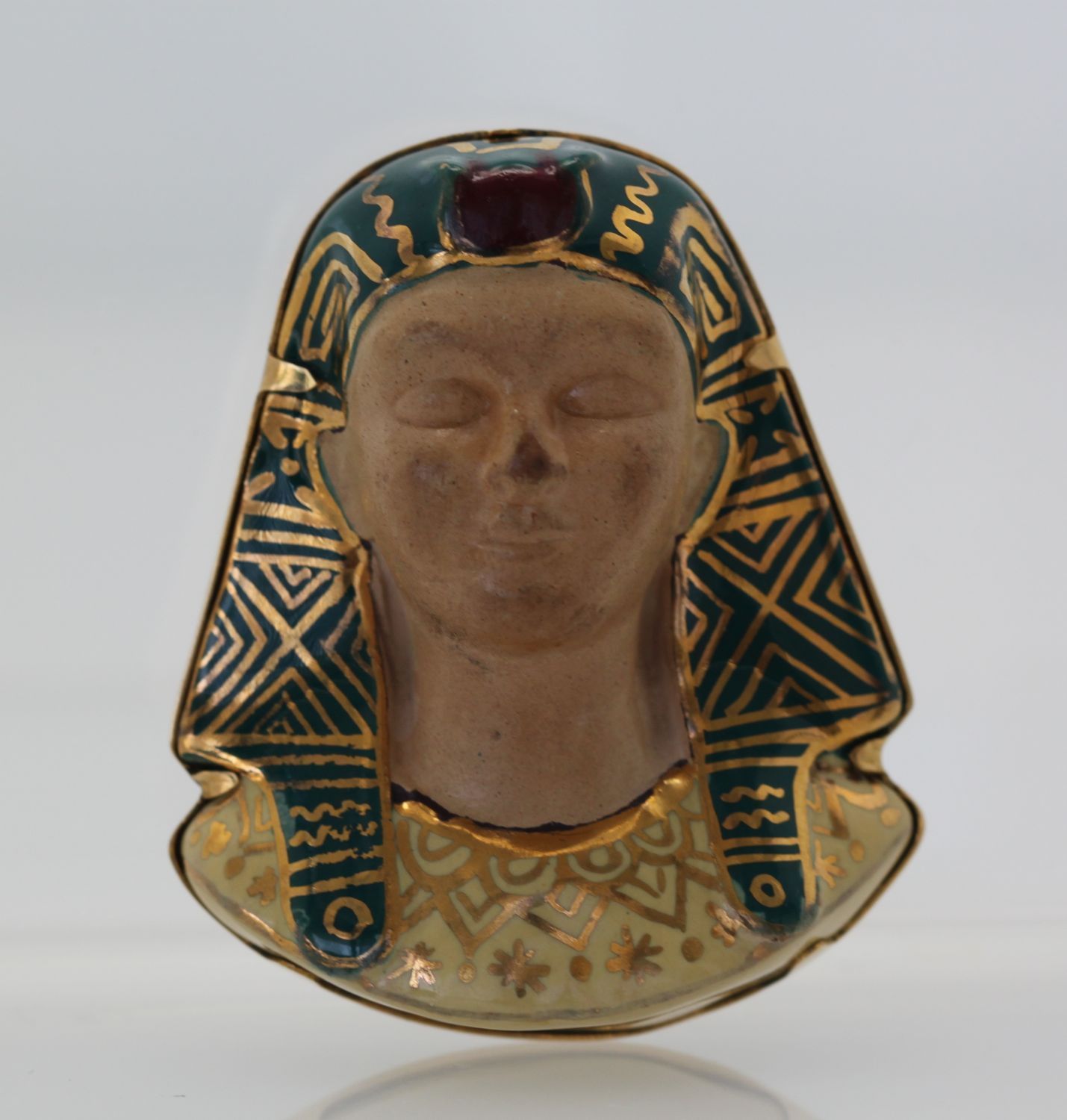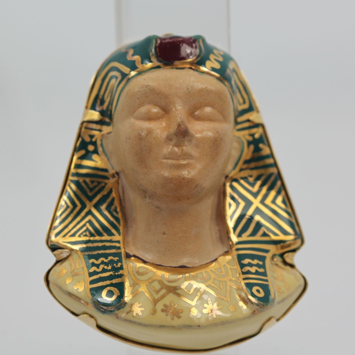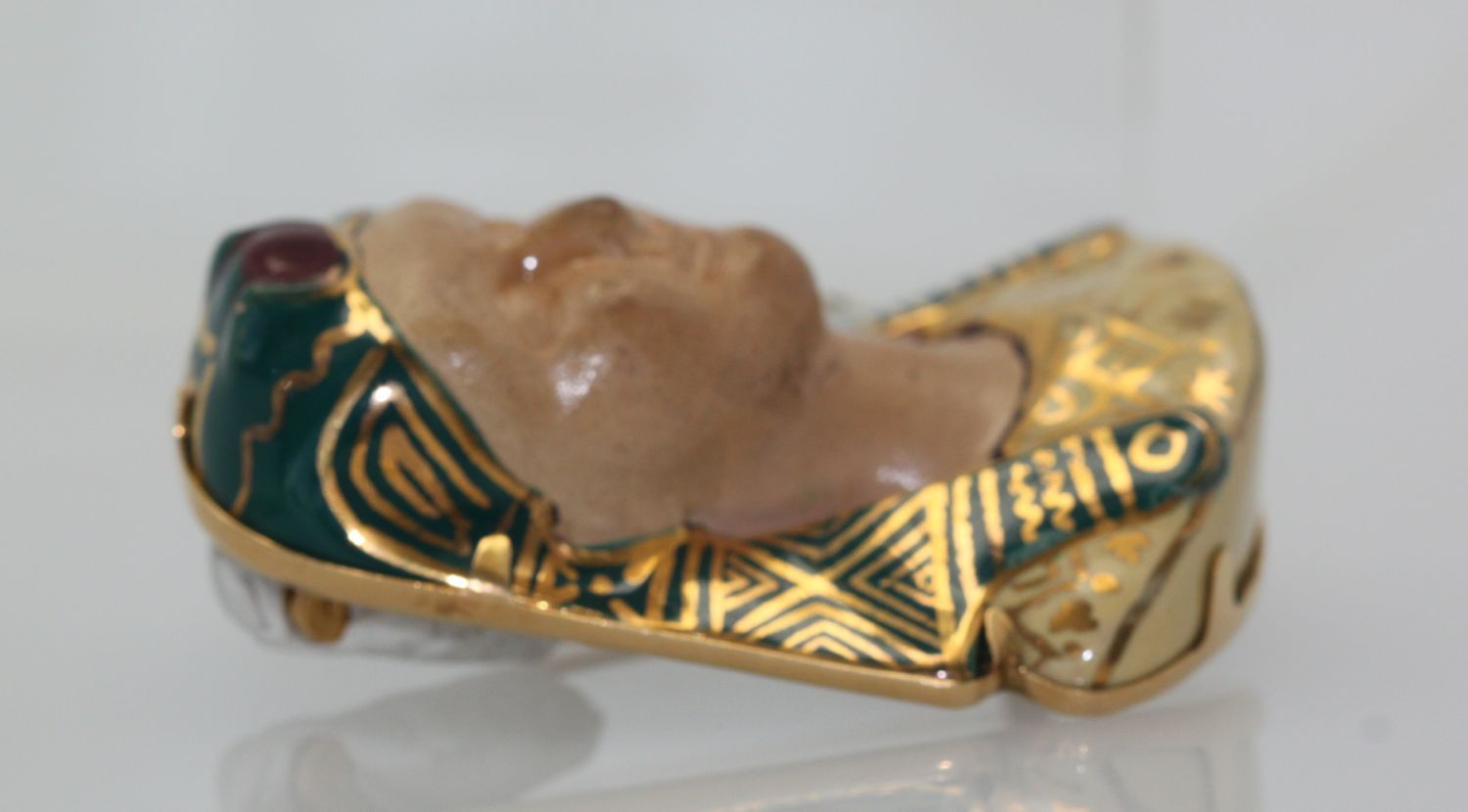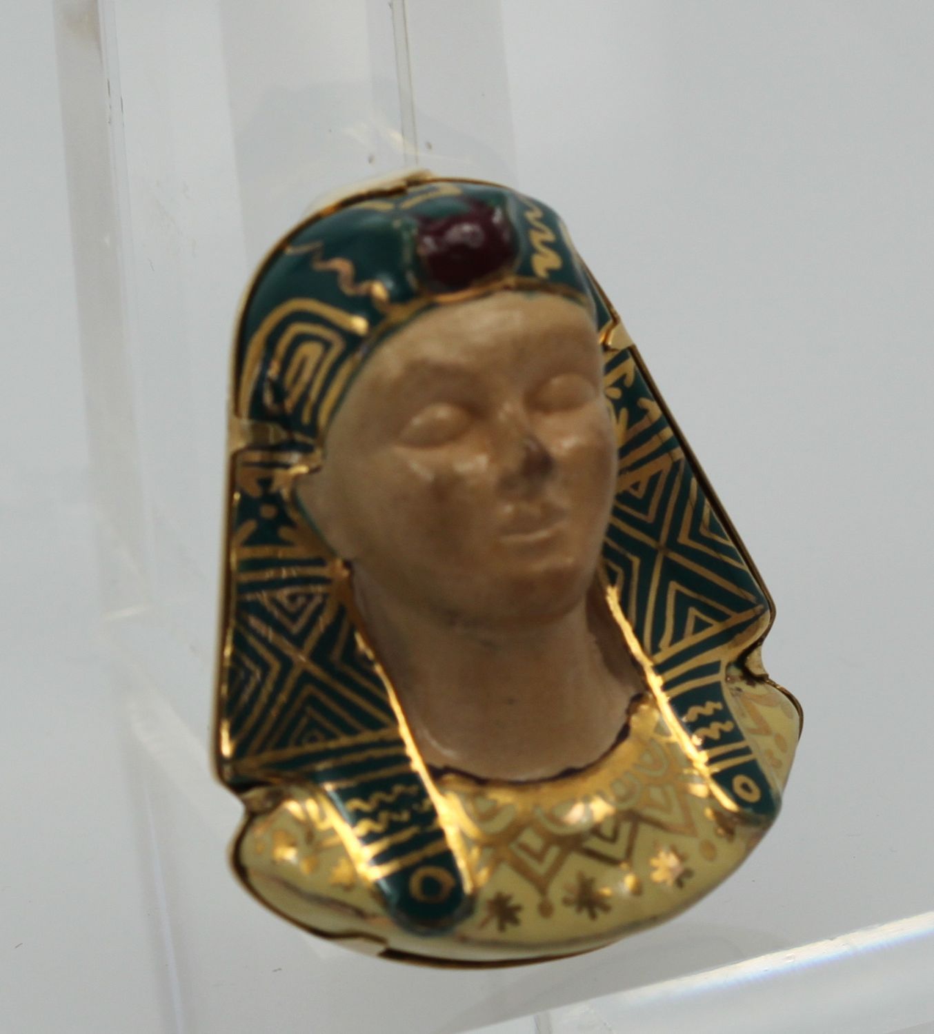 Huge Egyptian Revival Pharaoh Brooch 18K. This gorgeous brooch comes from Italy and although it has no markings, it has been tested as 18k gold with acid. The enamel is nearly perfect with a slight difference in the enamel markings. The porcelain face could use some cleaning by a professional jeweler to bring it to a like new condition. No chips or cracks, the bottom appears to be separated from the enamel but it is not. Also, this brooch is truly unique in that it is the largest one we have ever seen – the size is just unreal! Check out the weight of this item at nearly 1 ounce of gold.