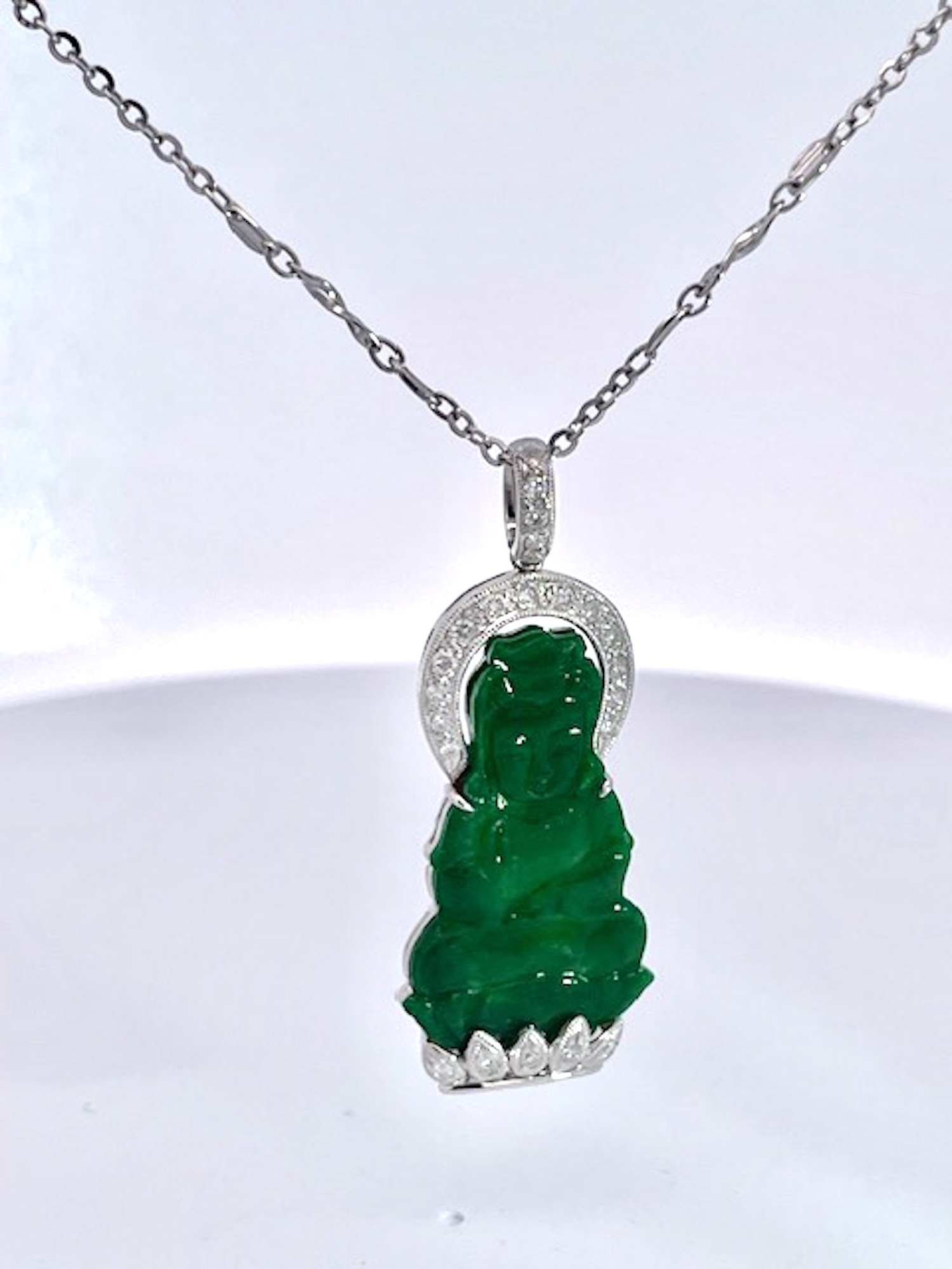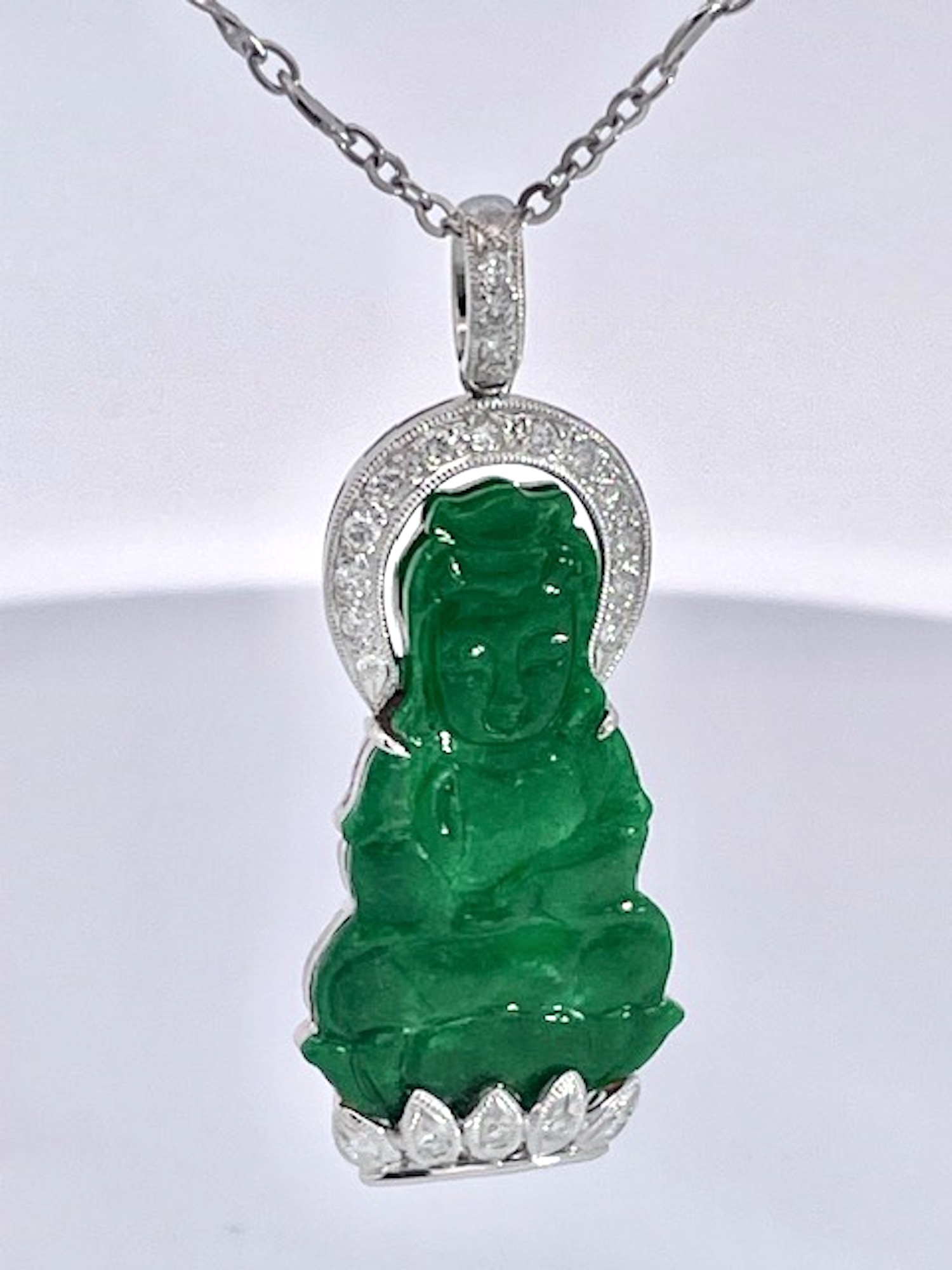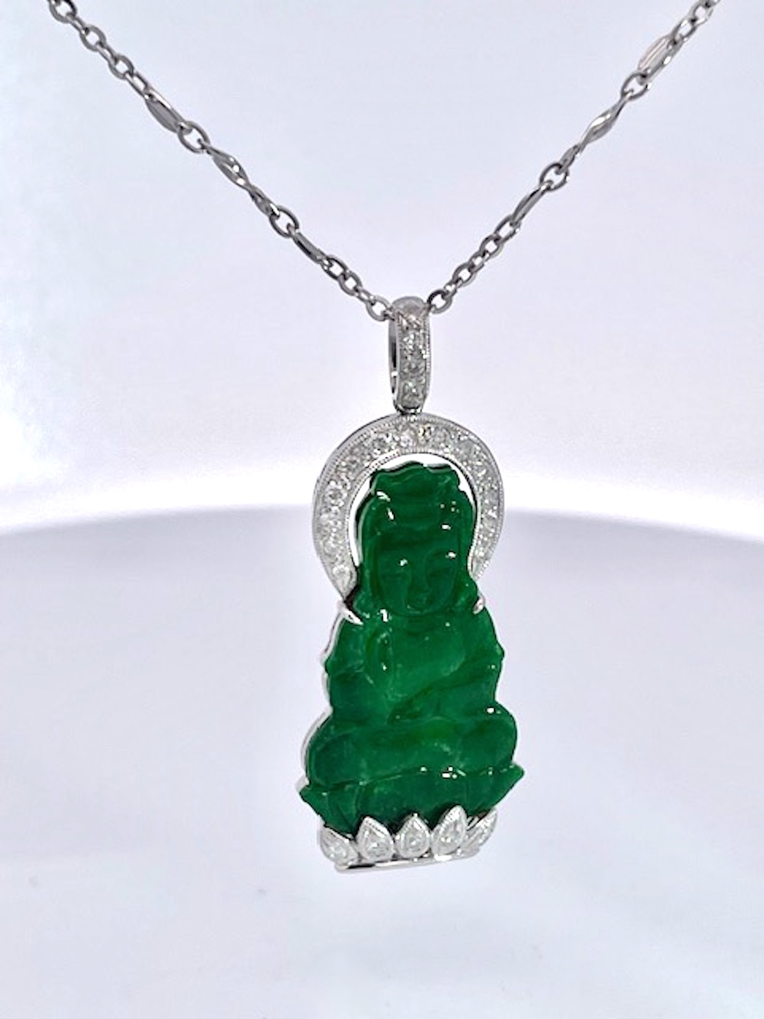 Jade and Diamond Guanyin Kwan Yin Pendant Platinum Chain