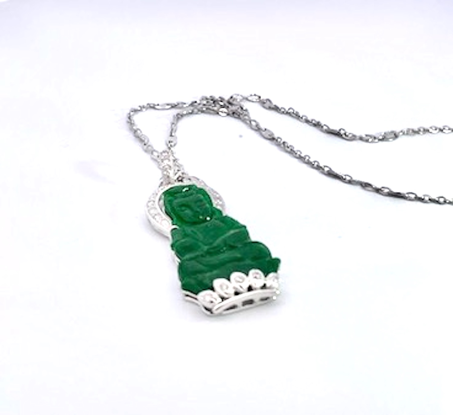 This Guanyin pendant is just beautiful. The pendant depicts a buddha and has a crown in Diamonds and the base of the pendant in Diamonds. This is new and never used. I purchased these to go with my jade pendant earrings, (in another listing) but have decided I have way too much jewelry so I must go thru my pieces and decide what I keep and what I sell. These I am going to sell along with my Jade pendant earrings. Check them out together they make a beautiful statement. For many Asian people this pendant is like a what a crucifix is for Catholic and Christian people. Don't wait it might be too late.