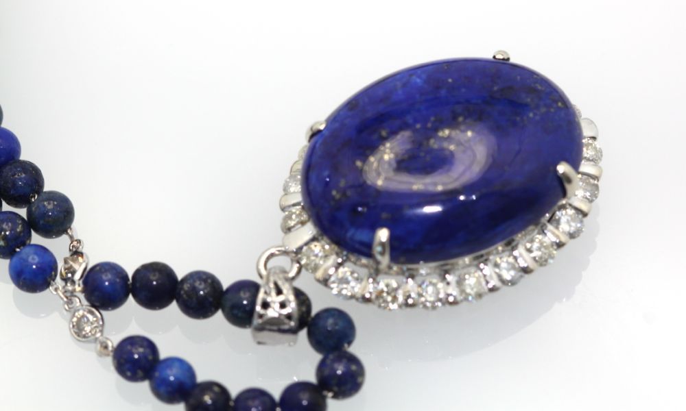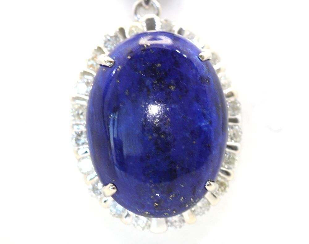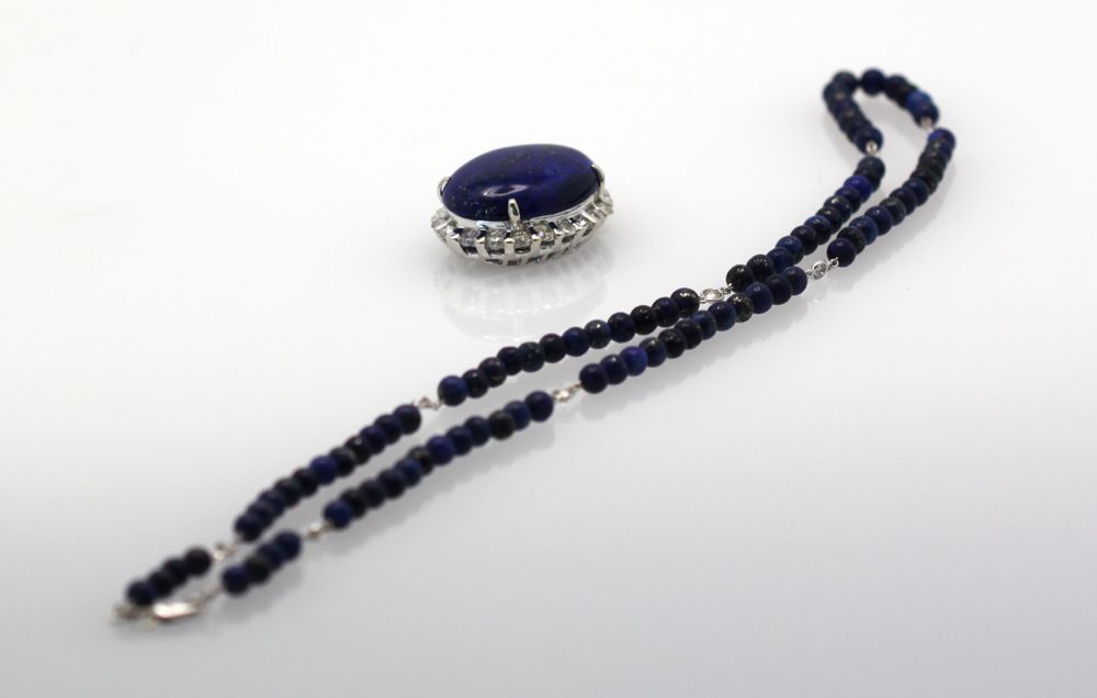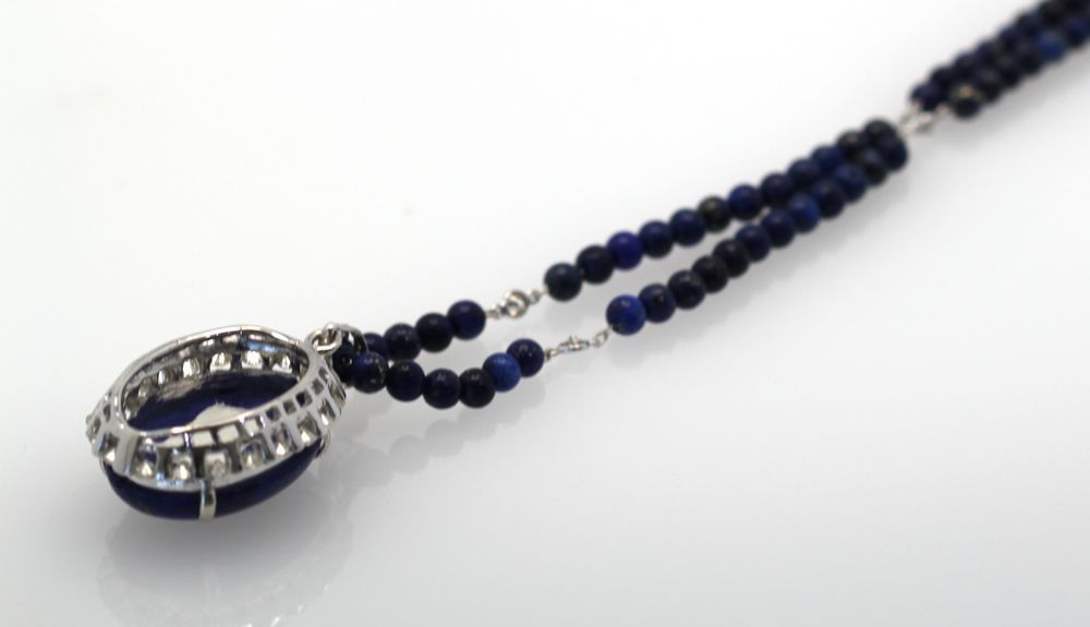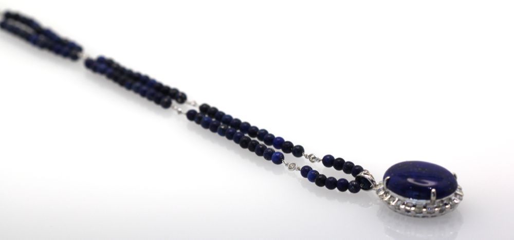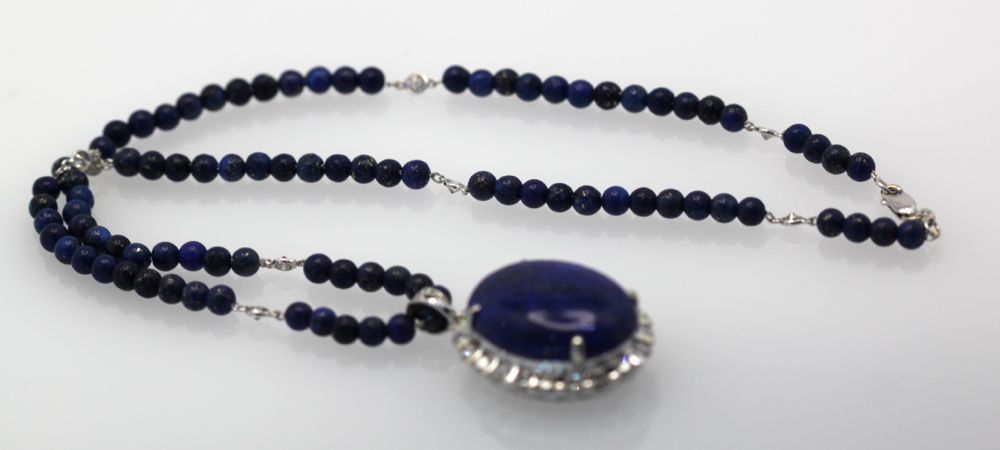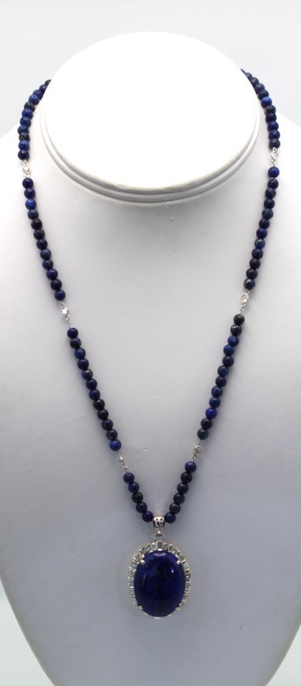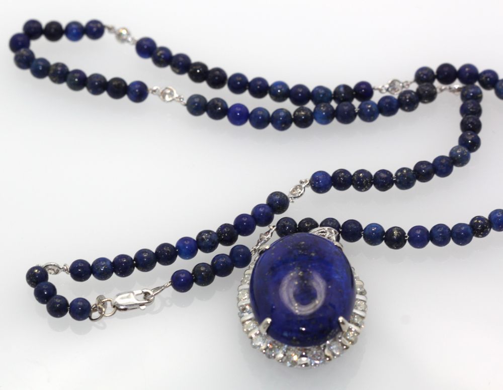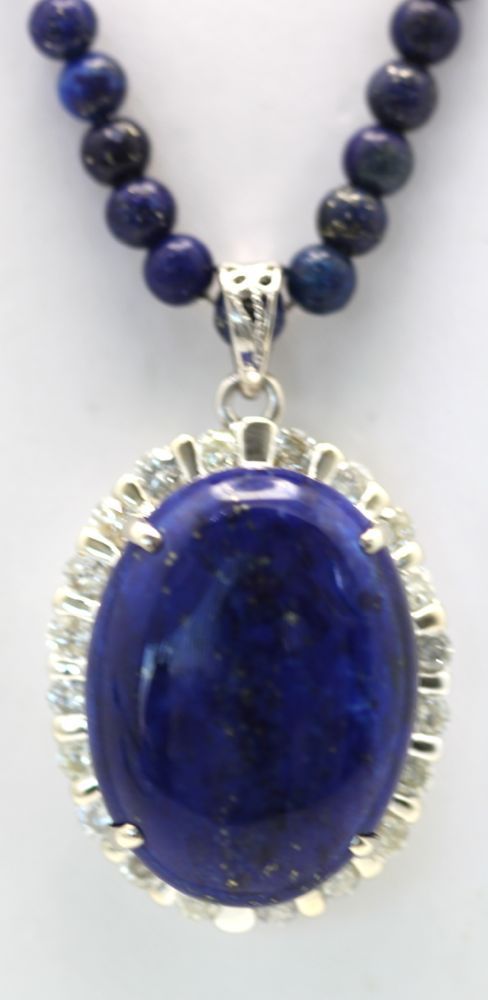 Lapis & Diamond Pendant 18K Beaded Lapis Chain. This extra fine quality lapis lazuli pendant is 25mm in a 30mm 2 carat diamond surround mount. Also, the 4.5mm lapis beads are strung on an 18k white gold chain, which is studded with eight .10 point diamonds for a total of .80 carat.