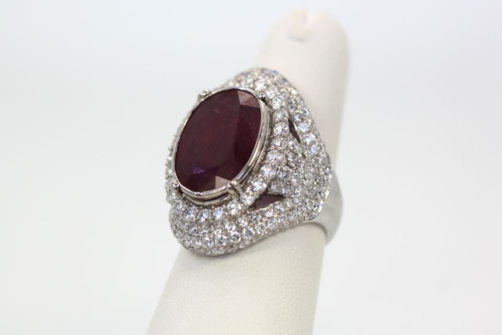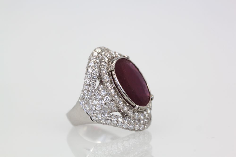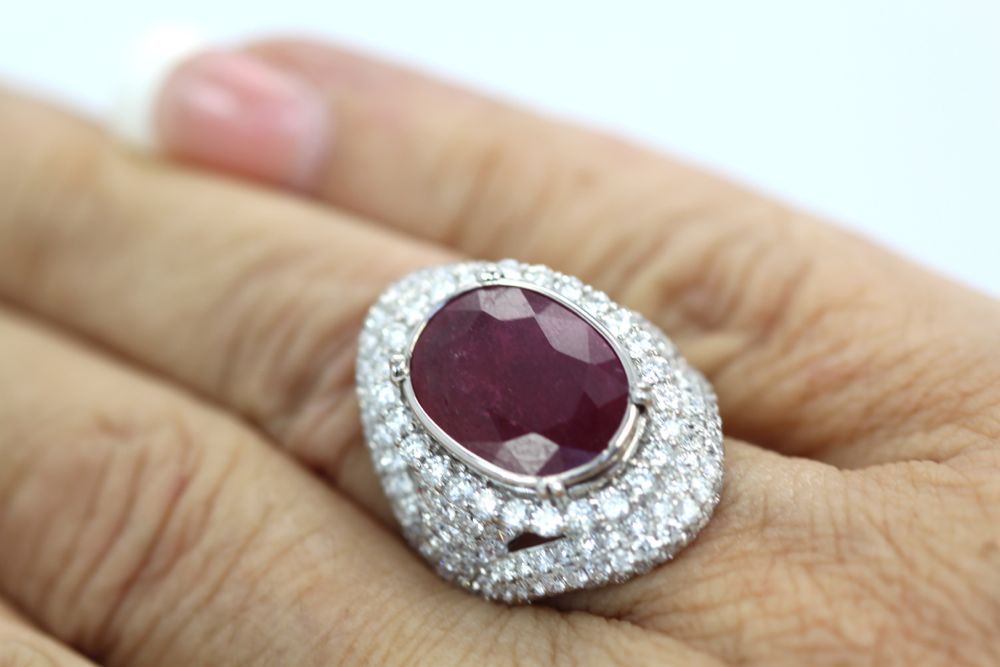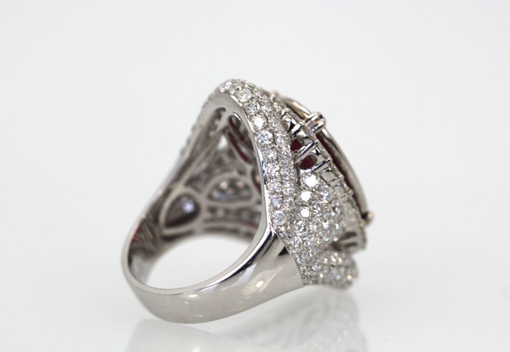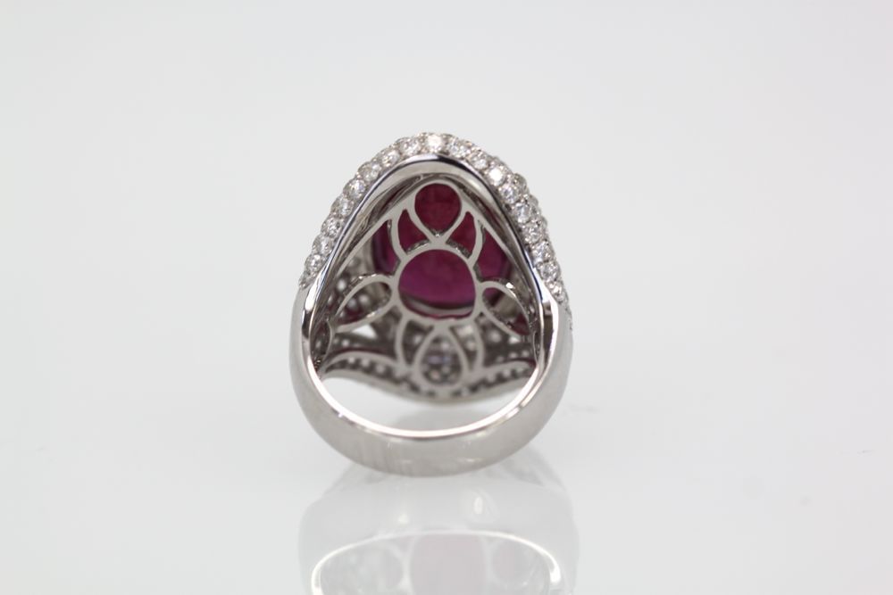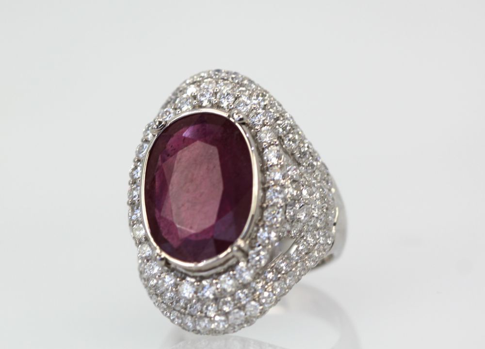 This ruby is beautifully set in an 18k white gold mount with 4.02 carats of beautiful white diamonds.