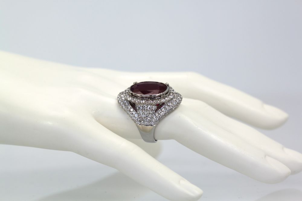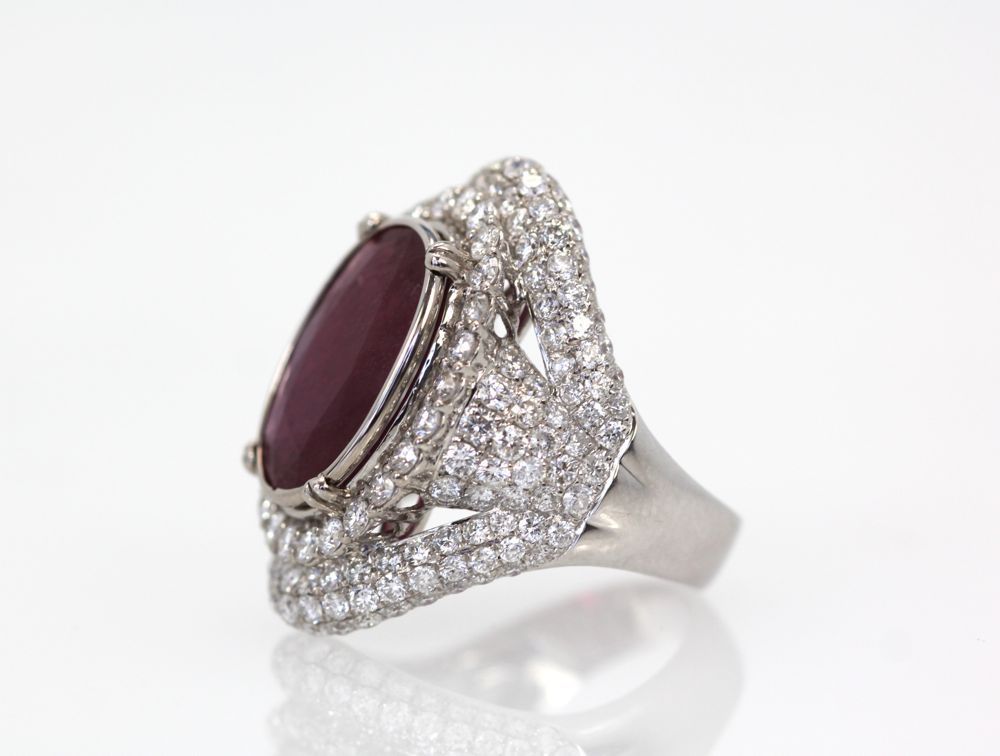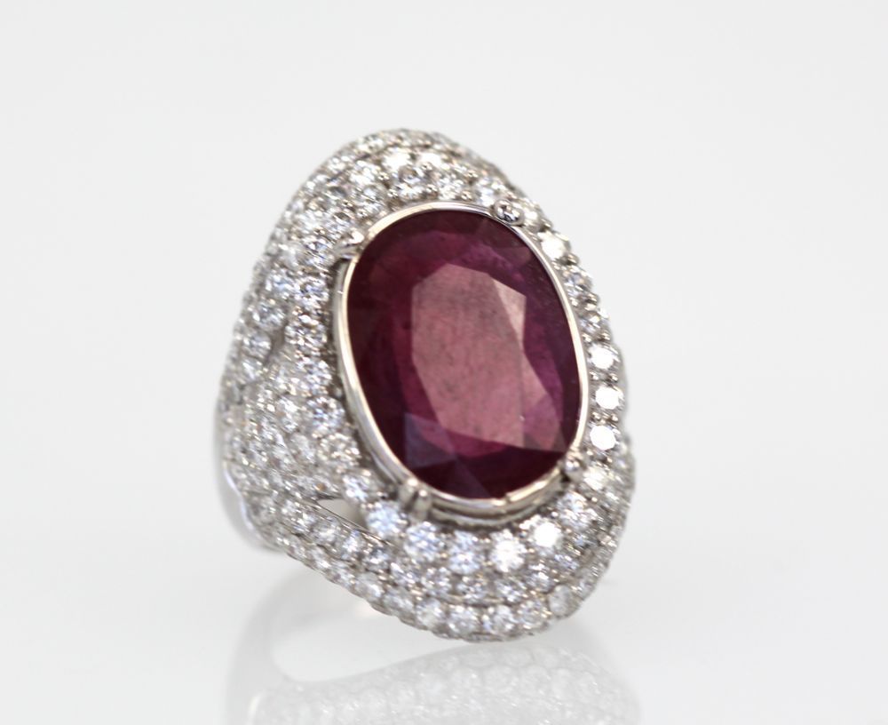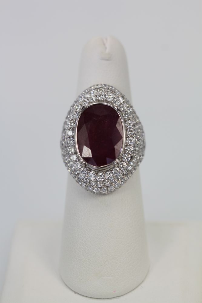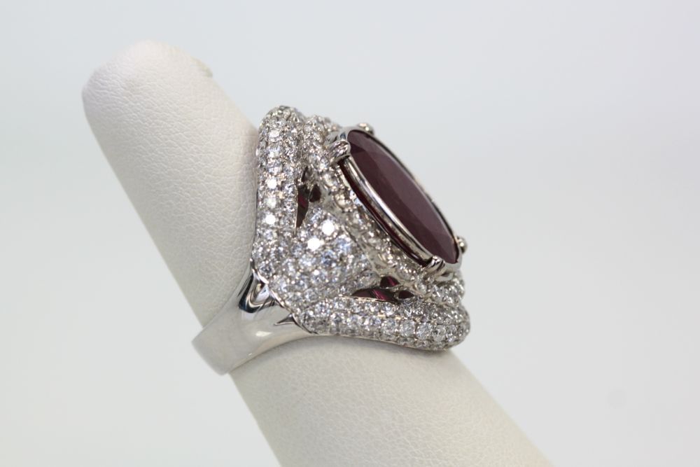 This ruby is beautifully set in an 18k white gold mount with 4.02 carats of beautiful white diamonds.