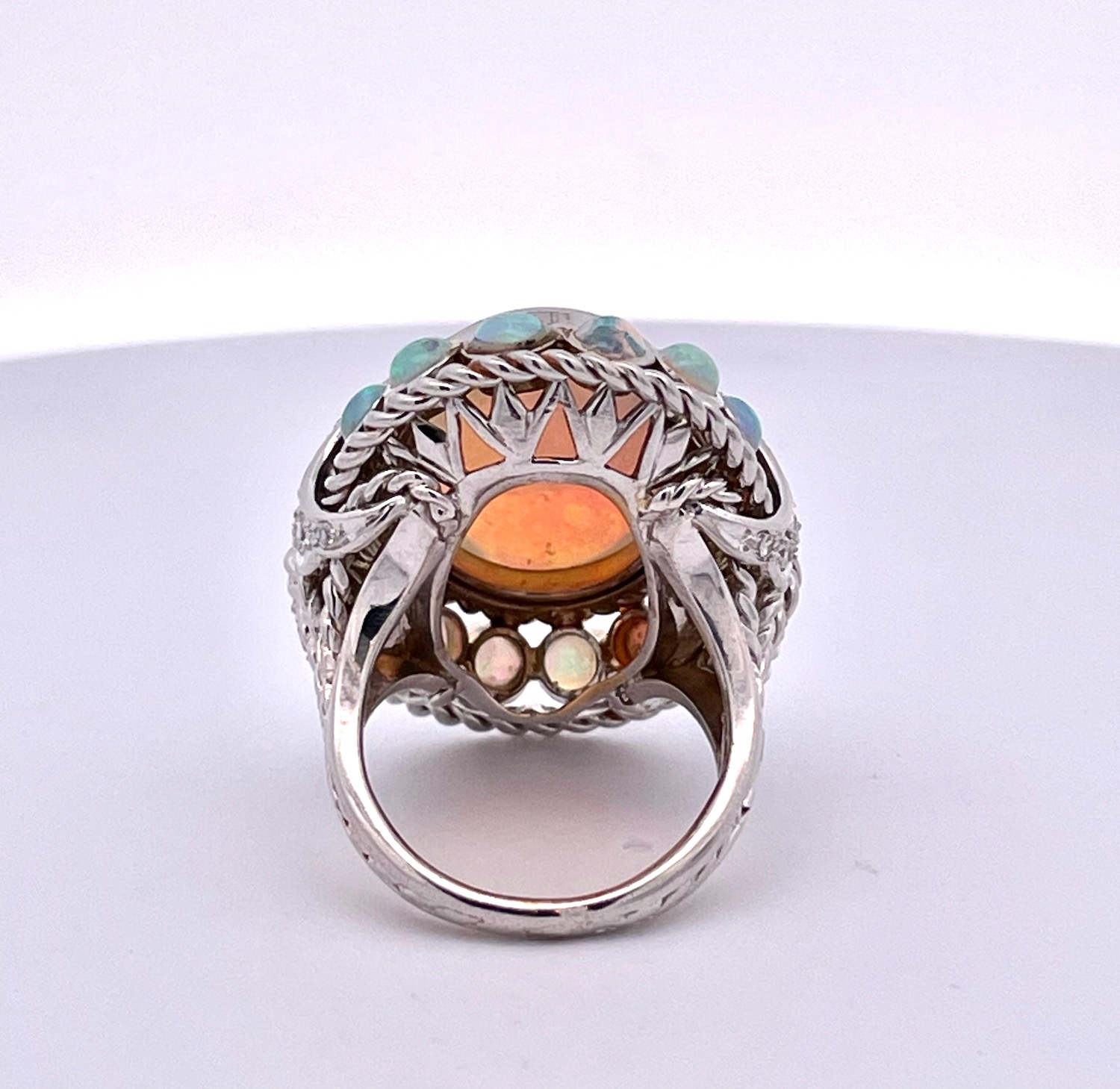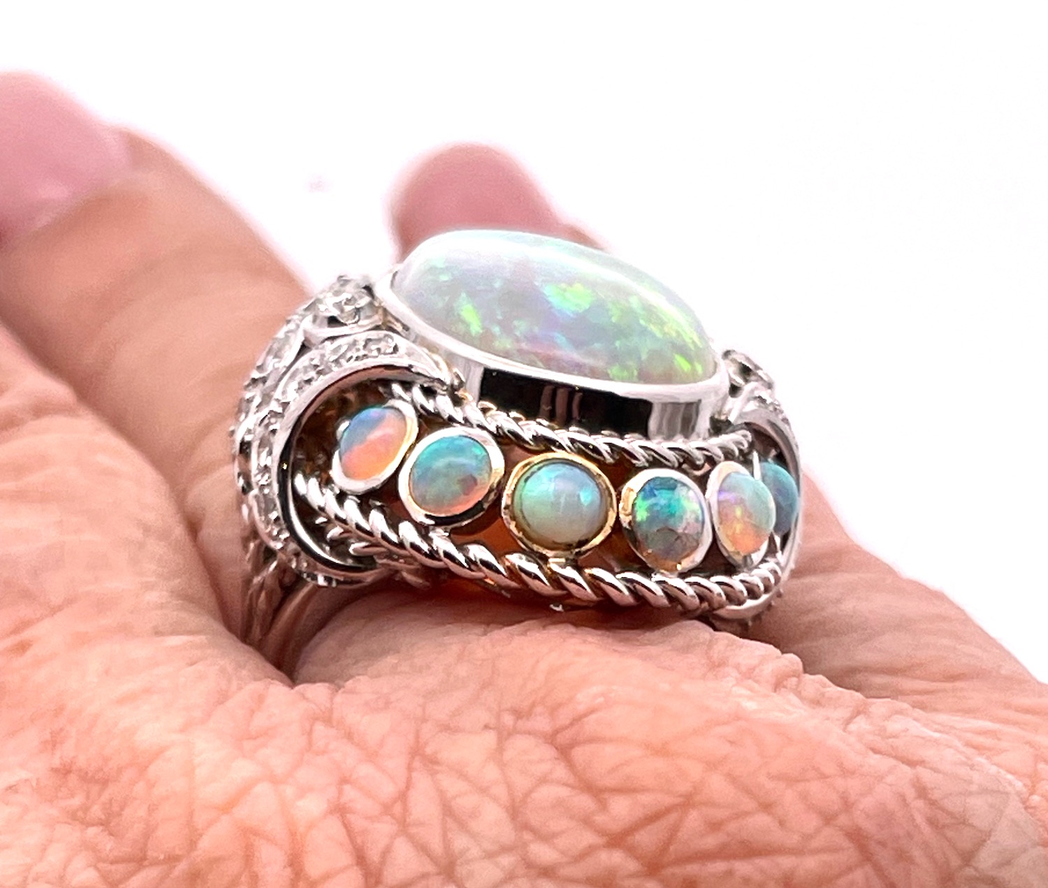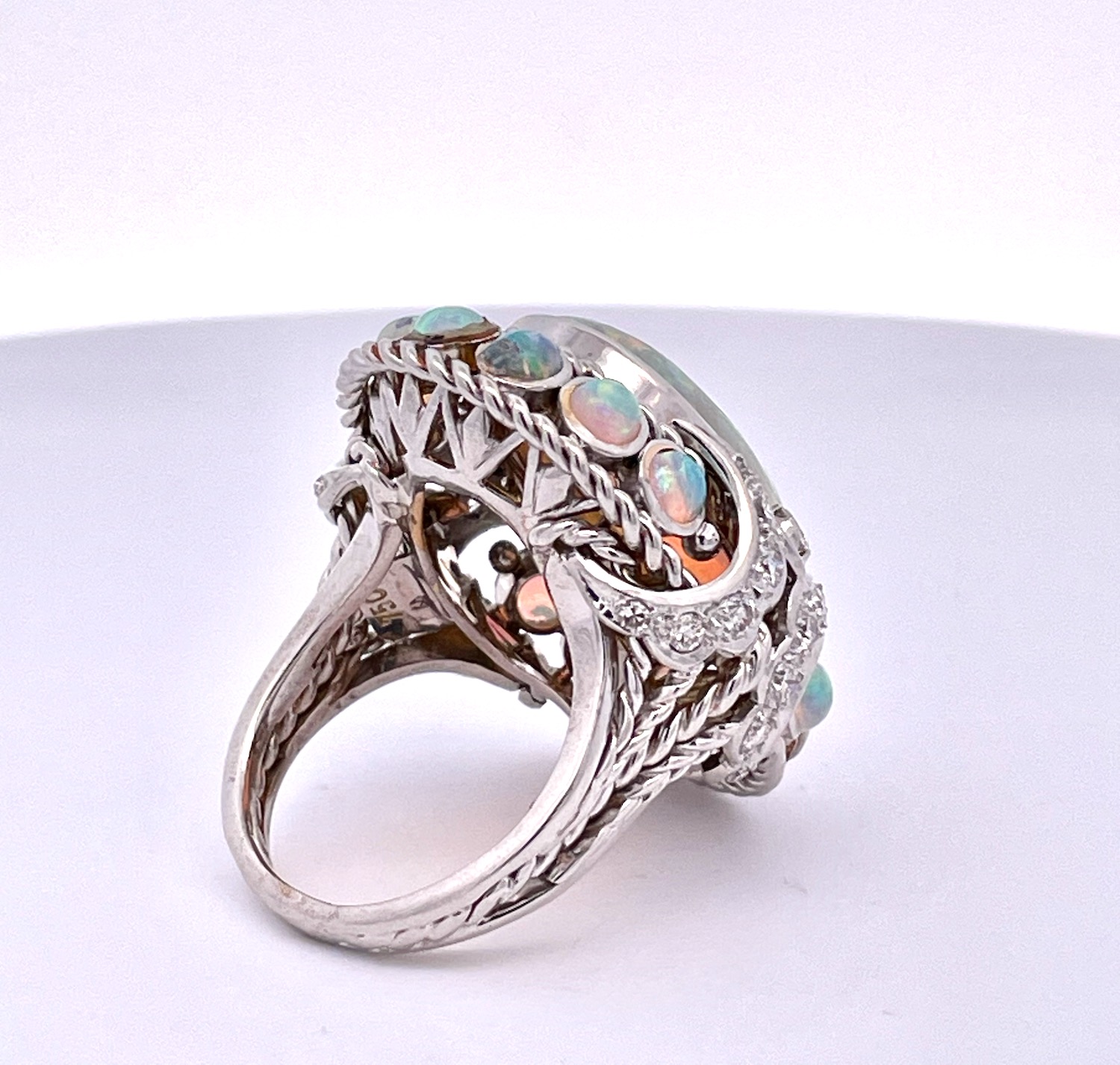This Opal Ring is huge it measures 35mm x 30mm and has beautiful matrix of Blue, Pink, and Yellow. This cocktail ring has an Opal of 19.82 x 14.82 x 12.90 deep and weighs in at 20.19 grams. It also has 12 smaller Opals of the same color around the center bottom and sides. These Opals are about 0.40 carats each. This ring is fully chased and detailed underneath. This ring is sizable but comes in at 6.75 size. Diamonds surround these stones in a swirl pattern and it also has a twisted rope design throughout. This ring is absolutely gorgeous and it comes out of Switzerland. I would not wait to claim this as your own, I believe it will go fast.