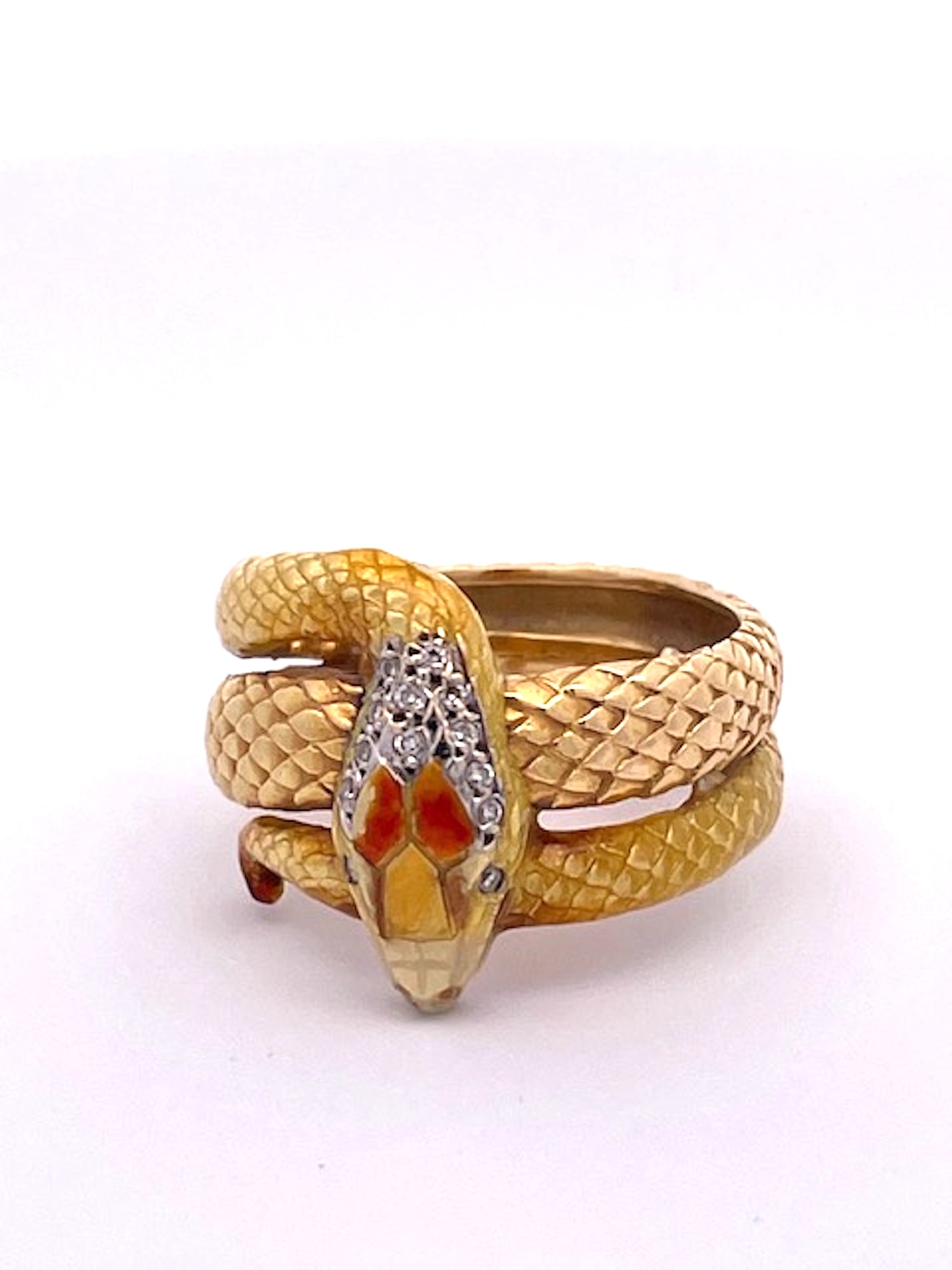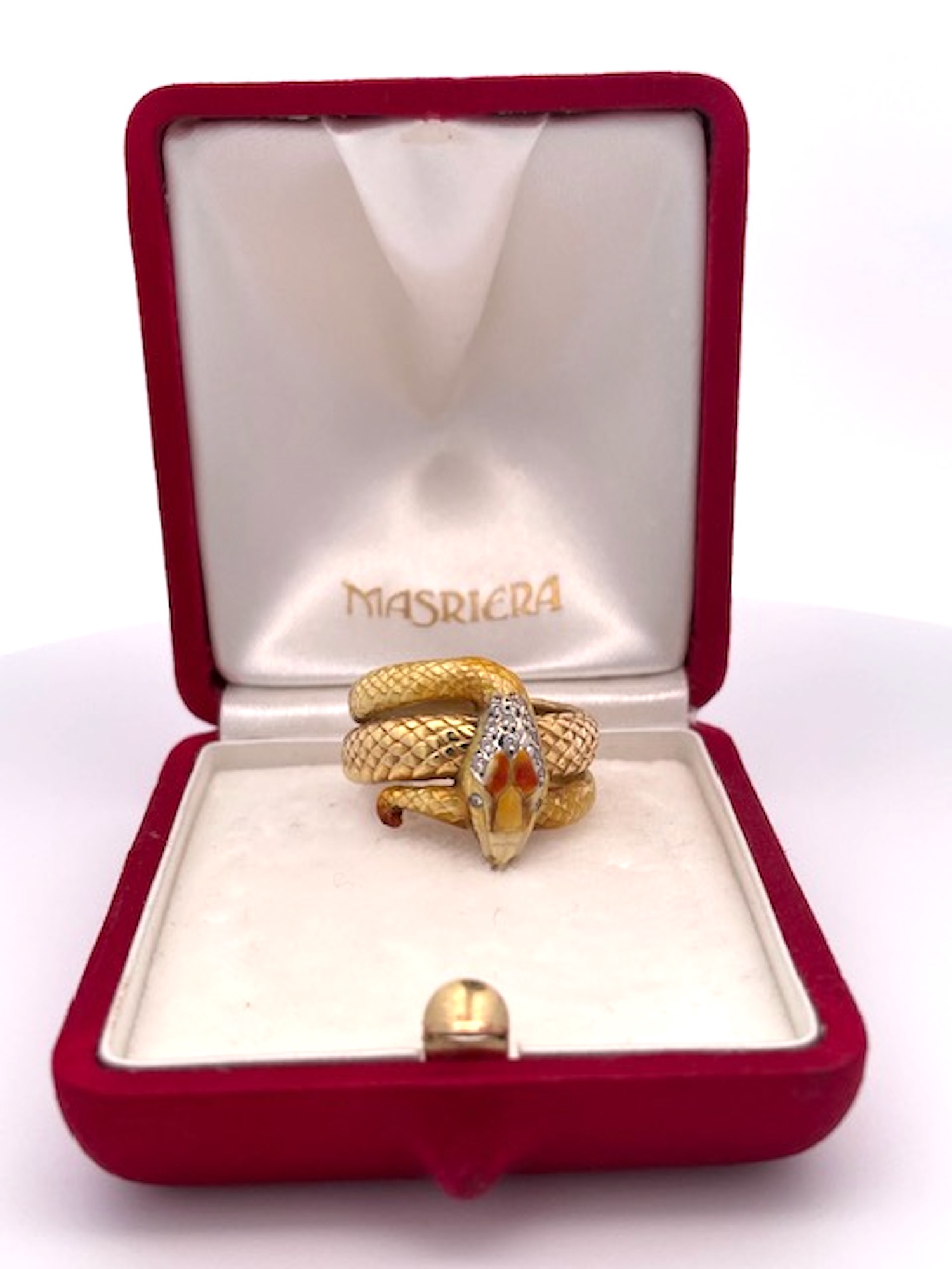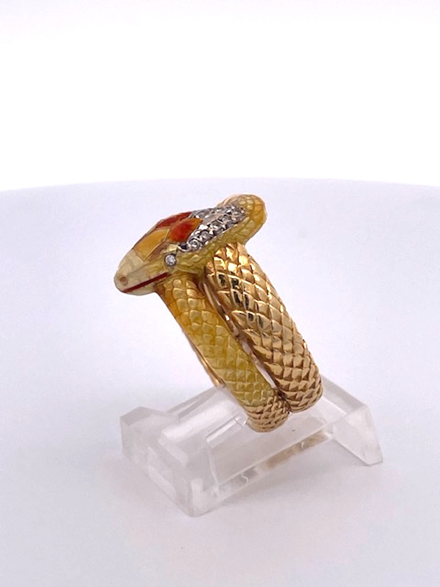 This Masriera Enamel Snake ring is very special. Masriera is known for there Enamel and Plique a Jour pieces. This is designed in the Art Nouveau revival style. This ring features a textured body that resemble snake scales and is done in a highly polished enamel. There is a bit of enamel loss not really noticeable on the head but otherwise it is special. The enamel is done in pale tones of yellow and orange with 13 bead set single cut Diamonds weighing .070 carats. The ring also has a bit of enamel on the tail. The ring is signed Masriera C-4437-C. It is a size 7 and weighs 15.1 gram. If you love Masriera jewelry check out my other Masriera pieces, necklaces, bracelets, pendants etc. This will sell fast so do not wait.