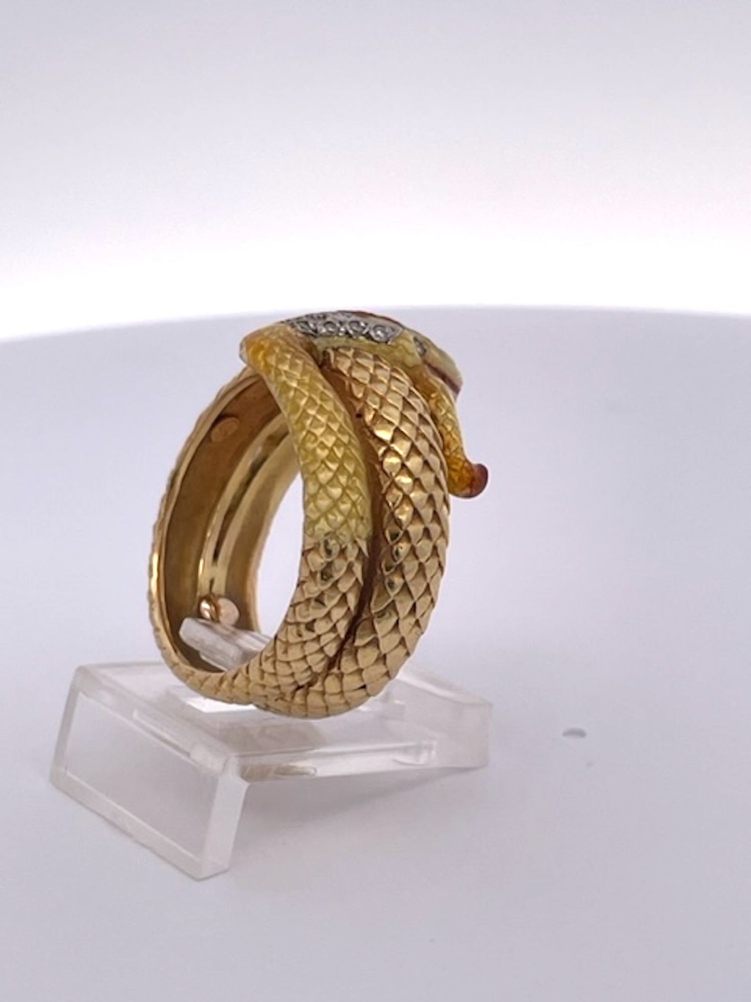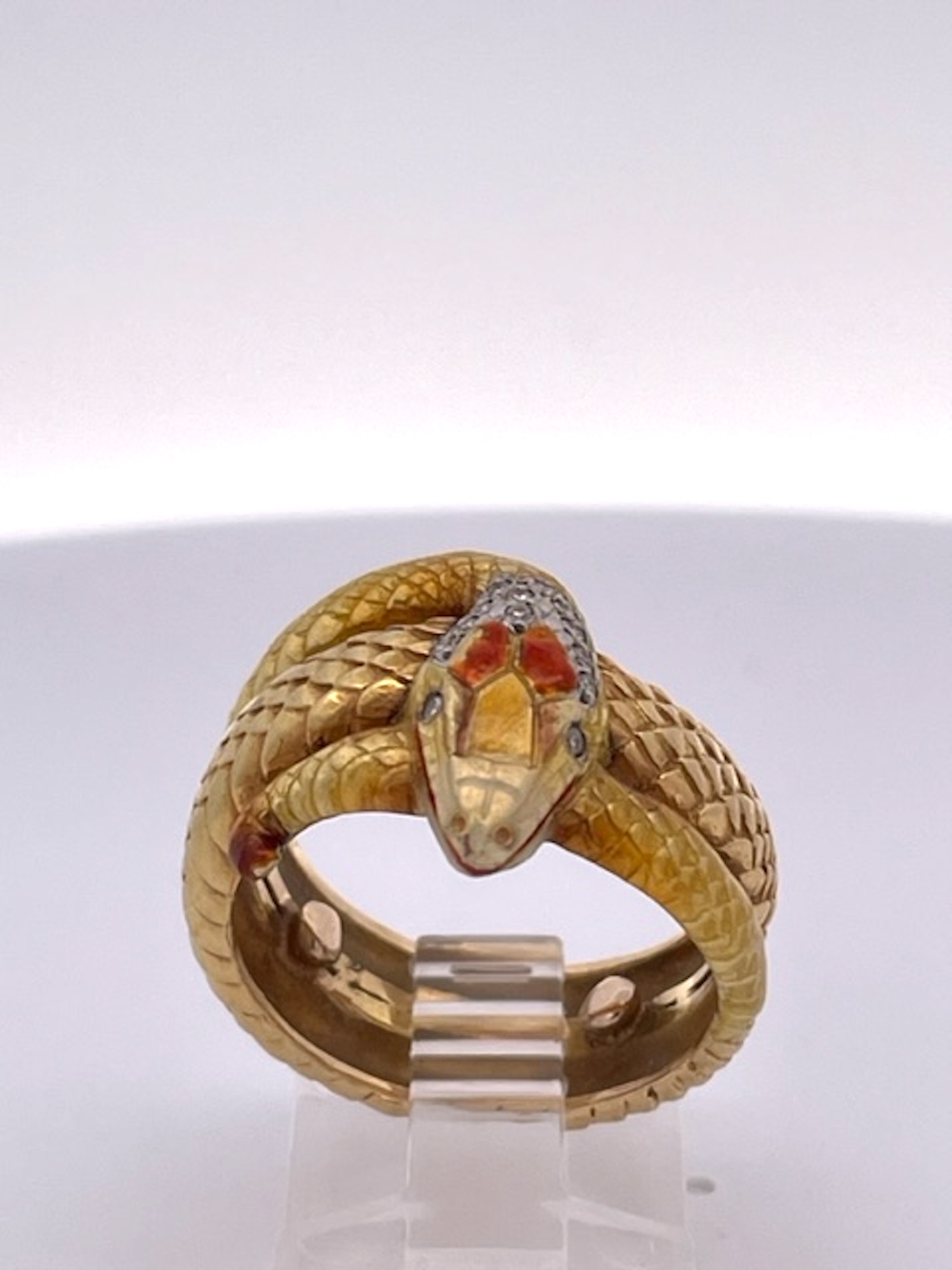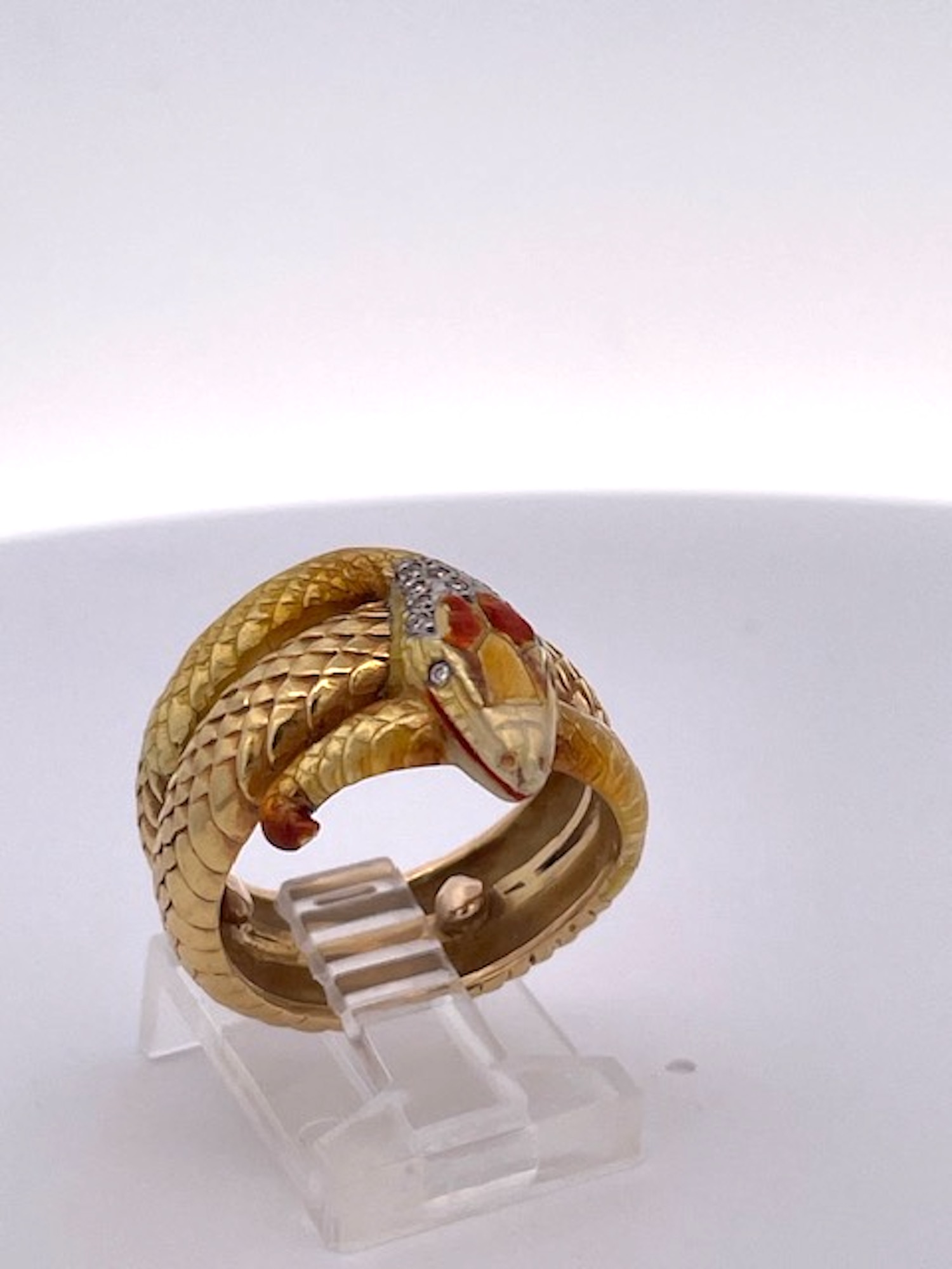 This Masriera Enamel Snake ring is very special. Masriera is known for there Enamel and Plique a Jour pieces. This is designed in the Art Nouveau revival style. This ring features a textured body that resemble snake scales and is done in a highly polished enamel. There is a bit of enamel loss not really noticeable on the head but otherwise it is special. The enamel is done in pale tones of yellow and orange with 13 bead set single cut Diamonds weighing .070 carats. The ring also has a bit of enamel on the tail. The ring is signed Masriera C-4437-C. It is a size 7 and weighs 15.1 gram. If you love Masriera jewelry check out my other Masriera pieces, necklaces, bracelets, pendants etc. This will sell fast so do not wait.
