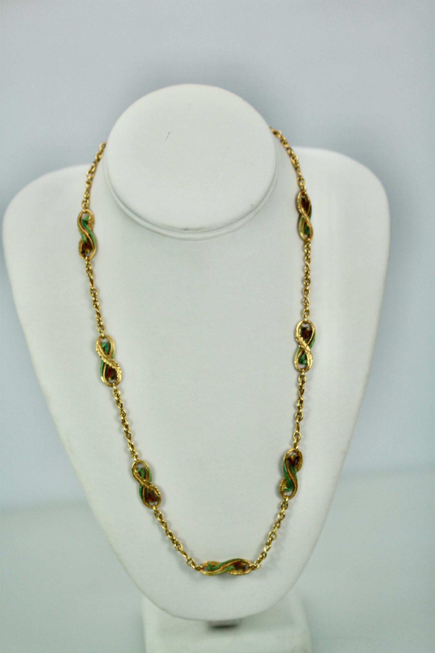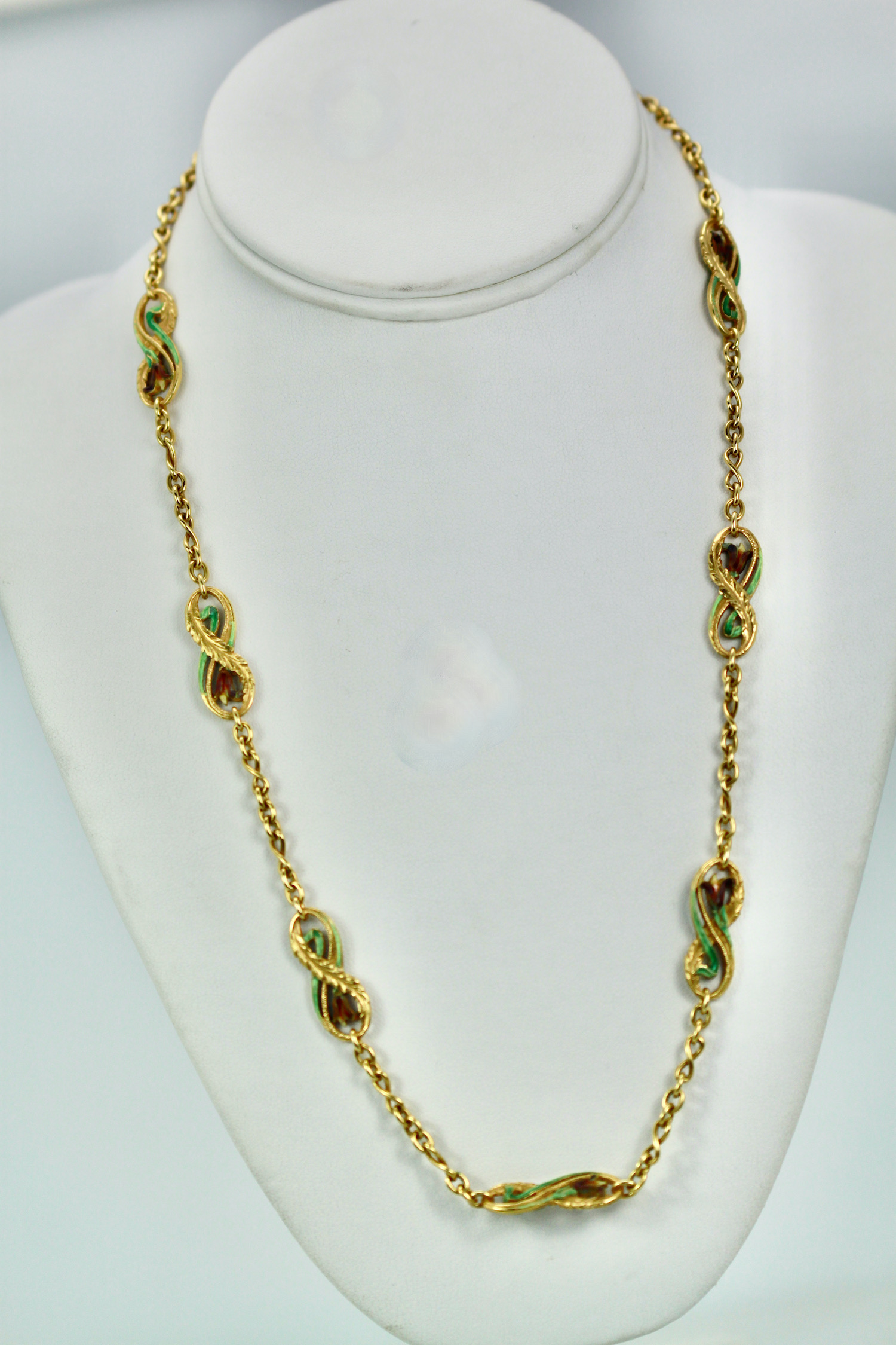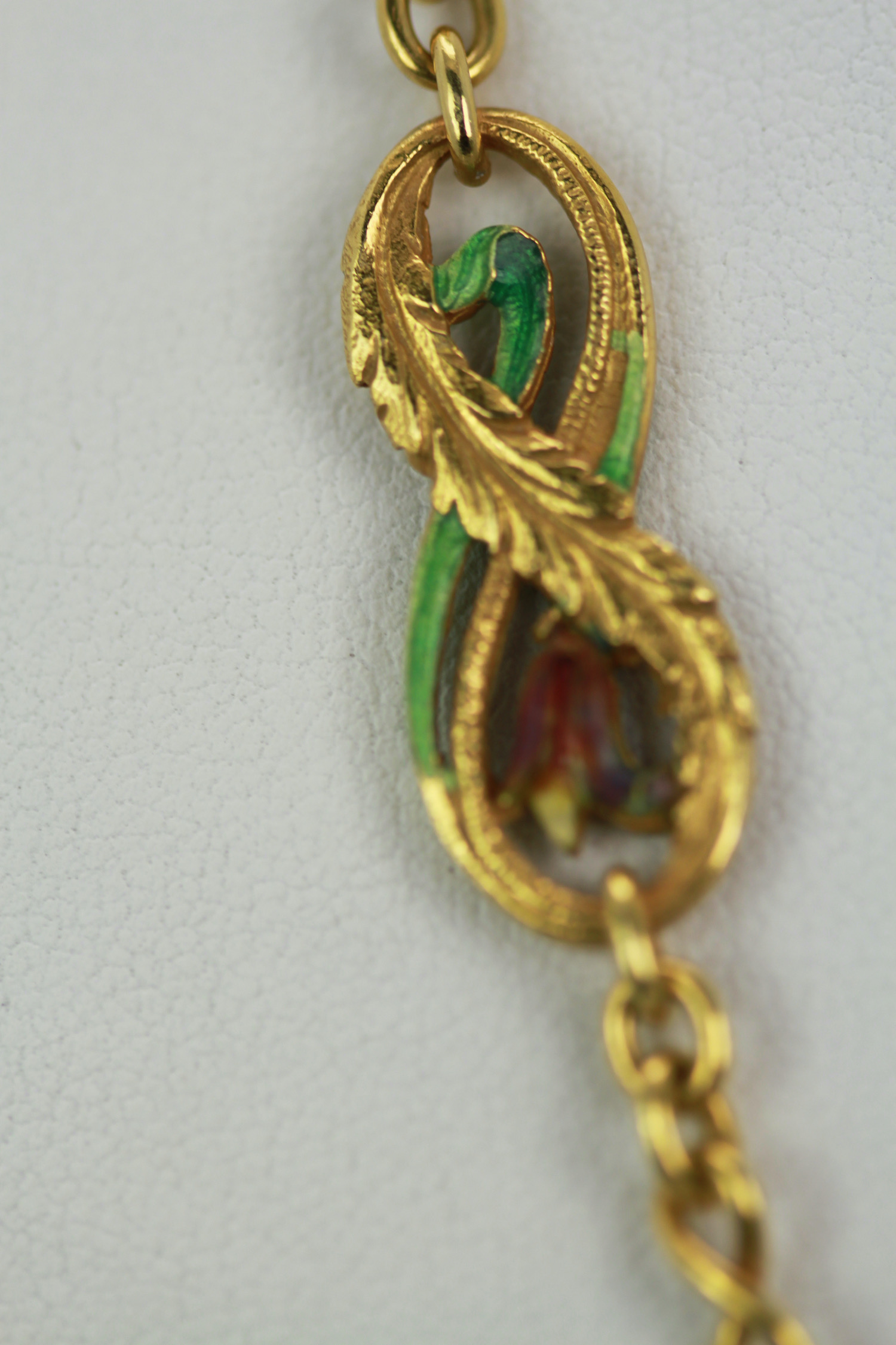 This Masriera Plique a Jour necklace is amazing. Seldom do you find these necklaces as most Masriera pieces are Plique a Jour women pendants. Plique a jour necklaces are rare by any manufacturer but for plique a jour you can not do better than a Masriera piece. This chain is 22" long and the chain has 9 stations each with plique a Jour flowers that look like Iris's These enamel flowers are the colors of green and deep rose to maroon. This necklace boosts 44.4 grams of gold. Signed and numbered 750, A377A each station is 2.5cm long and 1 cm wide. Do not wait if you are a Masriera collector this will not last, this is awesome and so beautiful.