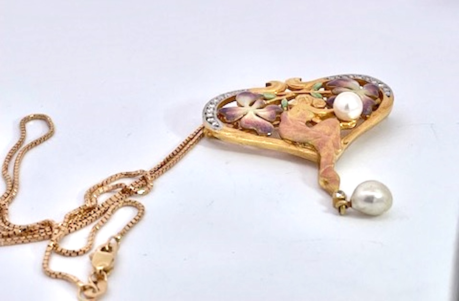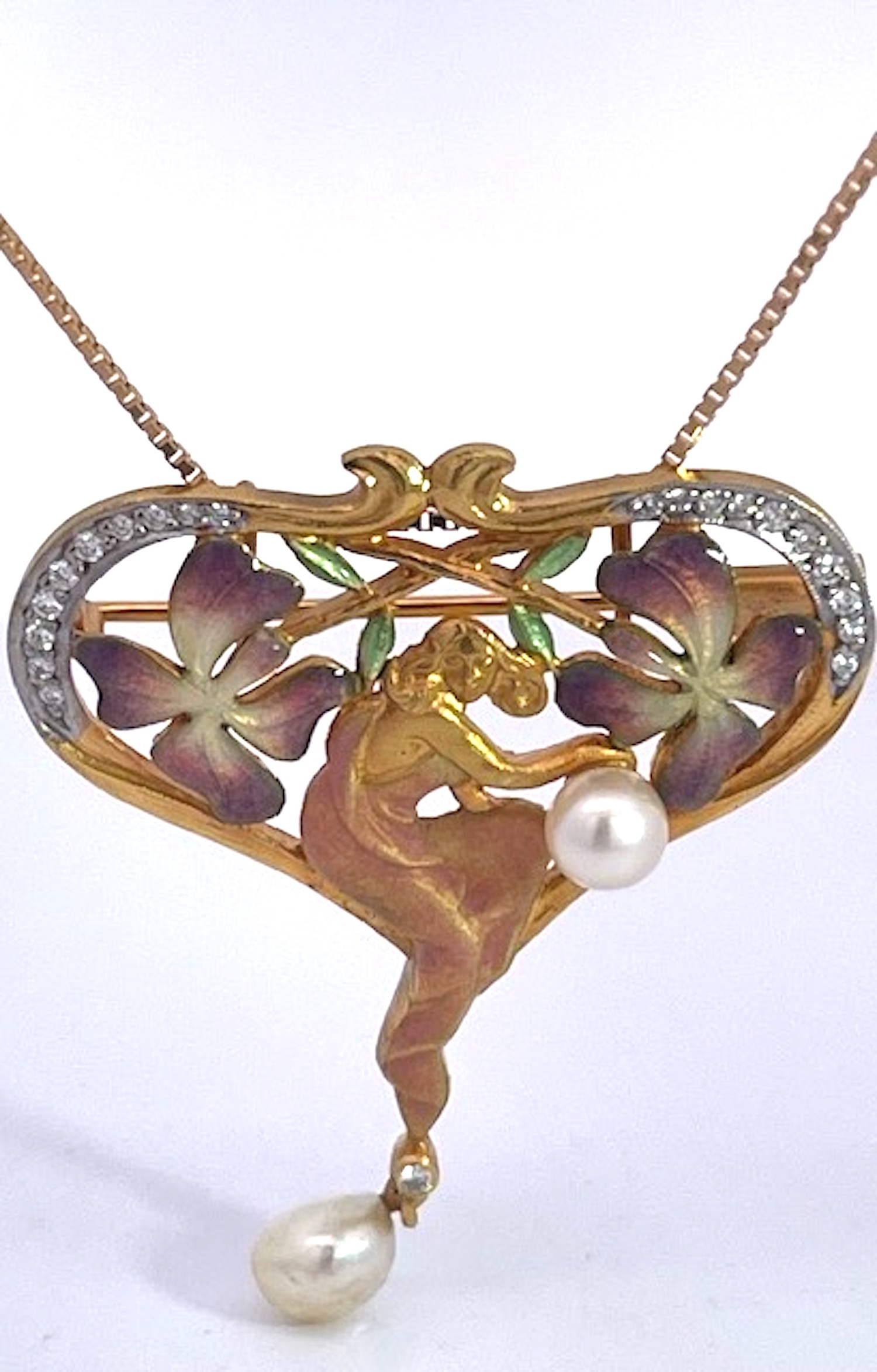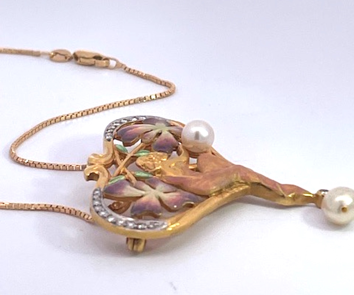 This Masriera Brooch is a pendant or necklace, I am providing the chain. This piece depicts a lovely maiden lady holding a Pearl with a surround of two beautiful flowers on each side of her in lovely soft colors. The piece is shaped like a heart and on both sides of the loop are covered in Diamonds. As for the colors, they are pink, purple and green with some gold. The bottom end has a single Diamond with a hanging pearl. This weighs in at 11.36 grams, without the chain. It is 1 1/2" wide x 1 3/4" long. Signed and numbered in original box and with certificate from Masriera. These Masrira pieces sell fast, so I wouldn't wait, may be too late.