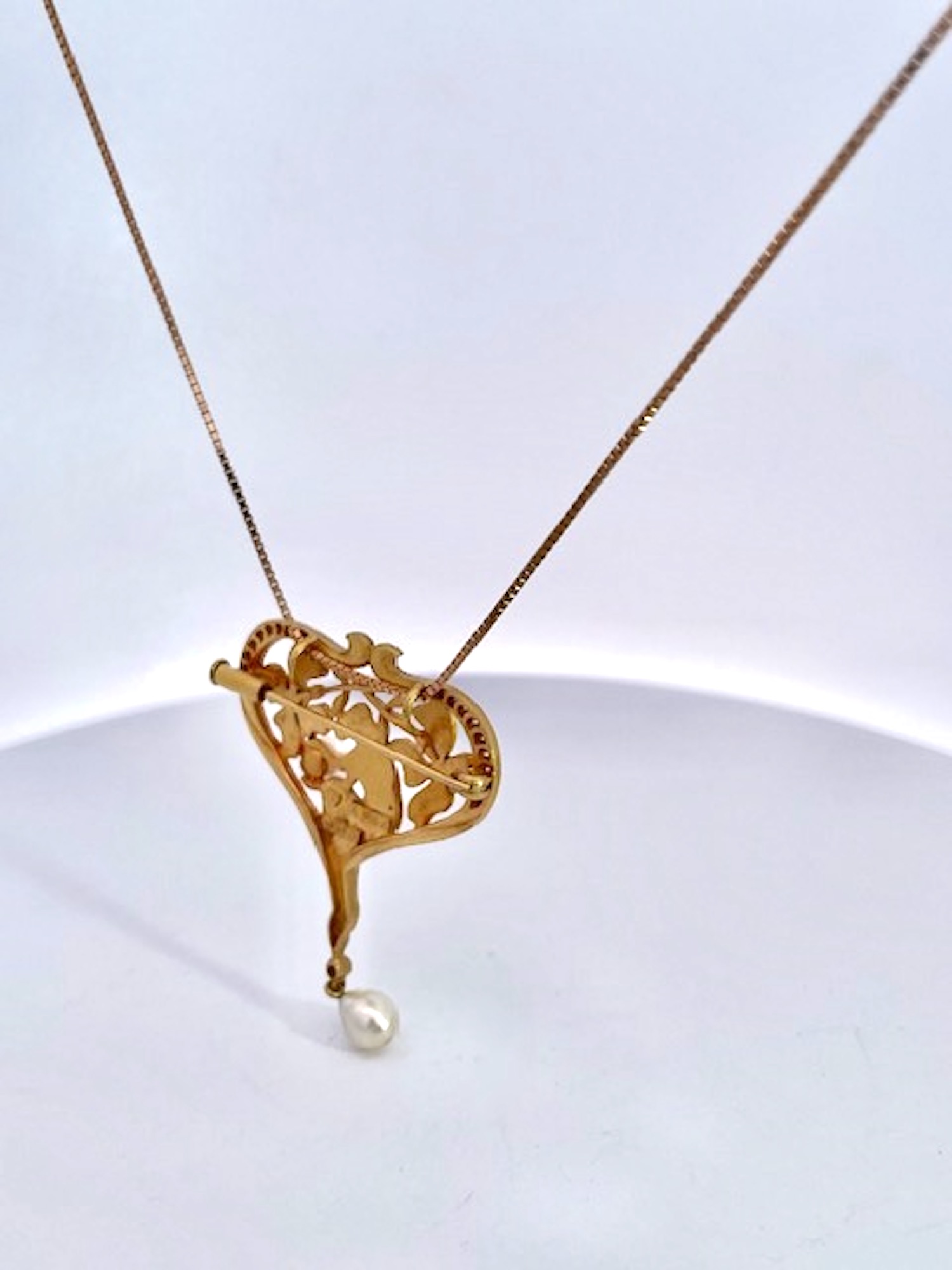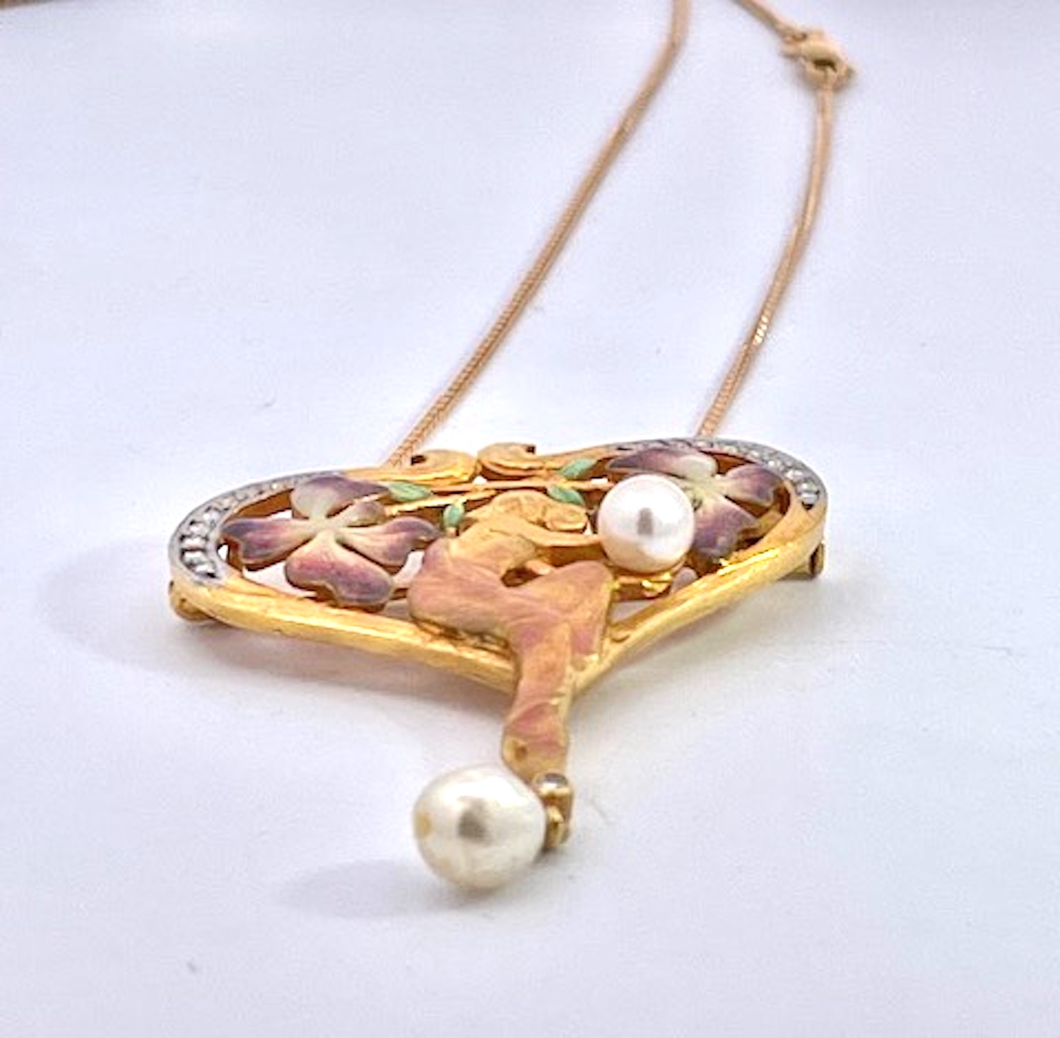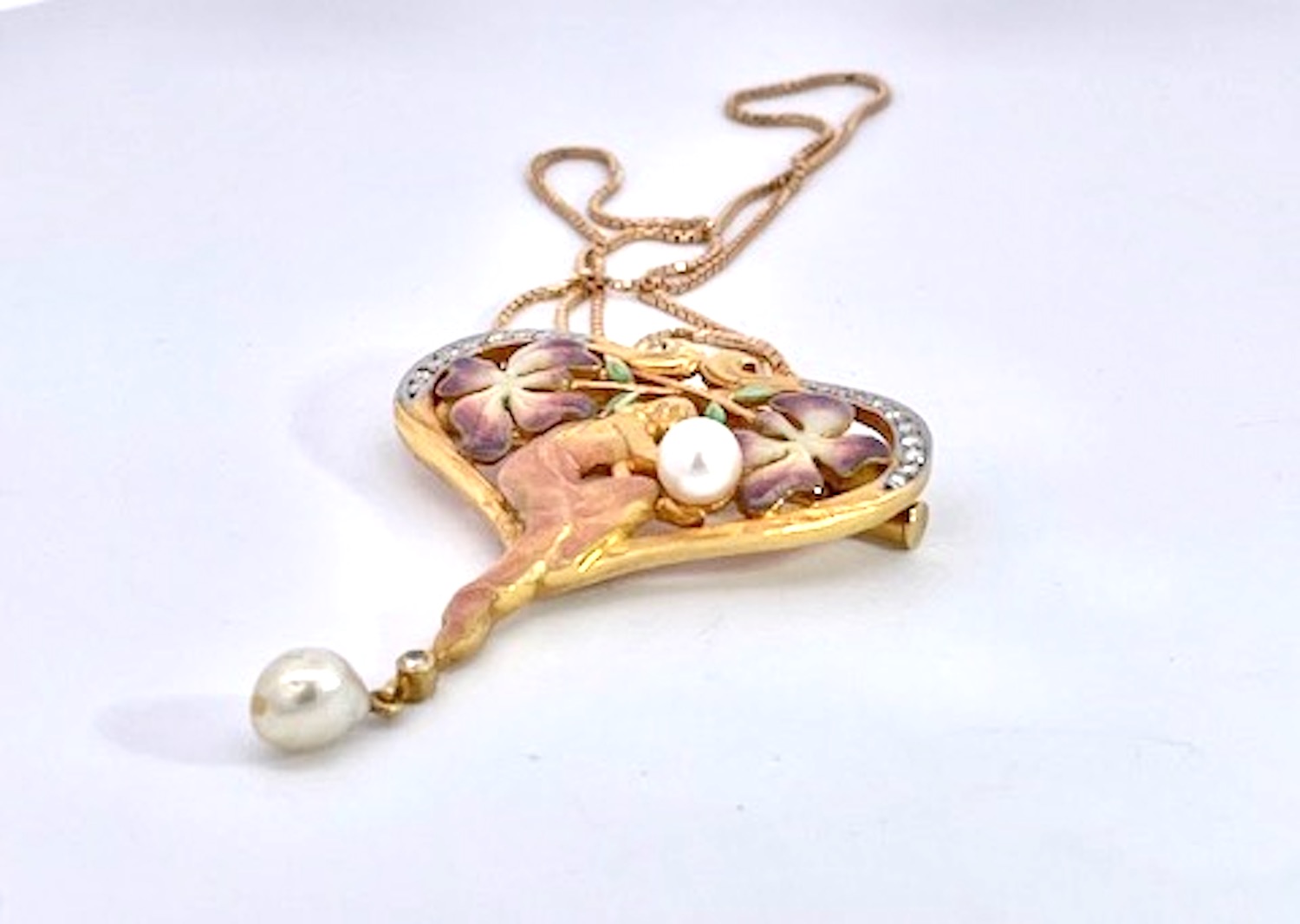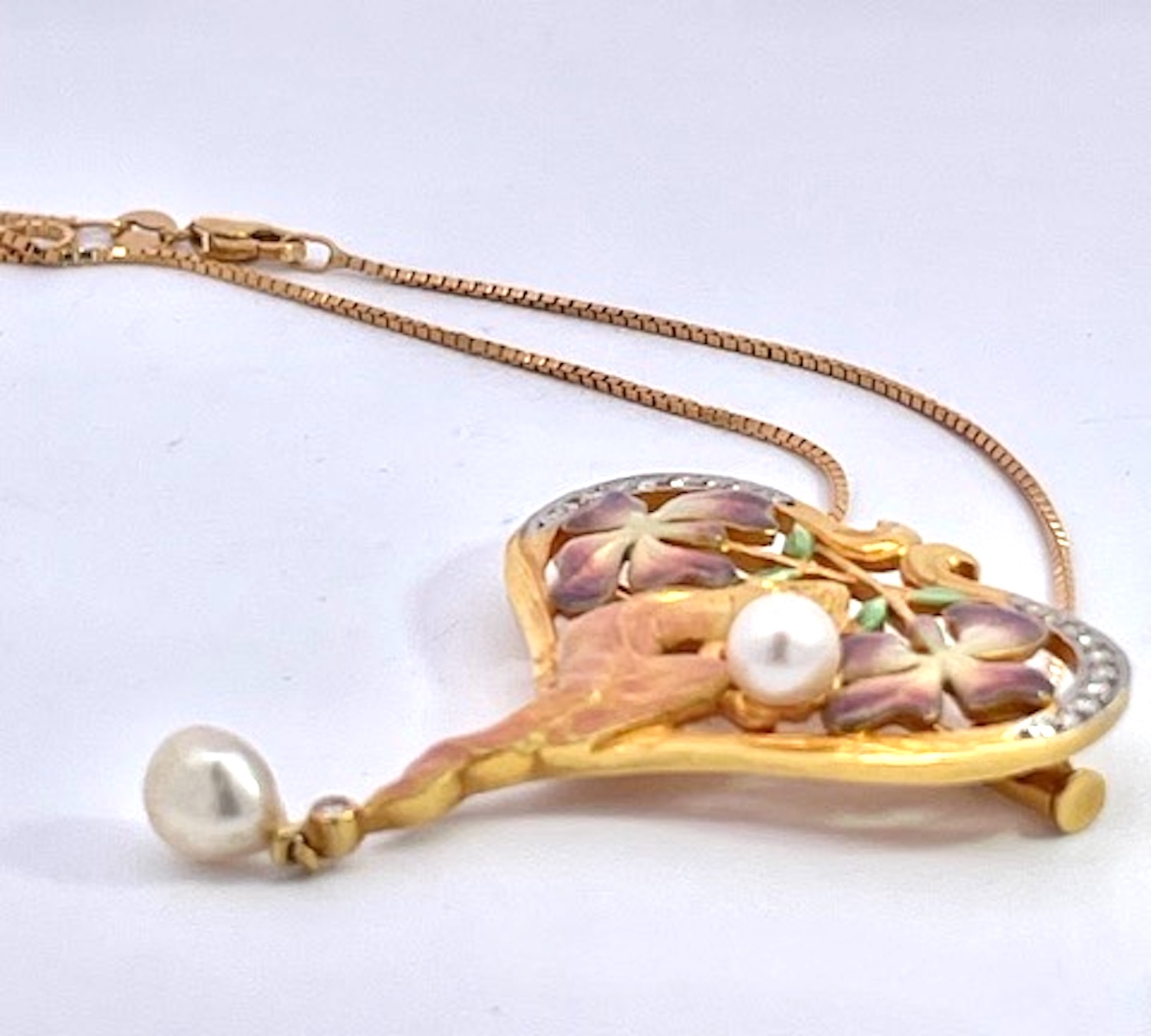 This Masriera Brooch is a pendant or necklace, I am providing the chain. This piece depicts a lovely maiden lady holding a Pearl with a surround of two beautiful flowers on each side of her in lovely soft colors. The piece is shaped like a heart and on both sides of the loop are covered in Diamonds. As for the colors, they are pink, purple and green with some gold. The bottom end has a single Diamond with a hanging pearl. This weighs in at 11.36 grams, without the chain. It is 1 1/2" wide x 1 3/4" long. Signed and numbered in original box and with certificate from Masriera. These Masrira pieces sell fast, so I wouldn't wait, may be too late.