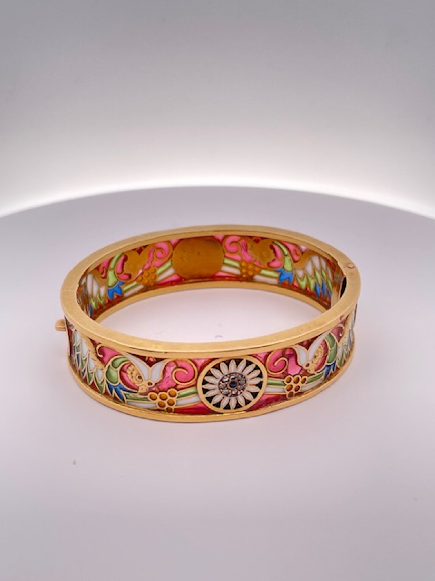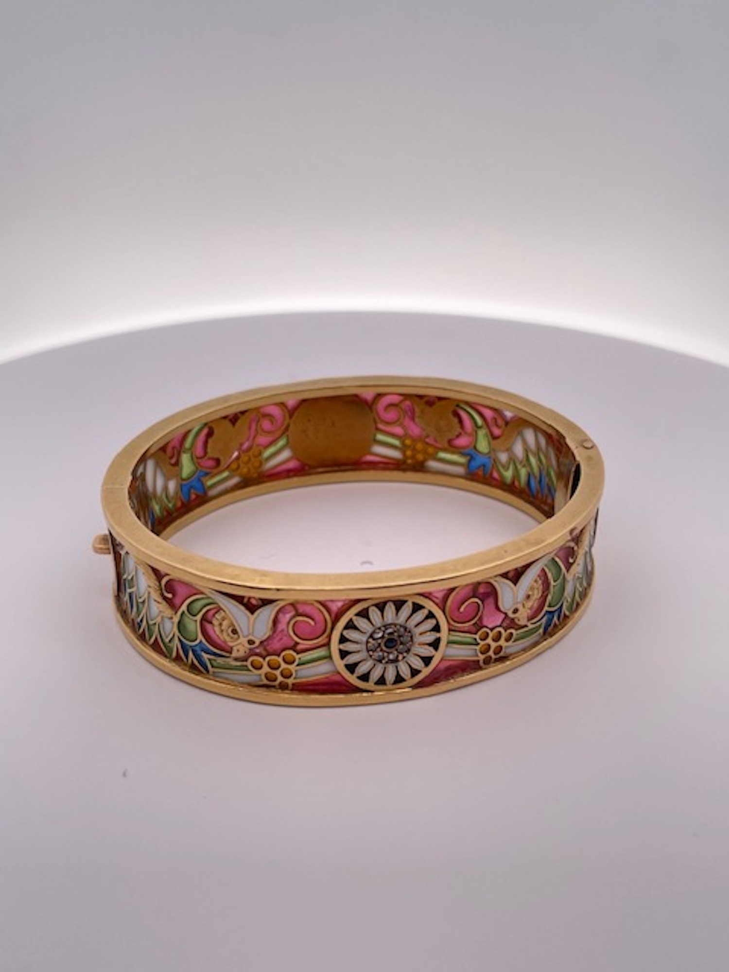 This Masriera Y Carreras Bracelet is just amazing. These seldom come up for auction so here you go collectors of Masriera. Seldom do we find Masriera bracelets, they are very rare and due to the fact they are plique a jour these tend to break or have some kind of damage to them. This bracelet is Plique a jour Enamel Sapphire and Diamond wrap around this gorgeous bracelet. The bangle is done in 18K Yellow Gold the hinged body decorated throughout with Pink, Green, Blue, white and Yellow enamel in a foliate design. The two daisy motifs are set with round cut Sapphires in clusters of rose cut Diamonds. MC marked, inner circumference 17.5, weights a whopping 41.3 grams.