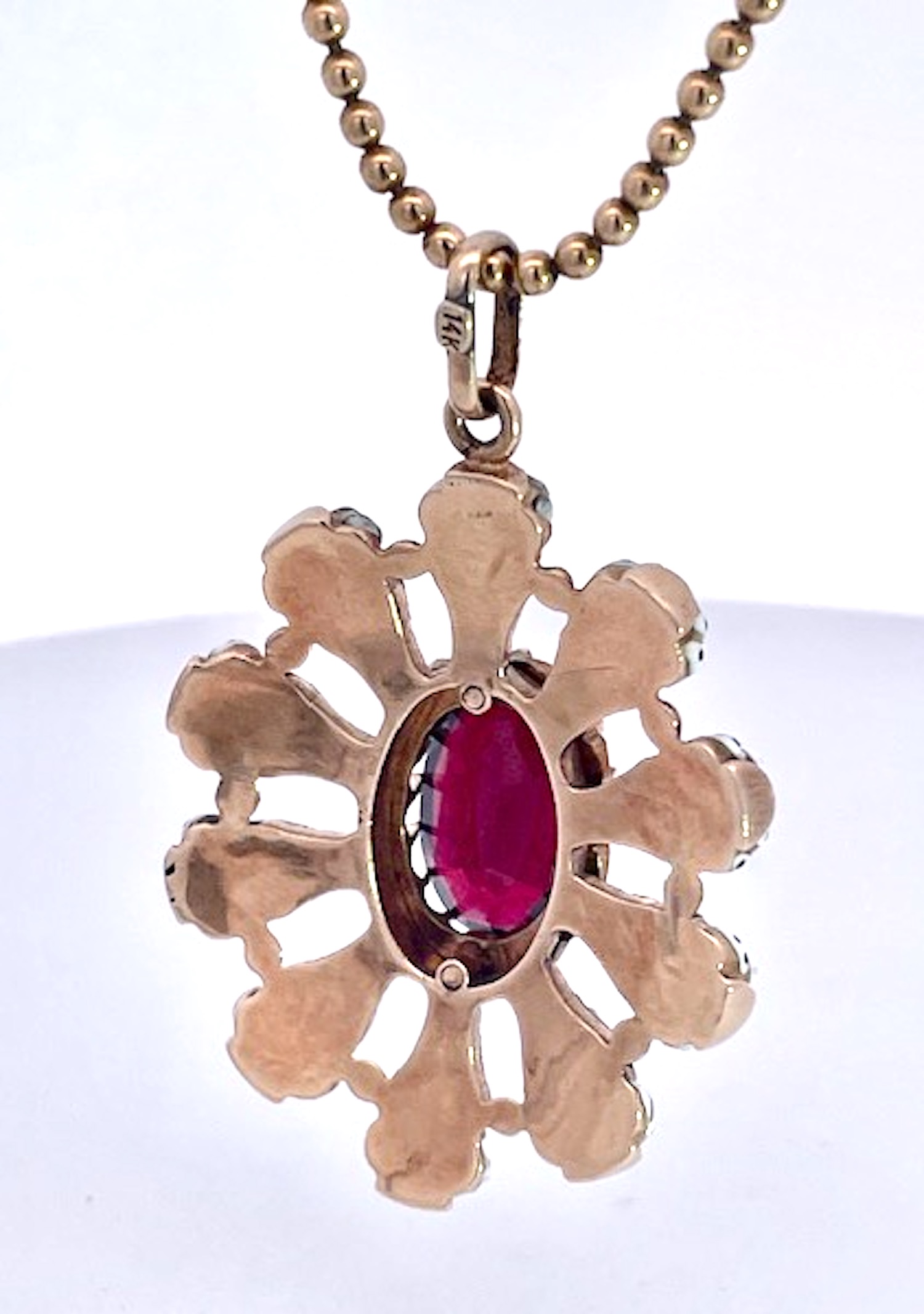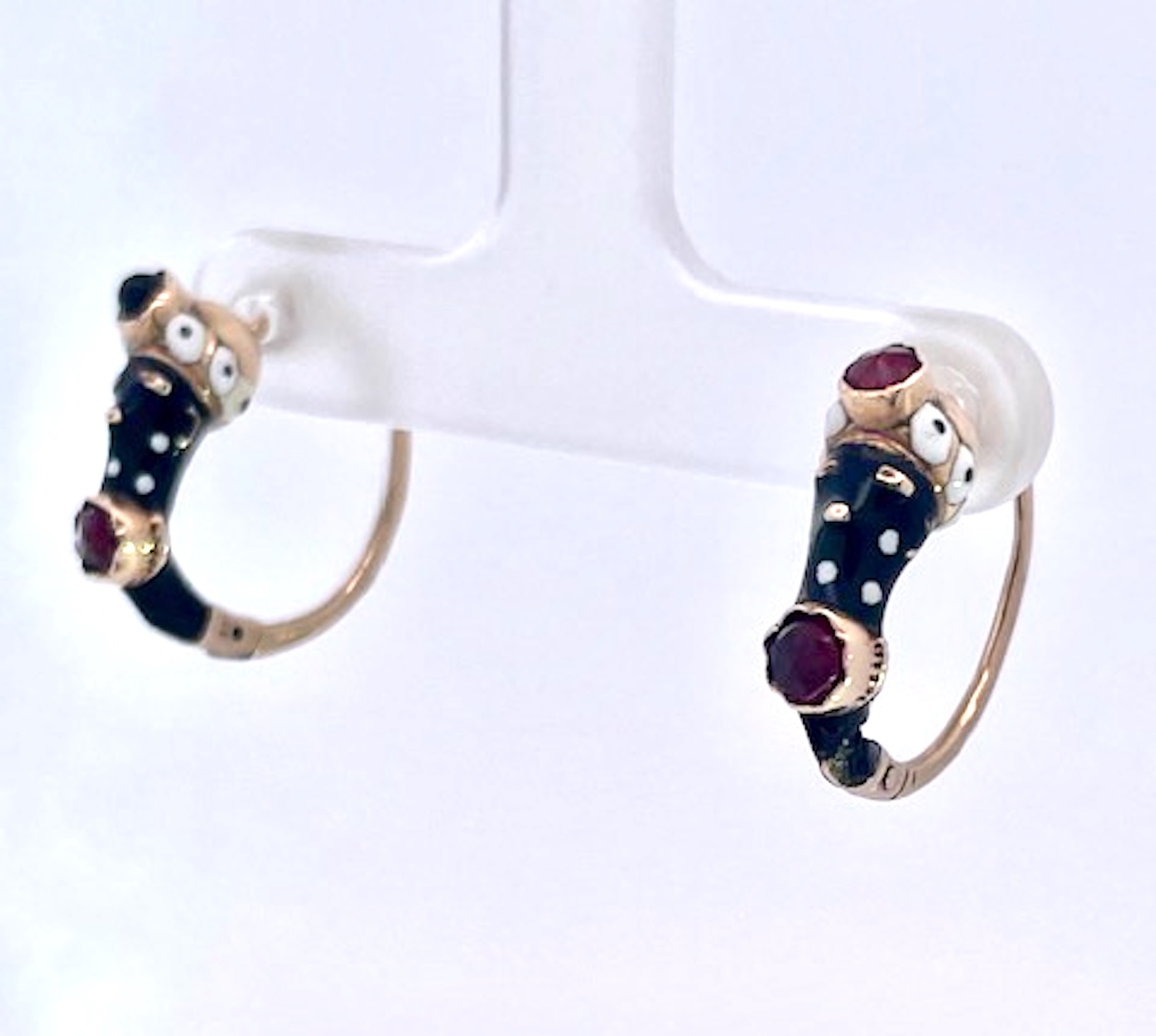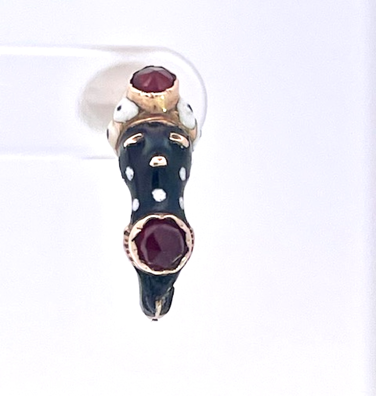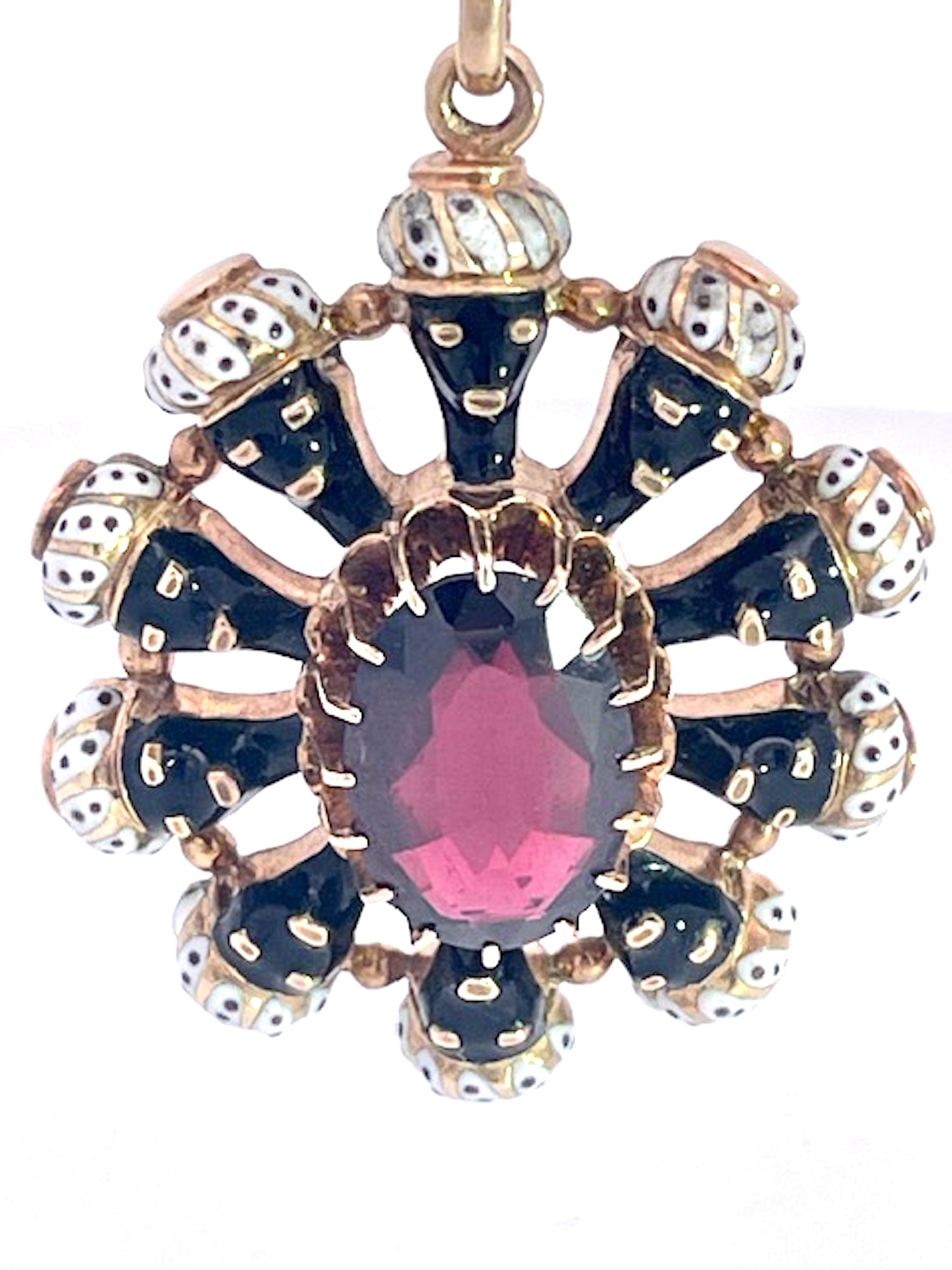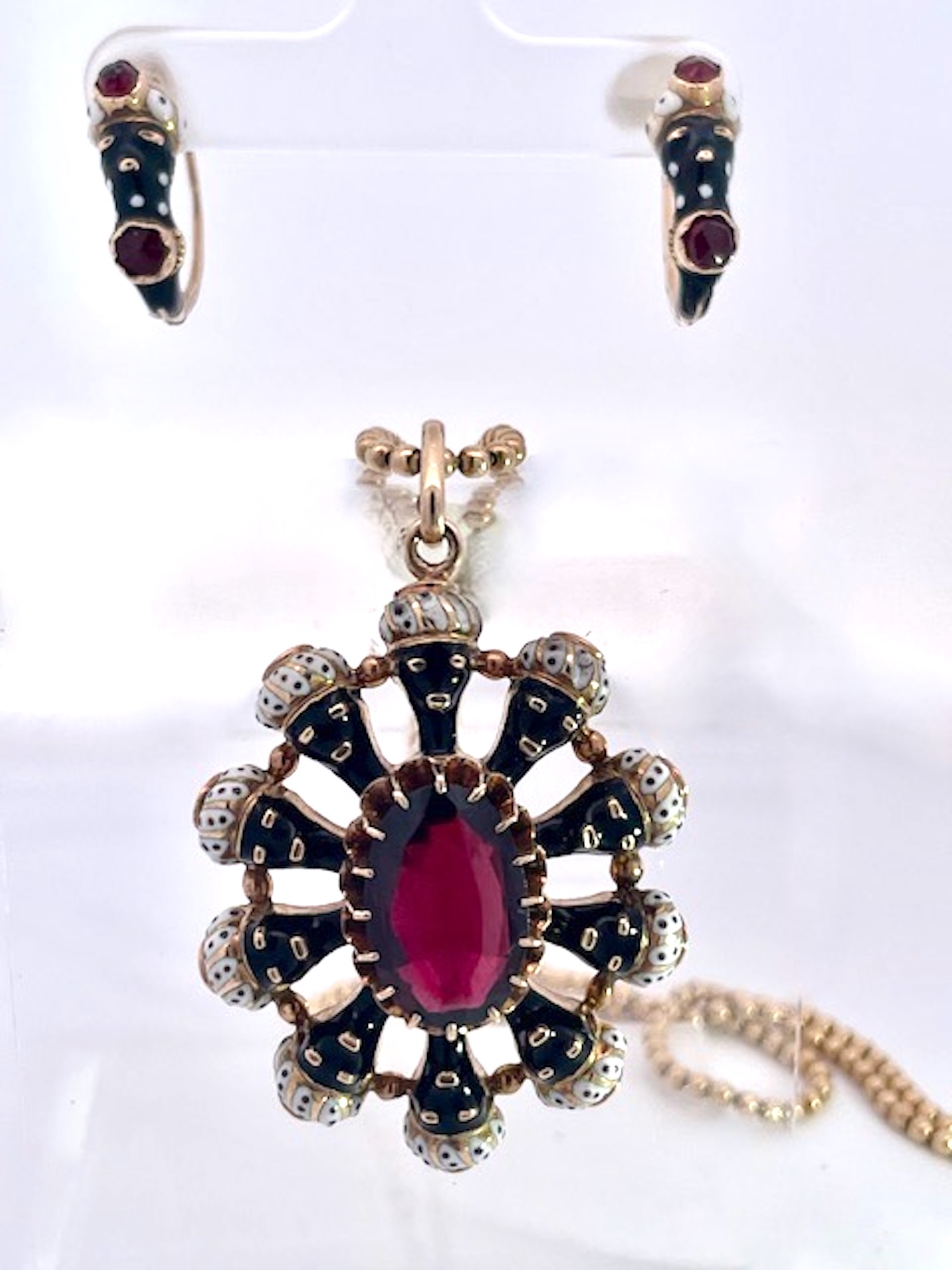 This Moretto set is amazing. It is in perfect condition, no wear or loss of enamel whatsoever. This includes 3 pieces, a set of earrings and a large pendant on a gold bead chain. Ten enamel blackamoors surround the large oval Garnet of approx. 4 Carats and this pendant weighs in at 11.07 grams. It is close to 4cm tall and 3 cm wide. The matching earrings are 1.8cm long detailed with enamel dots 2 garnets one at 0.5 and one at 0.7 in near perfect condition. This is circa 1910 to 1920 when Garnets and Blackamoors were all the rage. Earrings weight 3.00 grams. Seldom will you find a set like this one so do not wait it might be too late.