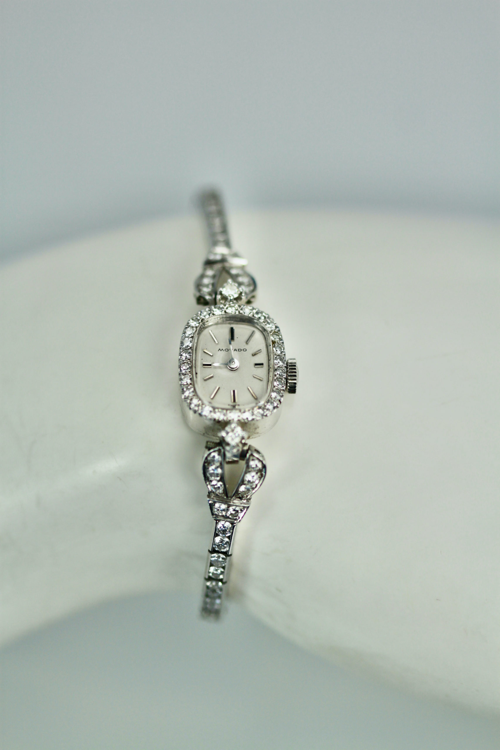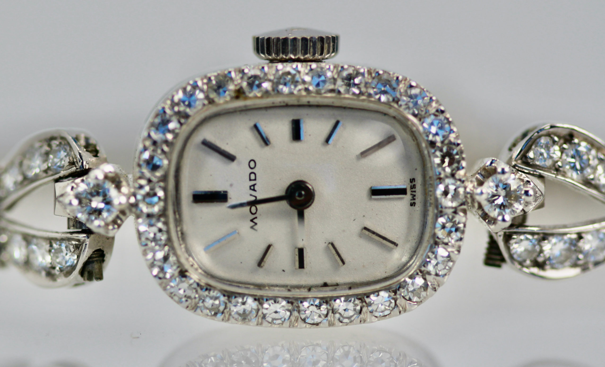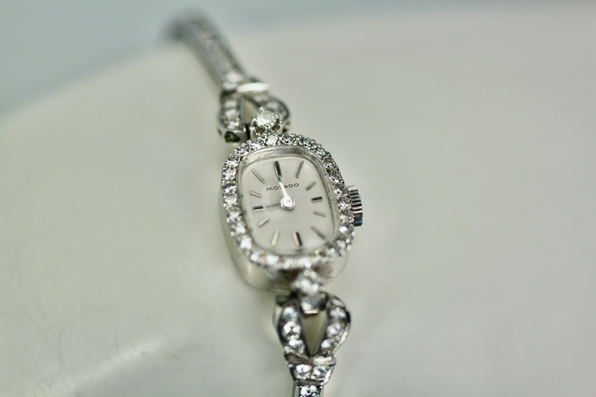 This lovely Diamond Wristwatch is made by Movado which is a fine watch making house. This watch just came back from my watch expert to be cleaned and check the working parts for good timing. The inside of this watch is not Movado as the mechanism has been changed but the beauty of this piece is in the looks, a simple Diamond Watch. This watch has white dial, silver markers and the face has a Diamond surround. The bracelet strap is entirely in Diamonds with a double safety clip. The watch is 5 3/4" long. This can be extended but it will change the look in the back slightly but can be done and I have done it before. Remember women in the 1950's had a smaller wrist size than today.