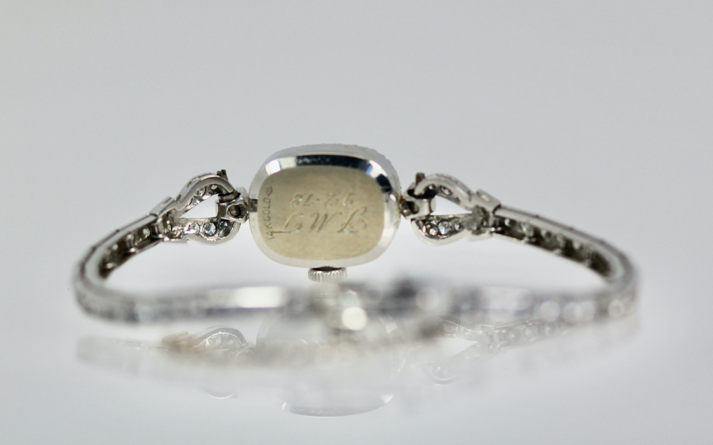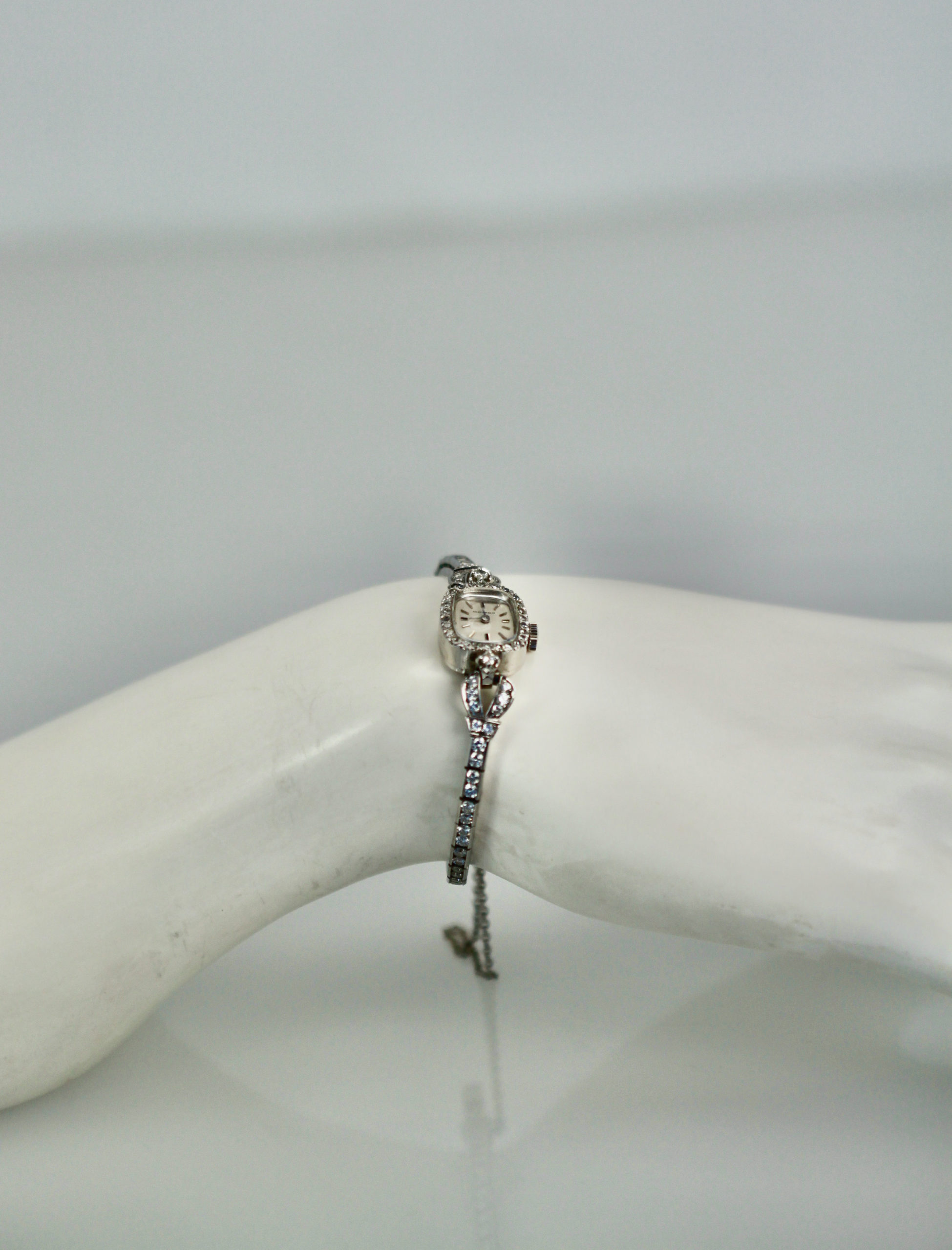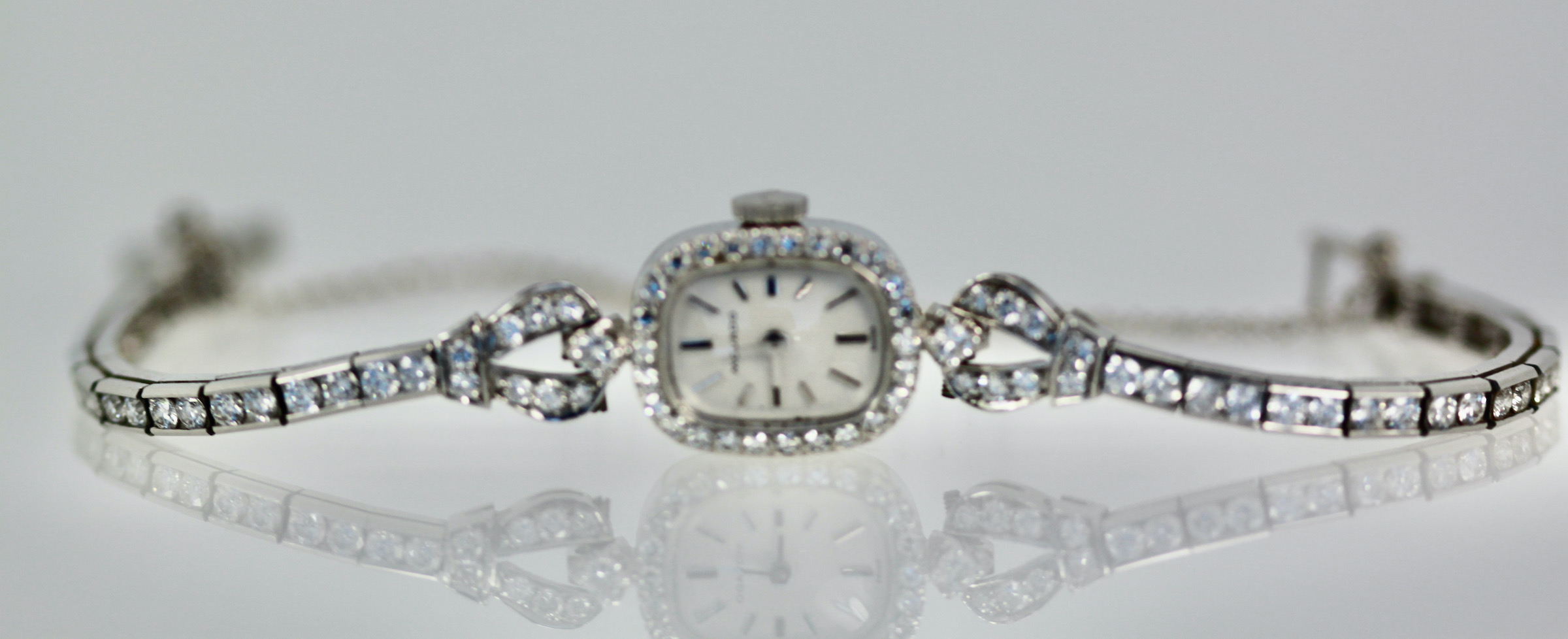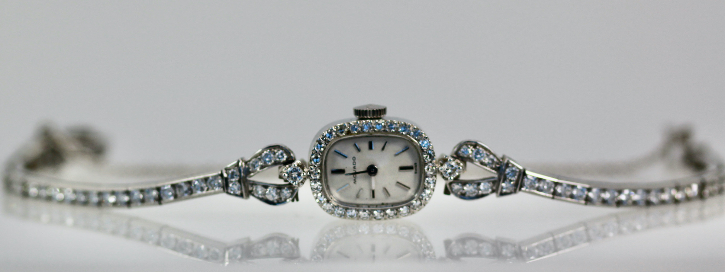 This lovely Diamond Wristwatch is made by Movado which is a fine watch making house. This watch just came back from my watch expert to be cleaned and check the working parts for good timing. The inside of this watch is not Movado as the mechanism has been changed but the beauty of this piece is in the looks, a simple Diamond Watch. This watch has white dial, silver markers and the face has a Diamond surround. The bracelet strap is entirely in Diamonds with a double safety clip. The watch is 5 3/4" long. This can be extended but it will change the look in the back slightly but can be done and I have done it before. Remember women in the 1950's had a smaller wrist size than today.