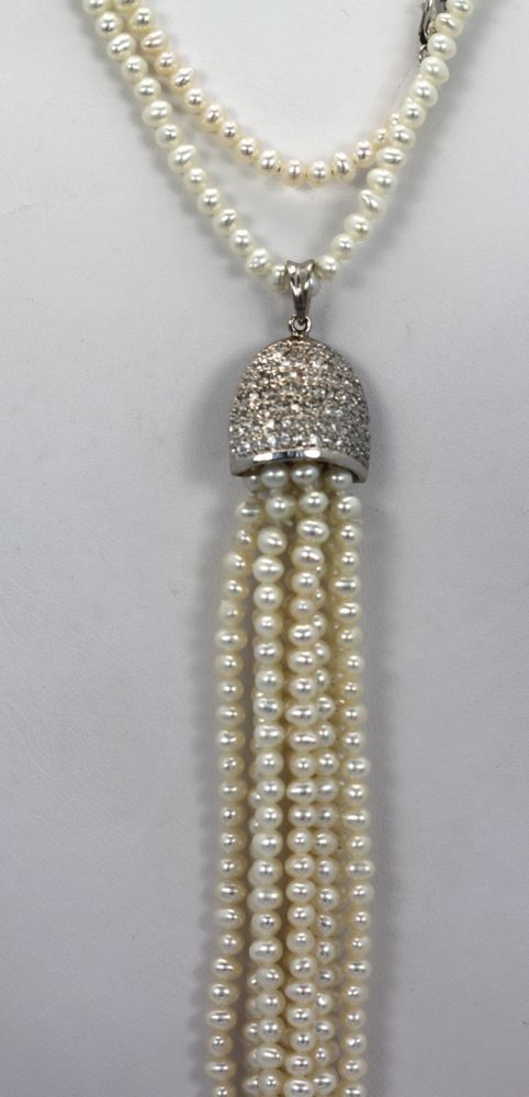 Natural Baby Seed Pearl Necklace. These natural baby seed pearls are unusual, which makes this necklace/tassel combo a find! The necklace is 27" long and can be worn on its own. Also,the pearl tassel is 4 1/2" long with 8 strands of pearls.