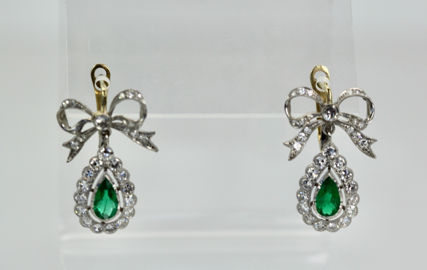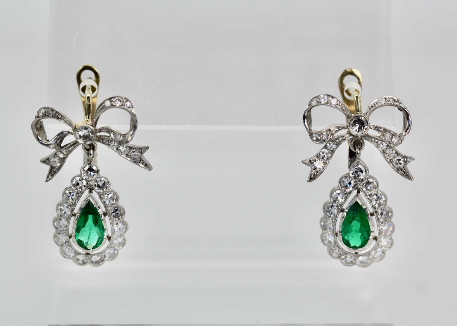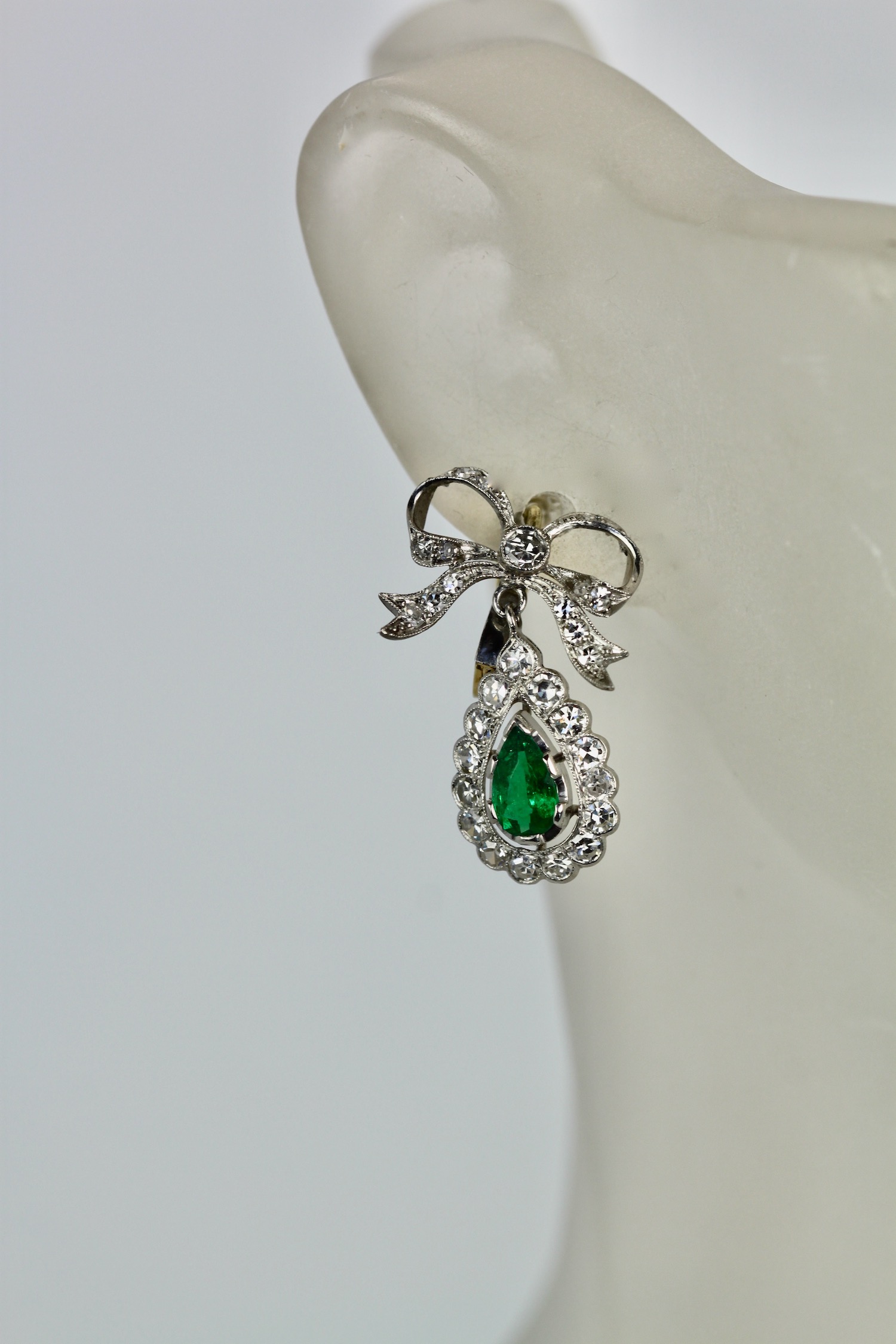 These platinum Earrings hold a beautiful Emerald. They are from the Victorian period with there lovely diamond ribbon top and the surround of the Emerald is all in Diamonds. These are small earrings and perfect for the petite women, but anyone can wear them. I happen to like items that the size matches the wearer, if large larger pieces, if small smaller items. The surround has 15 stones each and an Emerald in the center. The Emeralds are approximately .75 carats to total 1.50 tcw, true Emerald Green beautiful color and weights 7.4 grams. Do not wait these will sell faster than you might think so do not be disappointed when they are gone. These Platinum Emerald Earrings are special.