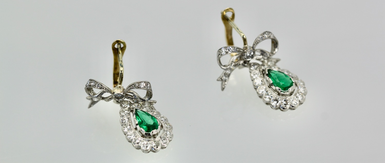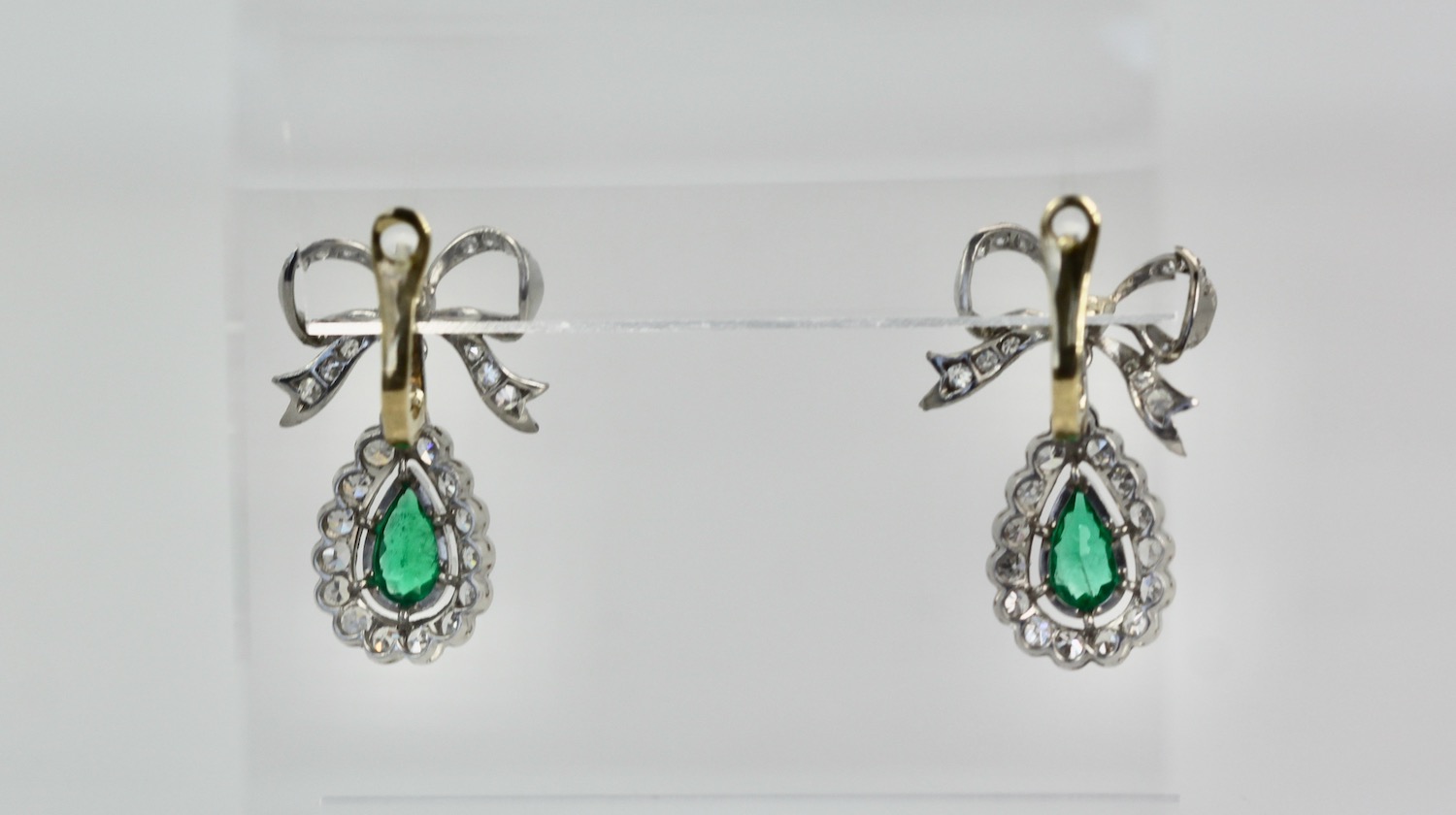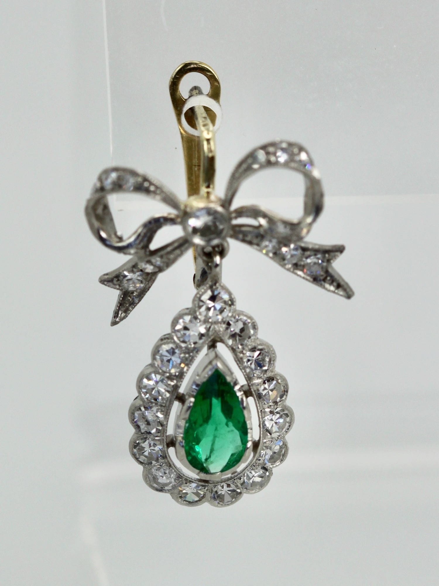 These platinum Earrings hold a beautiful Emerald. They are from the Victorian period with there lovely diamond ribbon top and the surround of the Emerald is all in Diamonds. These are small earrings and perfect for the petite women, but anyone can wear them. I happen to like items that the size matches the wearer, if large larger pieces, if small smaller items. The surround has 15 stones each and an Emerald in the center. The Emeralds are approximately .75 carats to total 1.50 tcw, true Emerald Green beautiful color and weights 7.4 grams. Do not wait these will sell faster than you might think so do not be disappointed when they are gone. These Platinum Emerald Earrings are special.