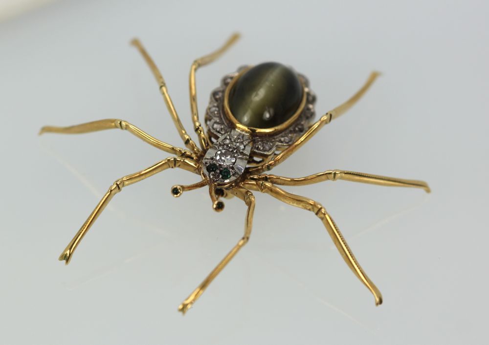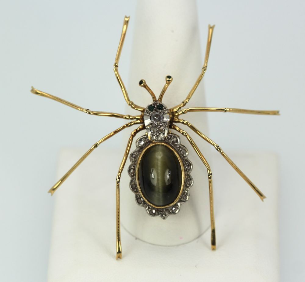 As many of you know I just love vintage or antique insect jewelry and this spider is no exception. This piece comes out of Germany and is circa 1930's. It is a beautiful Cat's Eye with a perfect center slit and this is surrounded by a finely detailed scalloped Diamond border. The Spider is realistic as it's legs are detailed, the head is set with an old mine cut Diamond, 2 Emerald eyes, 2 Emeralds on antlers Platinum topped yellow Gold. This measure 50mm x 60mm and weighs 10 grams. This spider is really lovely and I have never seen another.