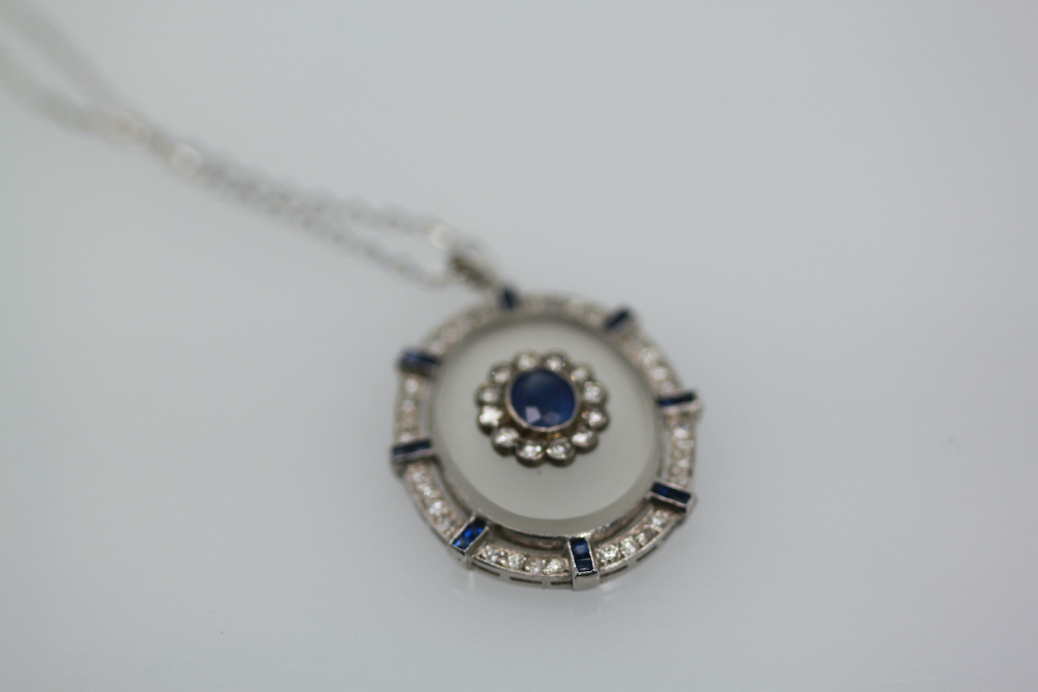 I just love this pendant. This pendant is beautiful with a frosted Rock Crystal base set with a Sapphire with Diamond surround. The crystal is set with Diamonds and Sapphires on a simple chain. The center stone is 0.75 carats, each baguette stone is 0.35 carats and have a Diamond surround of 12 Diamonds. Total Diamond weight is 1.16 carats, Sapphires 1 carat. Weights 0.76 grams. Entire piece 3 CM. Wear this with your Blue Sapphire ring or earrings for a beautiful match. This pendant is beautiful and unique and ready for a new home. Do not wait, it will be gone as these pieces do not come up often. I just love it as it is unique and goes with many items.