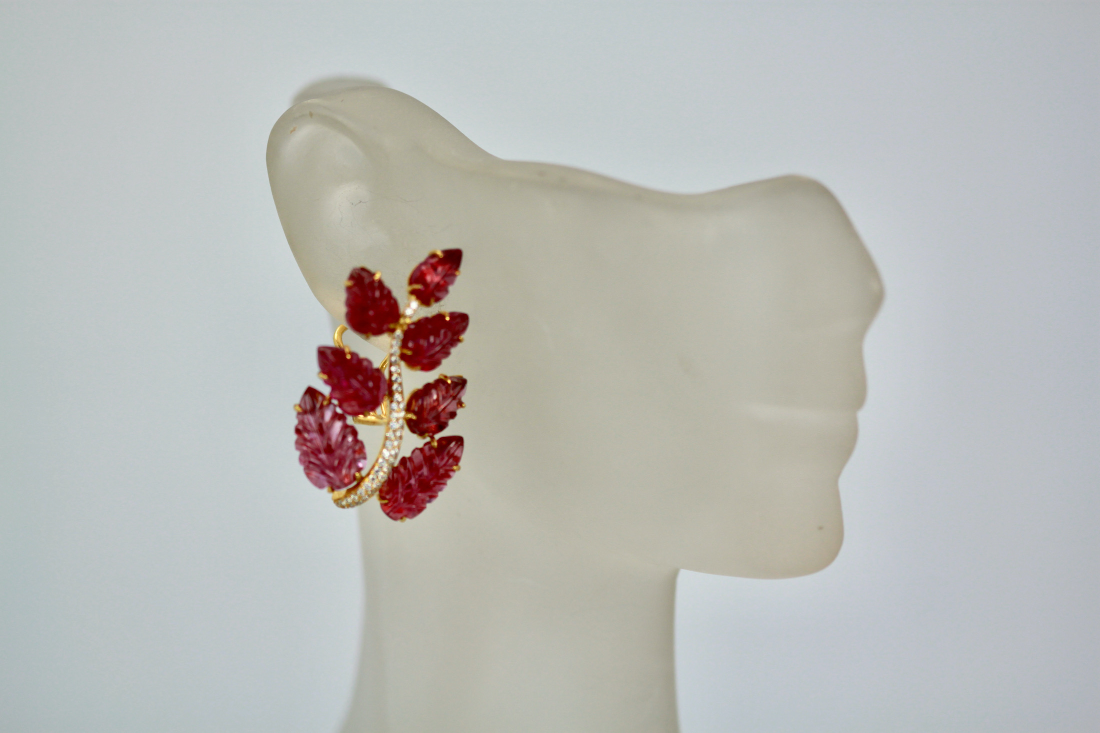 These Rubellite Carved leaf earrings are unique and lovely. They are 4 cm long with 7 carved Rubellite gemstones each. They are large and distinctive. There are 2 Rubellites at 4 carats, 2 at 3 carats, 2 at 1 1/2 carats and 1 at 3/4 carat each. They total 17.5 carats. The the weight is 16 grams and it has a gold stem studded with Diamonds in the center. These are Yellow Gold 14K with a lever-back. They can be converted to posts if that is preferred but just as they are they are stunning. Do not wait these will be gone before Christmas so I suggest you start thinking about the Holidays now. They are not expensive for what they are.