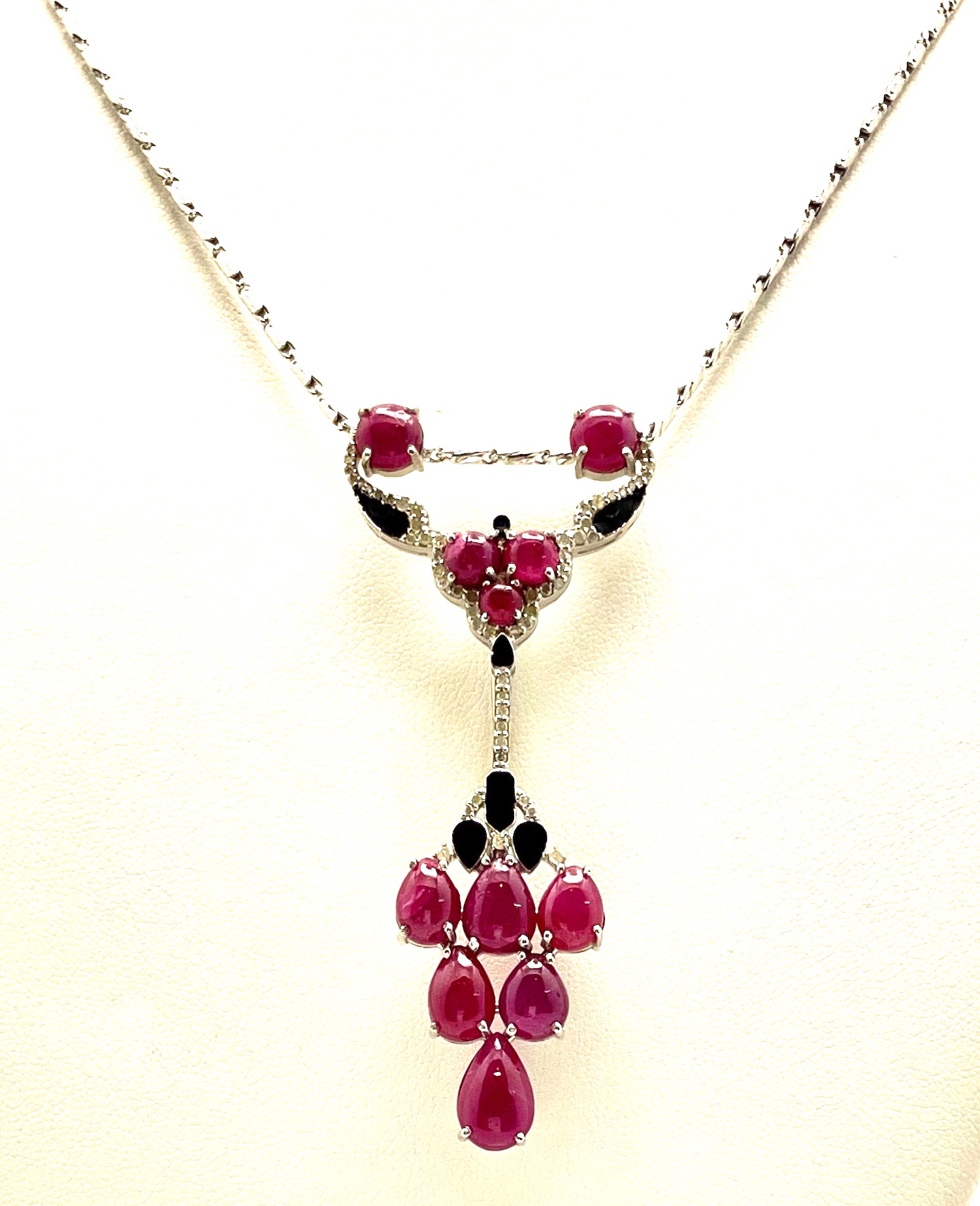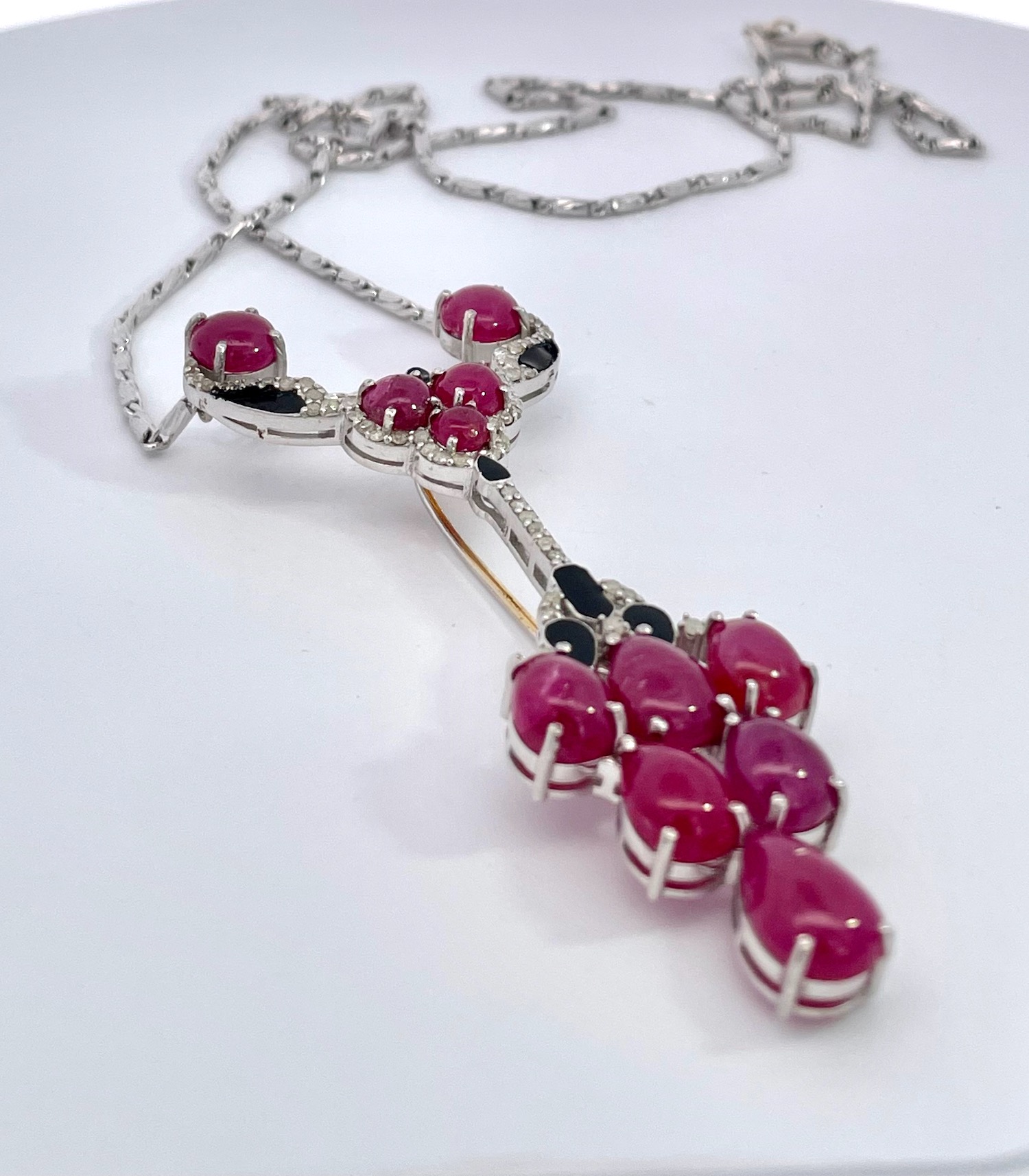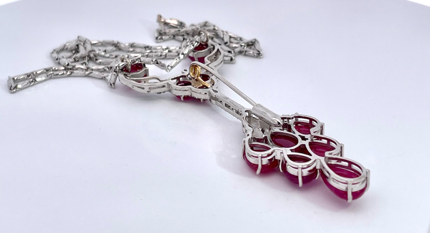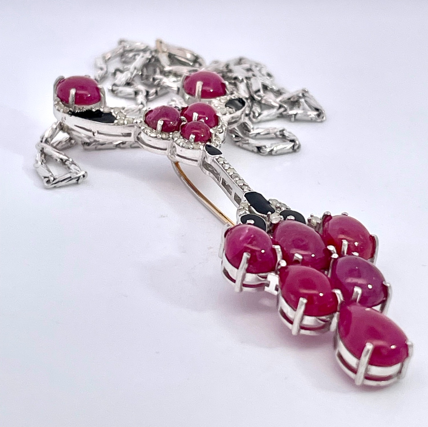 This Ruby Pendant / Brooch is unique and special. It consists of 2 large Rubies of 0.65 points each, 3 small Rubies @ 0.33 points each the bottom has 5 oval pear shaped cabochons at 0.75 each and the last stone is 1.5 carats. This adds up to 2.30 carats plus 3.75 carats to total 6.10 carats of beautiful clean Ruby cabochons. The balance is Diamonds and 7 Onyx plaques. This comes with a beautiful detailed chain of 18K and the length is 20" and this weighs in at 21.03 grams This can be worn on a chain as I wear most of my brooches this way, or worn as a brooch. As a brooch it works for men and women, do not wait it may be too late.