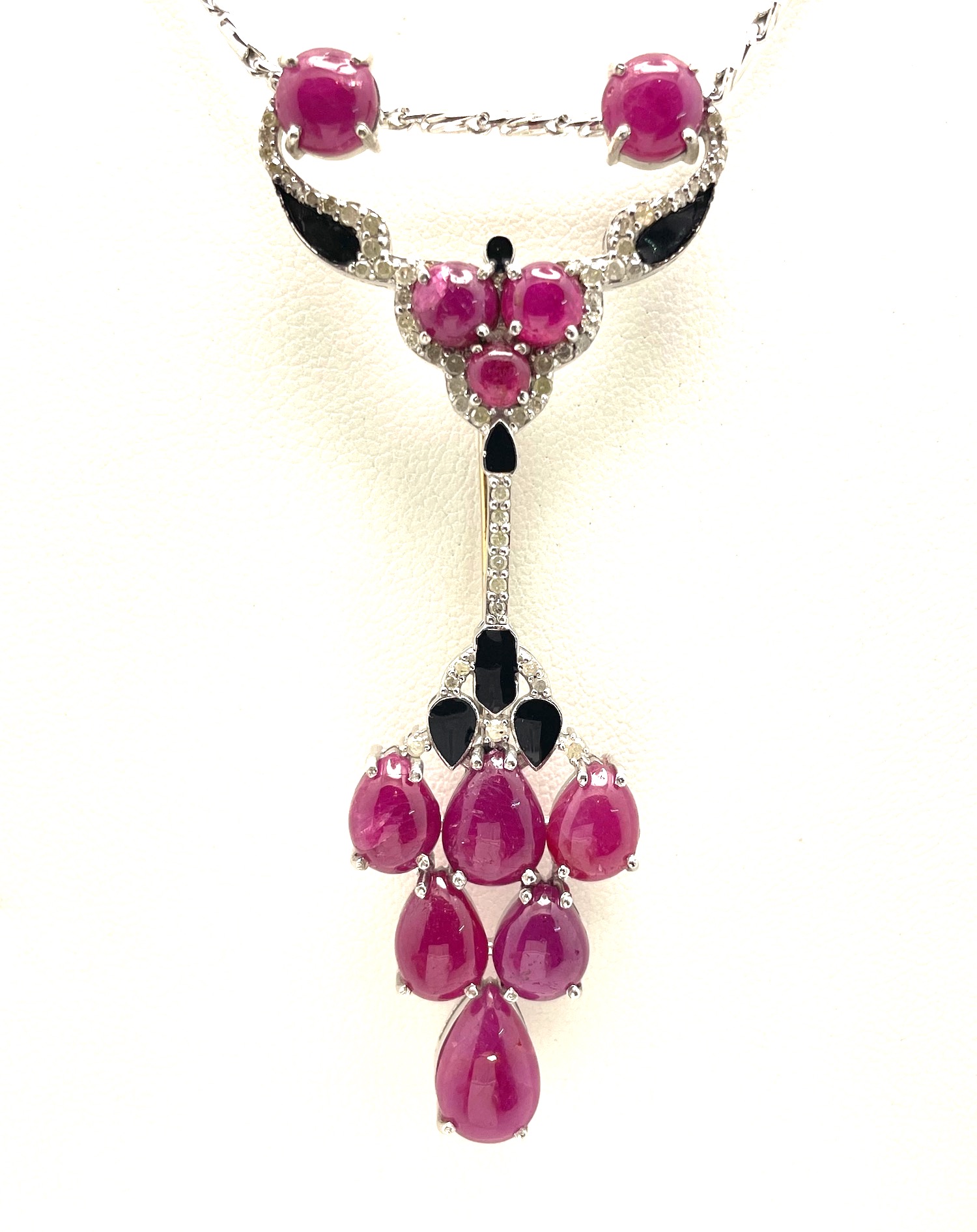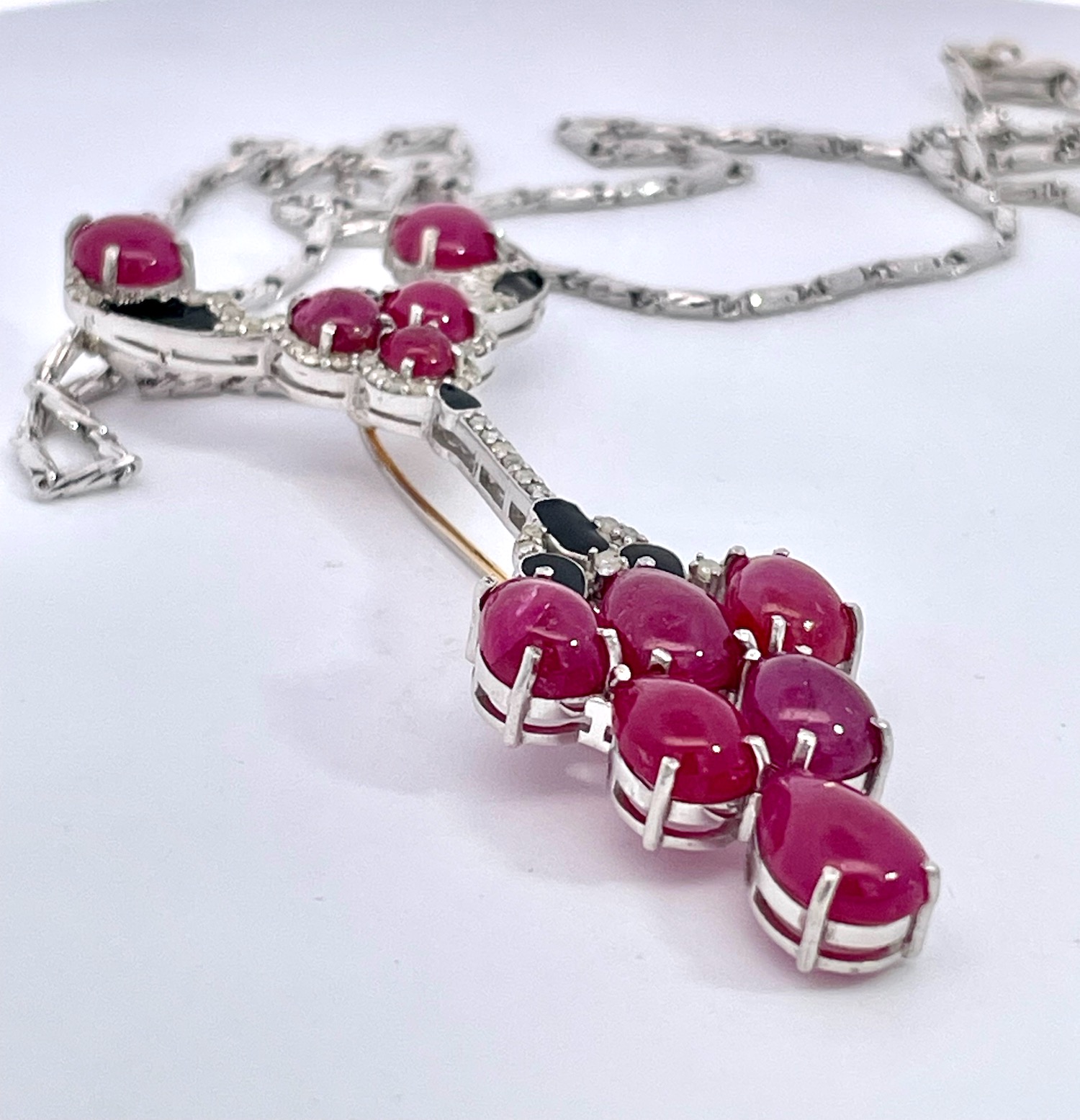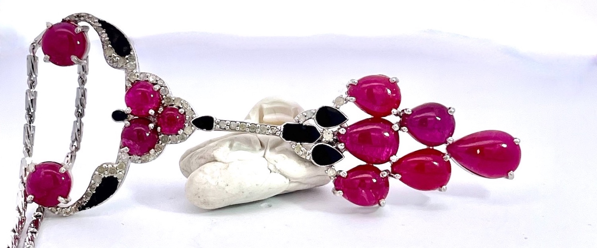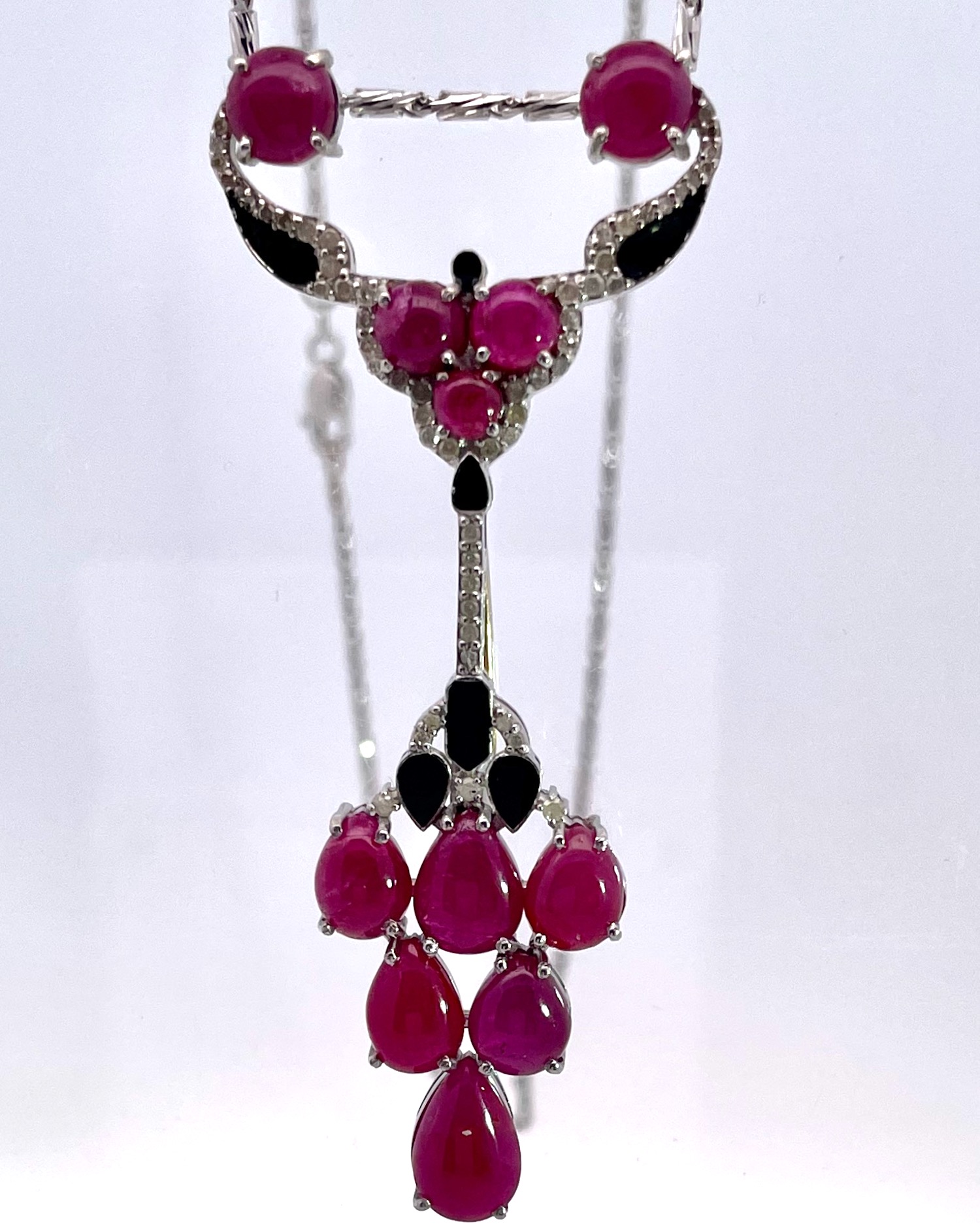 This Ruby Pendant / Brooch is unique and special. It consists of 2 large Rubies of 0.65 points each, 3 small Rubies @ 0.33 points each the bottom has 5 oval pear shaped cabochons at 0.75 each and the last stone is 1.5 carats. This adds up to 2.30 carats plus 3.75 carats to total 6.10 carats of beautiful clean Ruby cabochons. The balance is Diamonds and 7 Onyx plaques. This comes with a beautiful detailed chain of 18K and the length is 20" and this weighs in at 21.03 grams This can be worn on a chain as I wear most of my brooches this way, or worn as a brooch. As a brooch it works for men and women, do not wait it may be too late.
