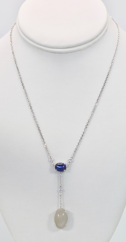 This lovely Sapphire Moonstone Diamond Drop Necklace 18K was recently made in my jewelers workshop. Furthermore, the Cabochon Sapphire is gorgeous and so translucent. It weighs 1.75 Carats and measures 10.37 x 7.10 x 5.40. Also, the moonstone is a soft grey and is approximately 8 Carats and measures 17.75 x 10. 29 . There are 3 white Diamonds as accents and the necklace is 16" long with a 1 1/4" drop. All set in 18K white gold.