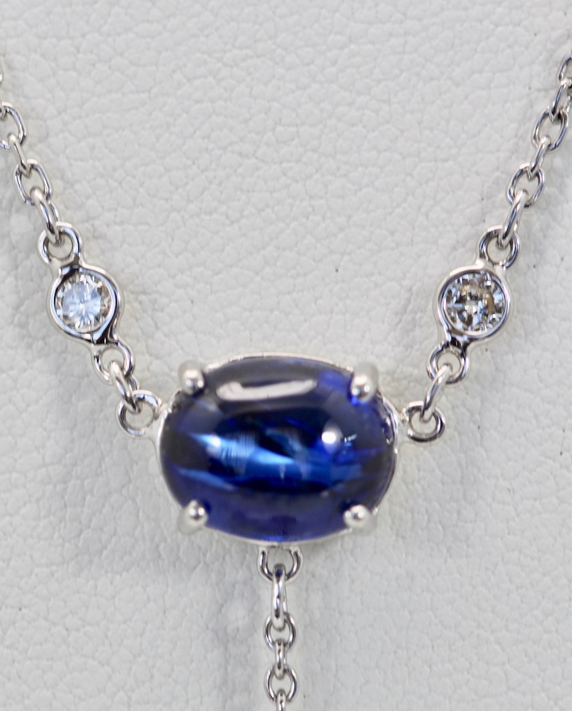 This lovely Sapphire Moonstone Diamond Drop Necklace 18K was recently made in my jewelers workshop. Furthermore, the Cabochon Sapphire is gorgeous and so translucent. It weighs 1.75 Carats and measures 10.37 x 7.10 x 5.40. Also, the moonstone is a soft grey and is approximately 8 Carats and measures 17.75 x 10. 29 .