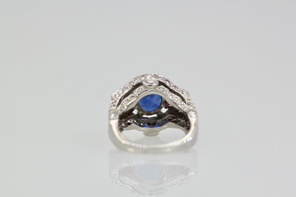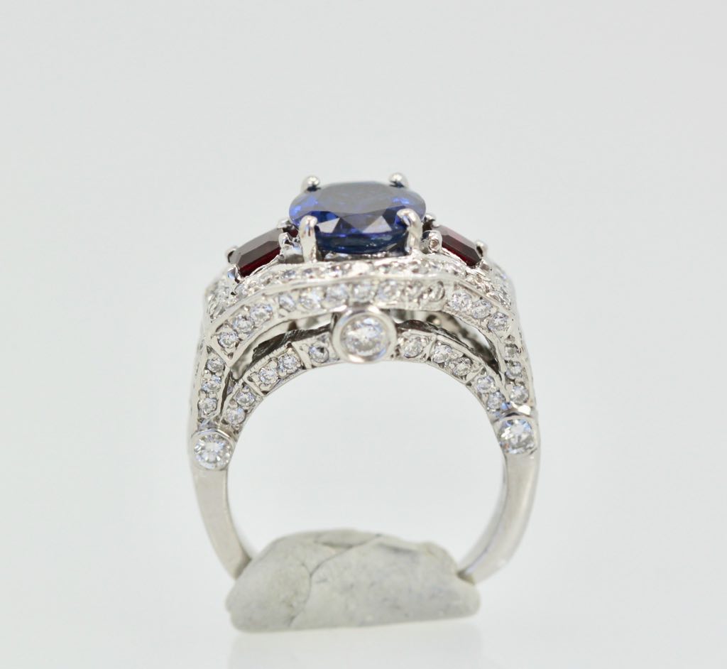 This lovely Sapphire Ruby Diamond Ring is set in 14K White Gold. It features a Oval cut Sapphire weighing in at 2.67 Carats, flanked by 2 Rubys square cut and weighing 0.70 carats and White Diamonds, F-G, VS weighting in at 2.50 Carats. Set in a square shank mounting, measuring approximately 15mm tapering to 2.4mm Size 6.5. Total weight: 5.87 carats. I purchased this to go with many of my Tutti Frutti pieces as this ring works so well yt it works by itself and many other pieces. The Sapphire is true Sapphire Blue, no eye visible inclusions and the Rubies are true Ruby red. This is a gorgeous ring in its simplicity and it is ready for its new owner.