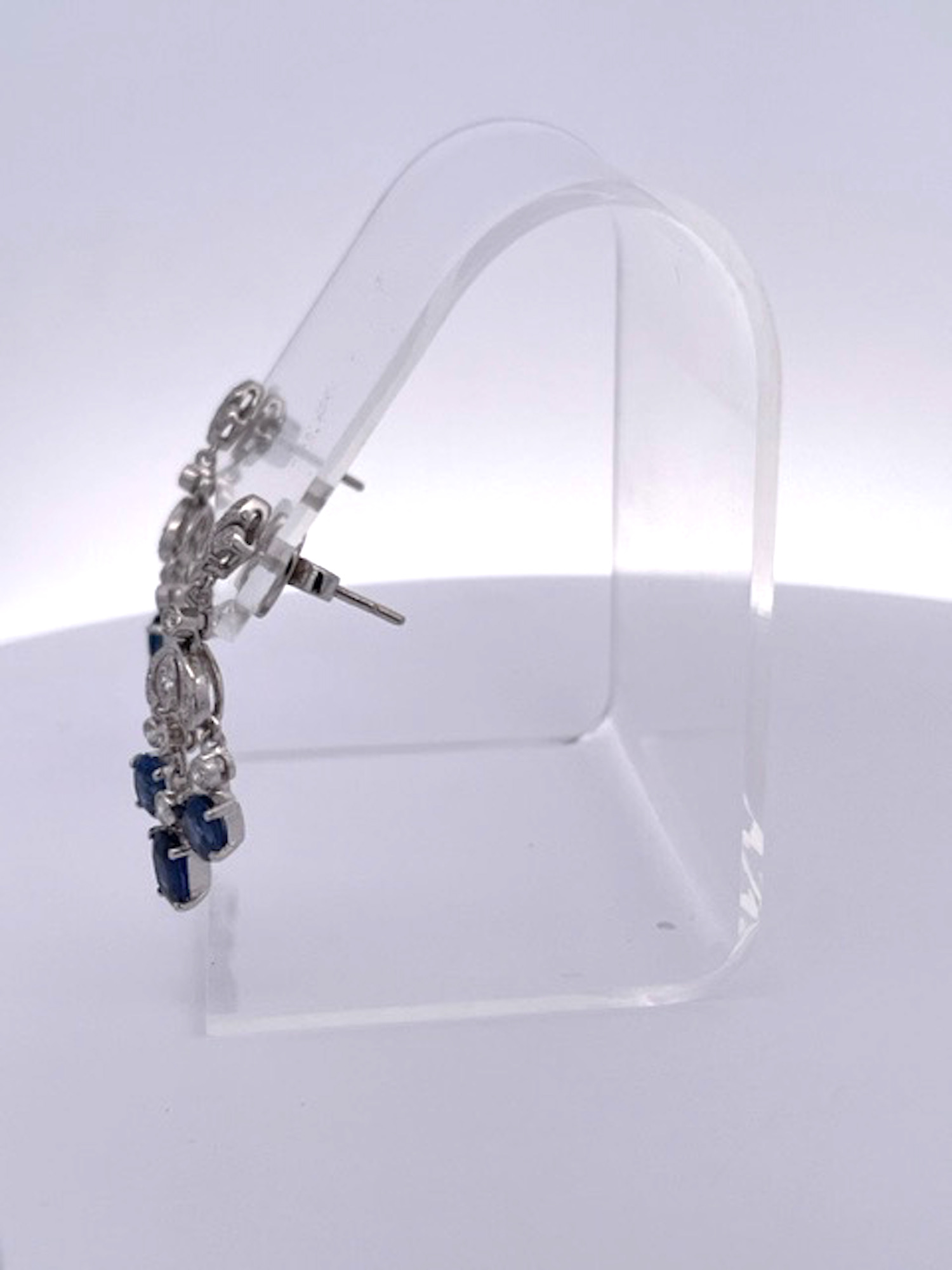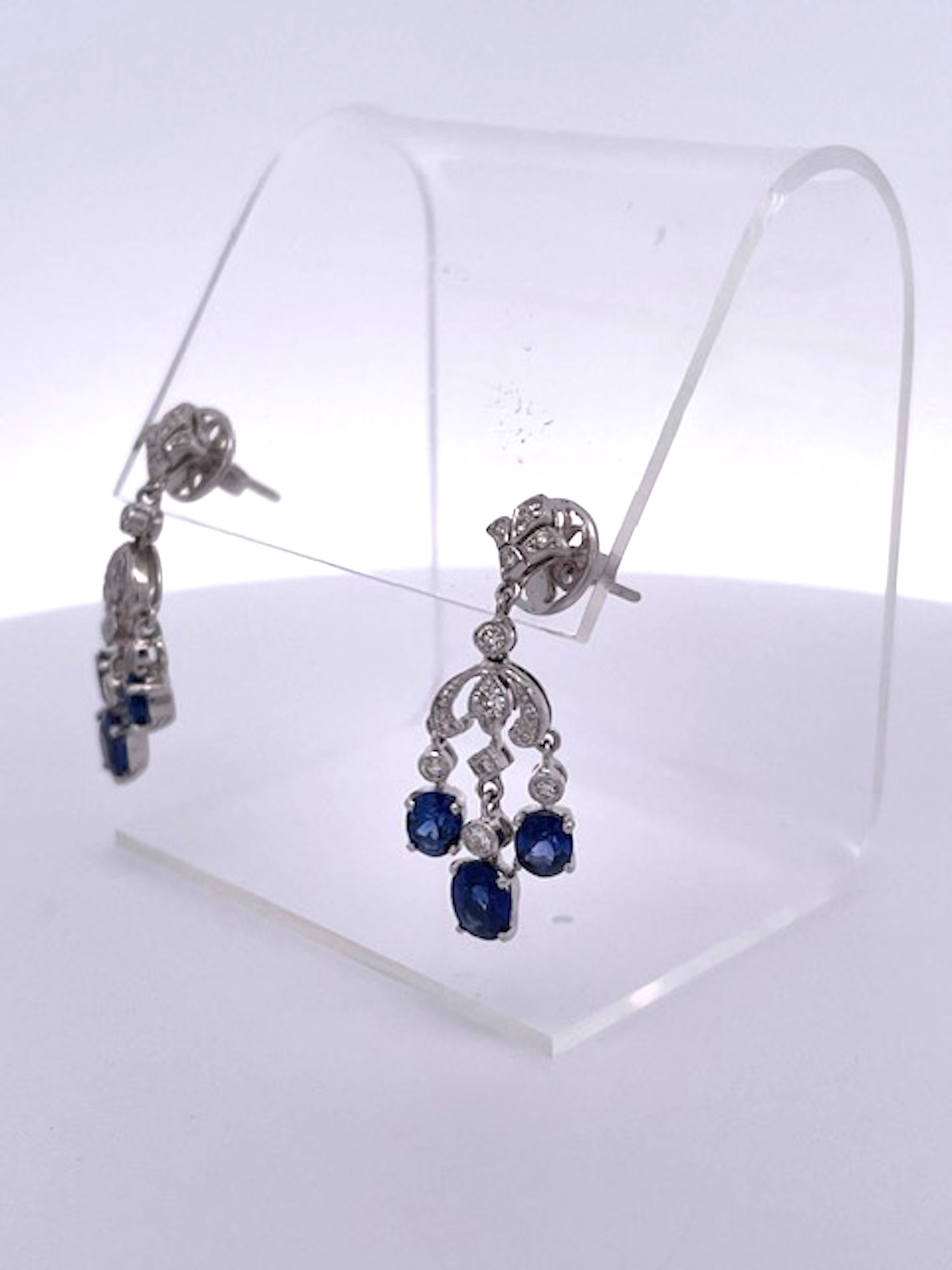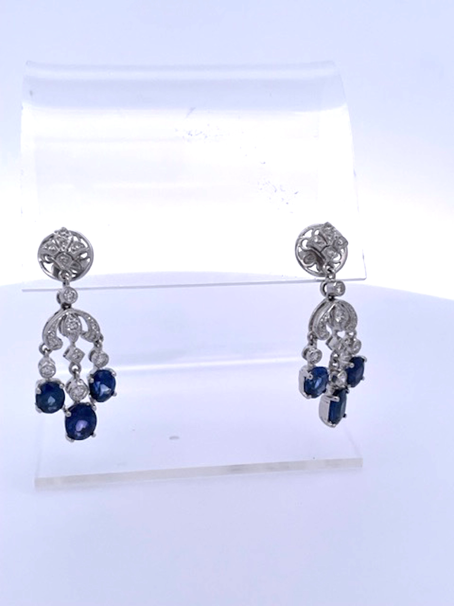 Just received from a London auction, these tassel drop earrings are divine. These Sapphire tassel earrings have extra beautiful clean clear deep Blue Sapphires and are made in 18K White Gold. These Sapphire Tassel Drop Earrings features a fleur de lis top is studded with Diamonds and suspending from them are 3 oval Sapphires. Two Sapphires are approximately 0.30 points each and the center Sapphire is at 0.50 for a total of 1.10 carats for each earring, TCW of Sapphires is 2.20 carats. The Diamonds are many they are small but they pack a punch I would say about .50 carats. These are truly beautiful so I would not wait to purchase. Perfect for the coming Holidays and all year long as these are small in actual size as shown.