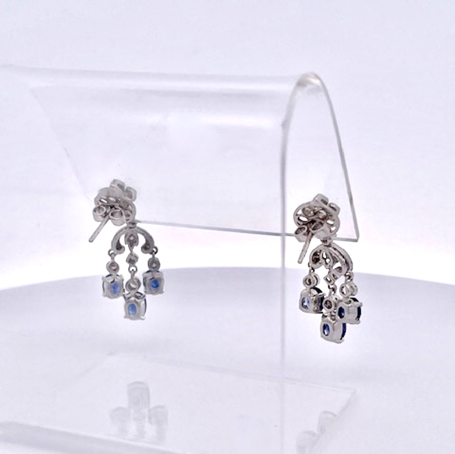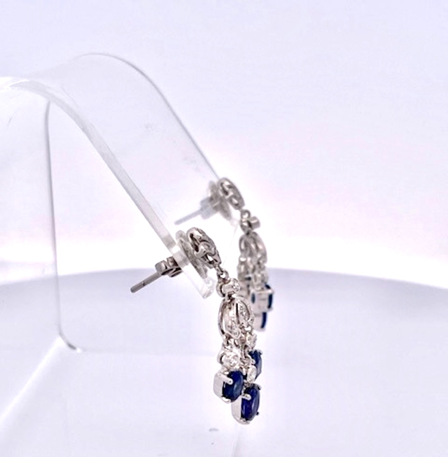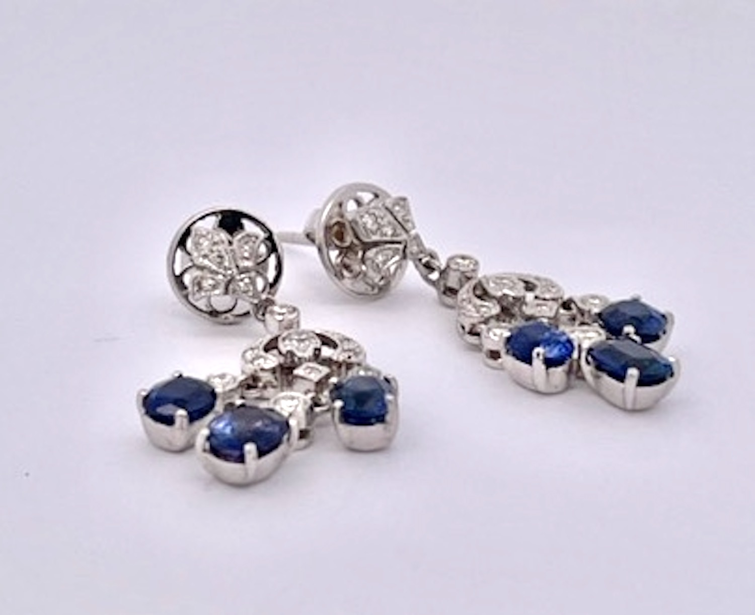 Just received from a London auction, these tassel drop earrings are divine. These Sapphire tassel earrings have extra beautiful clean clear deep Blue Sapphires and are made in 18K White Gold. These Sapphire Tassel Drop Earrings features a fleur de lis top is studded with Diamonds and suspending from them are 3 oval Sapphires. Two Sapphires are approximately 0.30 points each and the center Sapphire is at 0.50 for a total of 1.10 carats for each earring, TCW of Sapphires is 2.20 carats. The Diamonds are many they are small but they pack a punch I would say about .50 carats. These are truly beautiful so I would not wait to purchase. Perfect for the coming Holidays and all year long as these are small in actual size as shown.