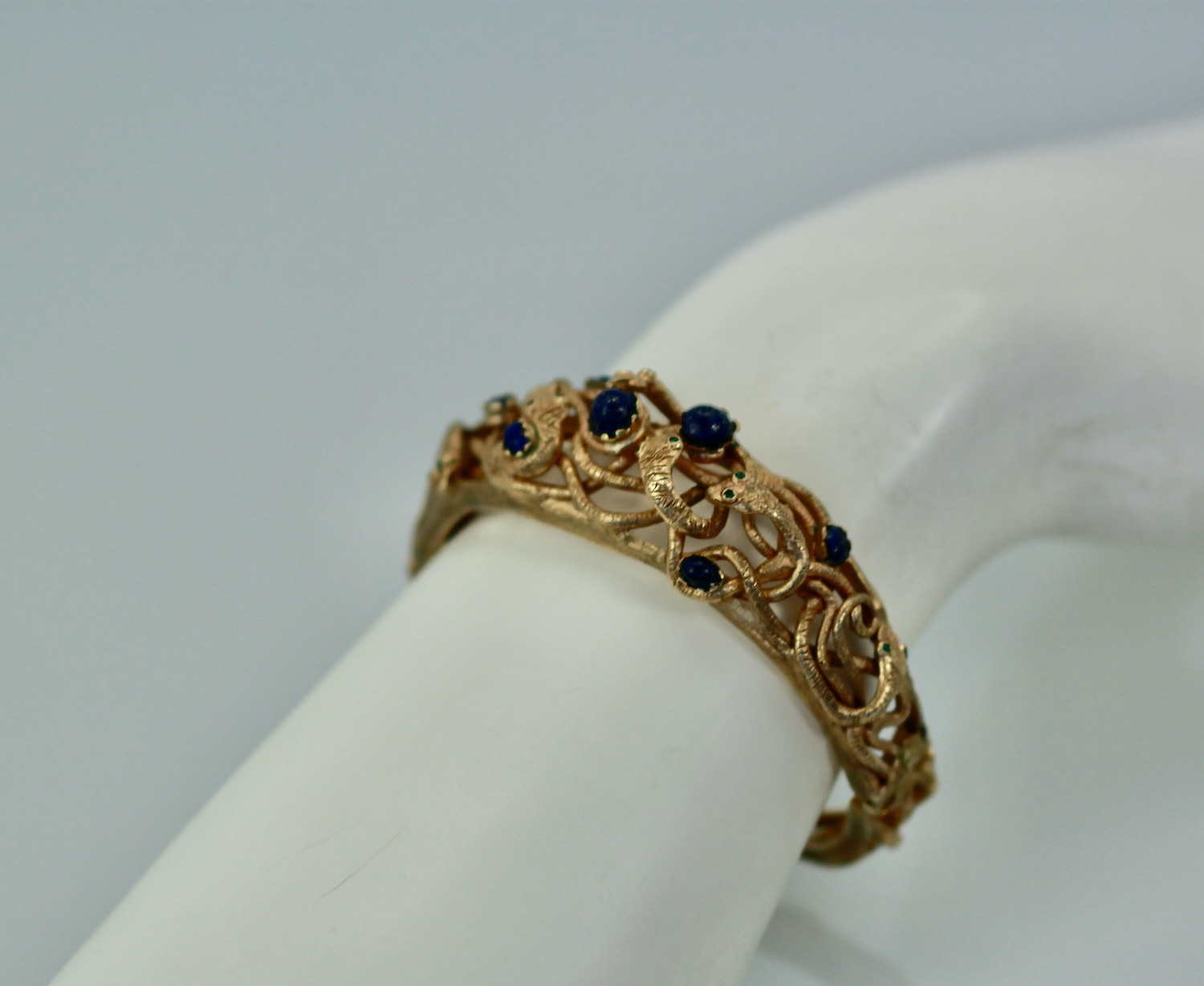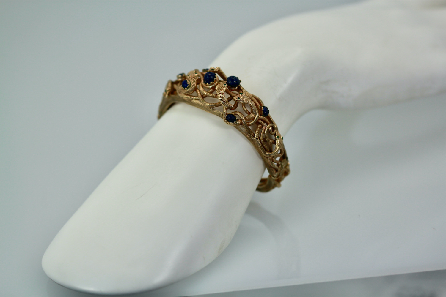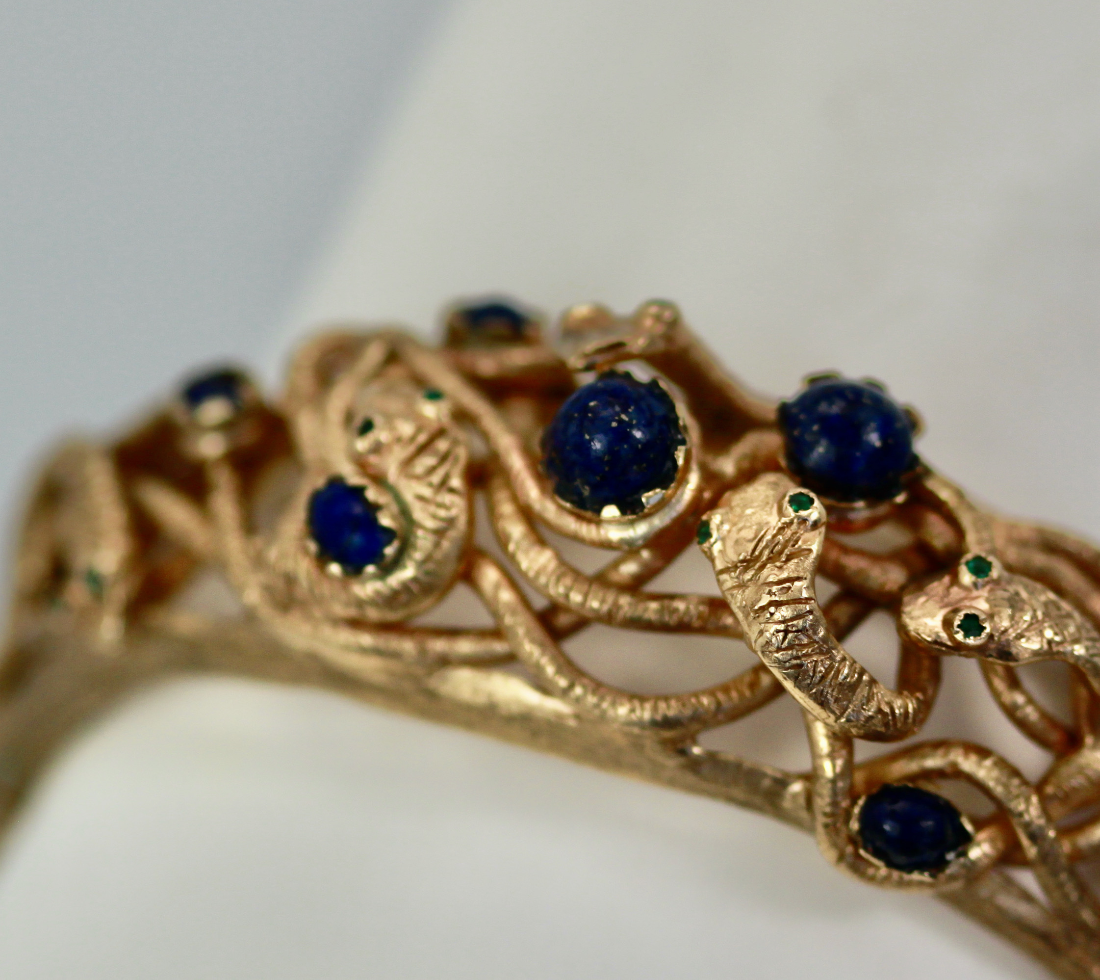 I own many snake bracelets and rings but this bracelet is special as I have never seen one quite like it. Most have one or two snakes but to see a bracelet with the entire front covered with snakes is a joy. This amazing snake bracelet is set with six small snakes going all around the front of this bracelet. The face and the back have detailed etched work with what looks like snake scales. Highly detailed these snakes have tiny Diamond eyes. In addition there are 7 Lapis stones that enhance the front of this bracelet. This bracelet is set with Lapis Lazuli in 14K Yellow Gold. The weight of this bracelet is hefty at 47.7 grams and fits a 6 to 7" wrist.