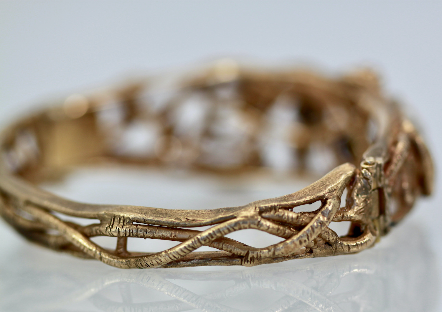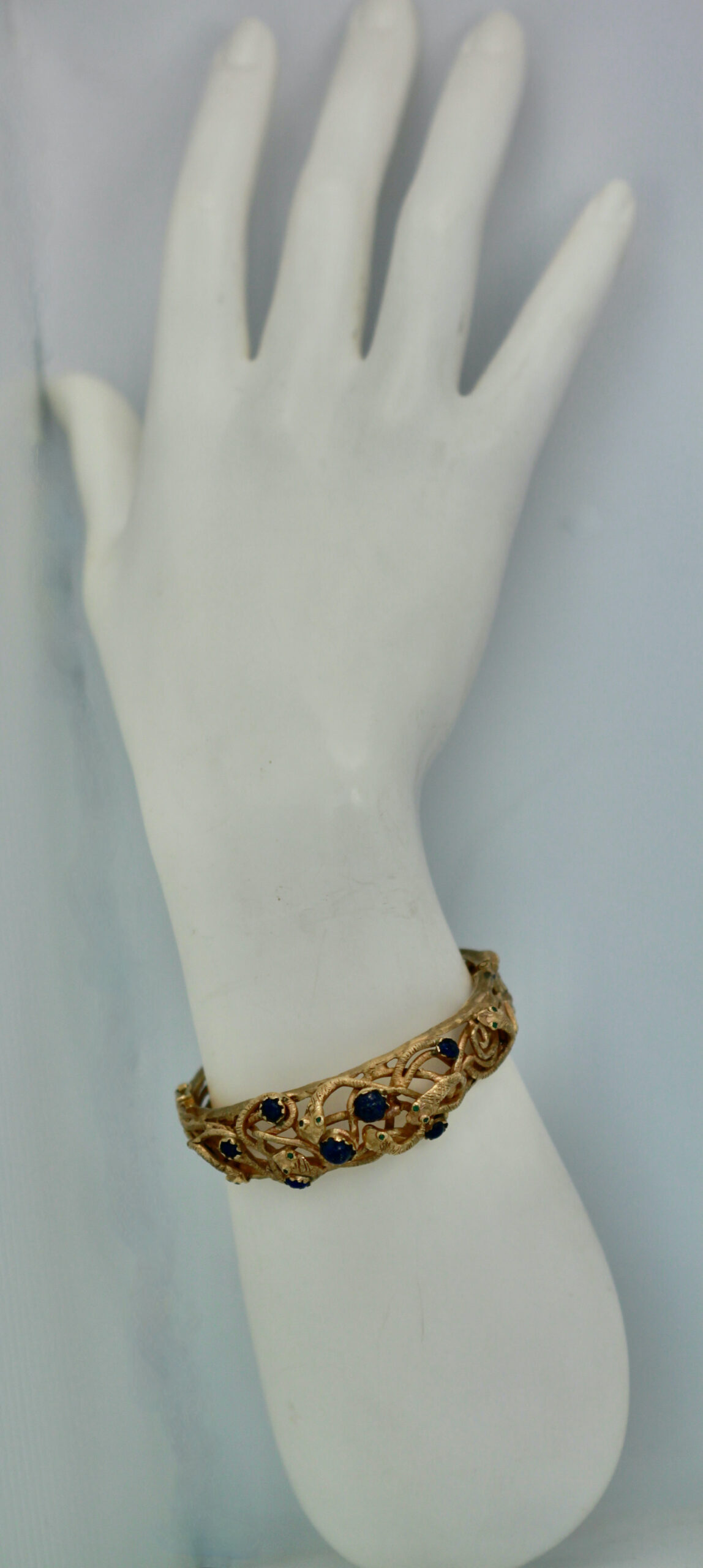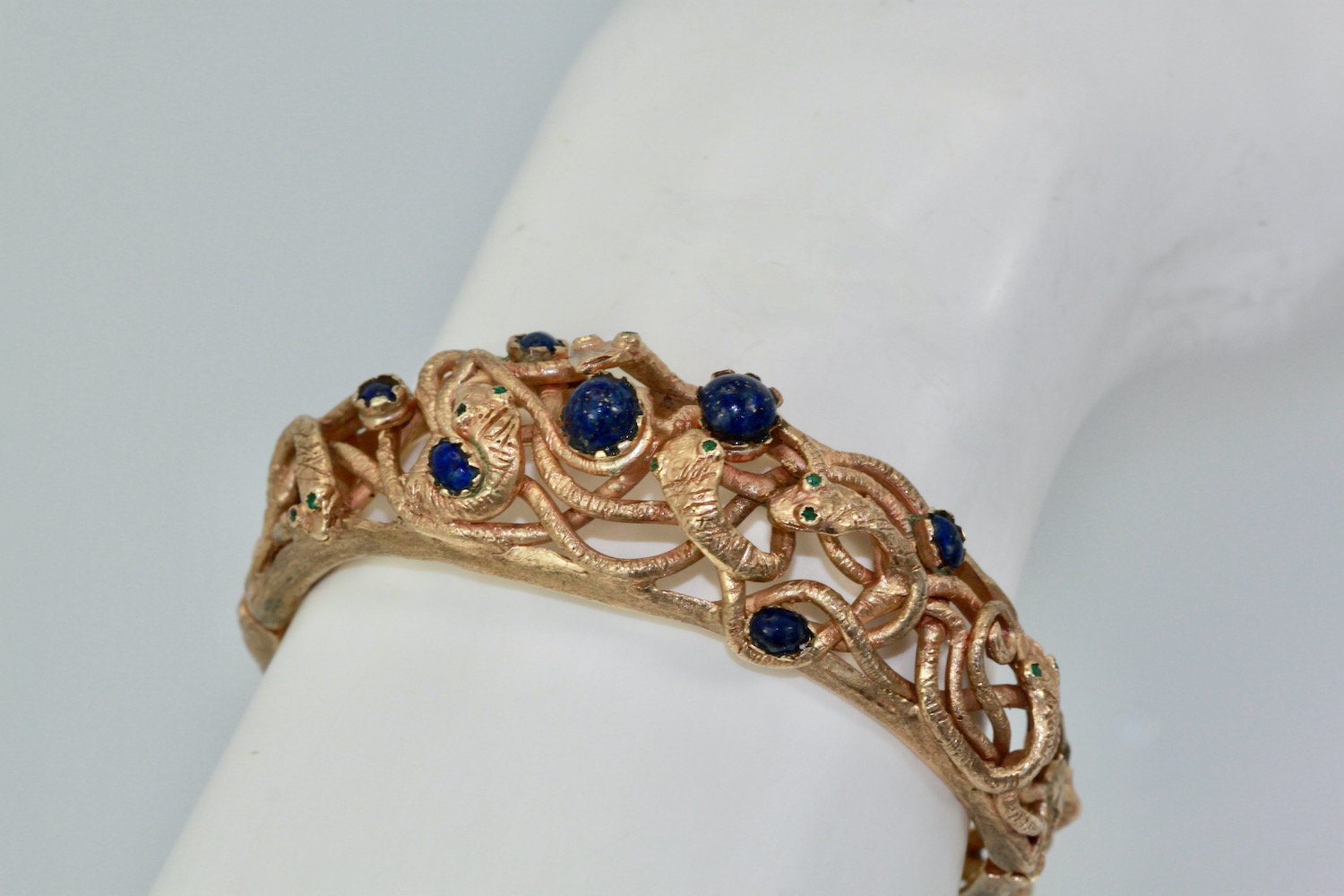 I own many snake bracelets and rings but this bracelet is special as I have never seen one quite like it. Most have one or two snakes but to see a bracelet with the entire front covered with snakes is a joy. This amazing snake bracelet is set with six small snakes going all around the front of this bracelet. The face and the back have detailed etched work with what looks like snake scales. Highly detailed these snakes have tiny Diamond eyes. In addition there are 7 Lapis stones that enhance the front of this bracelet. This bracelet is set with Lapis Lazuli in 14K Yellow Gold. The weight of this bracelet is hefty at 47.7 grams and fits a 6 to 7" wrist.