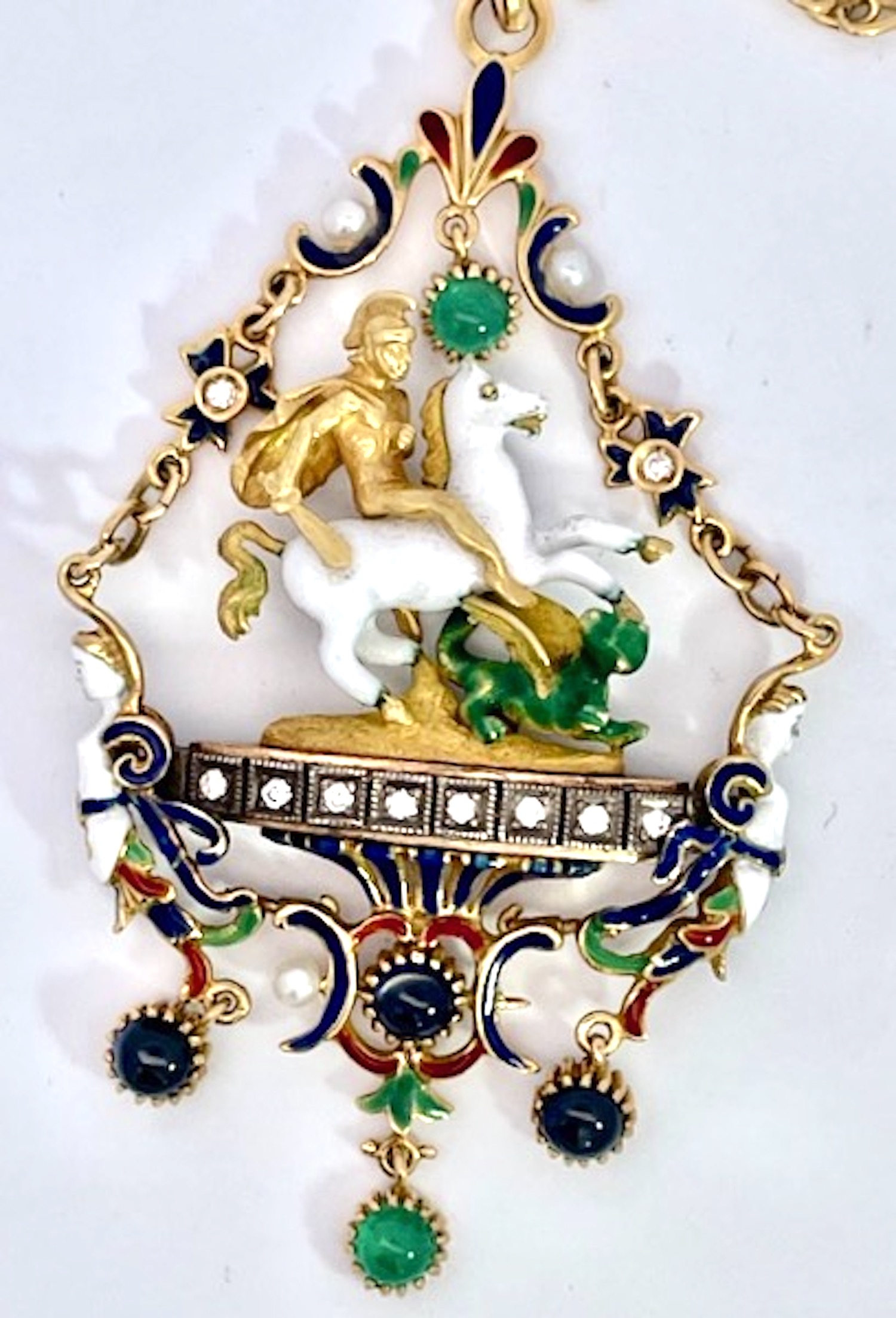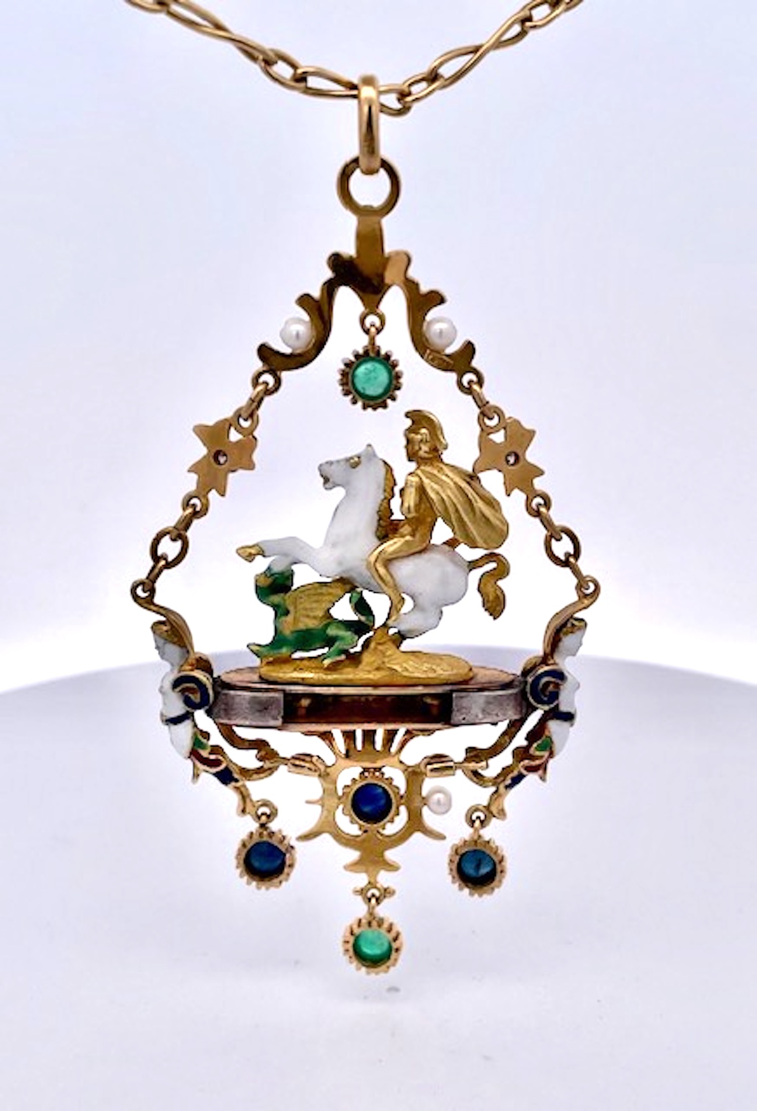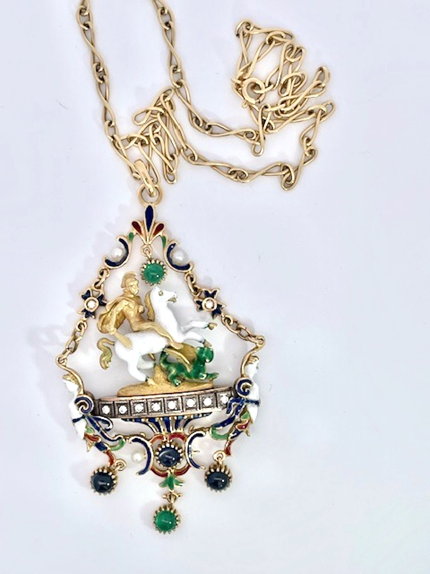 This piece is rare and special. I have only seen 3 of these pendants in my lifetime and I owned two of them. This is my last one. St George Slaying the Dragon is a common theme but most are done in silver this is 18K Yellow Gold. The enamel is almost perfect very very little enamel loss and this pendant is special. I put it on a special chain but you can put it on any chain you like.